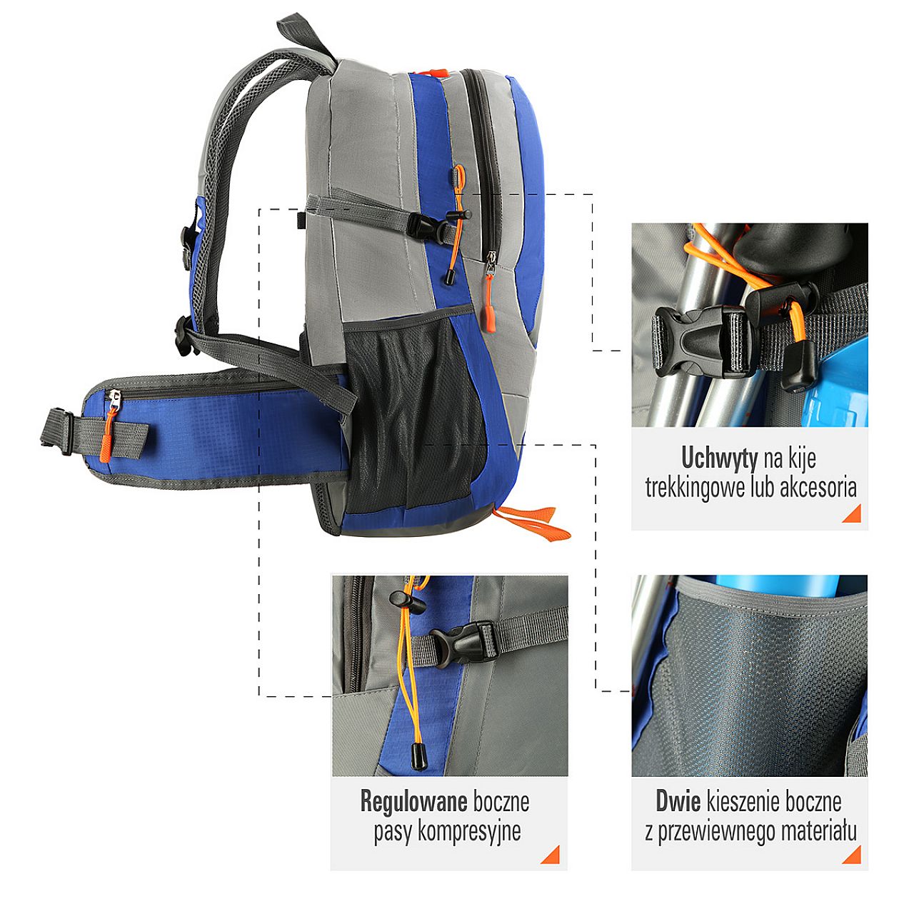 З обох боків рюкзака є регульовані тримачі трекінгових палиць.