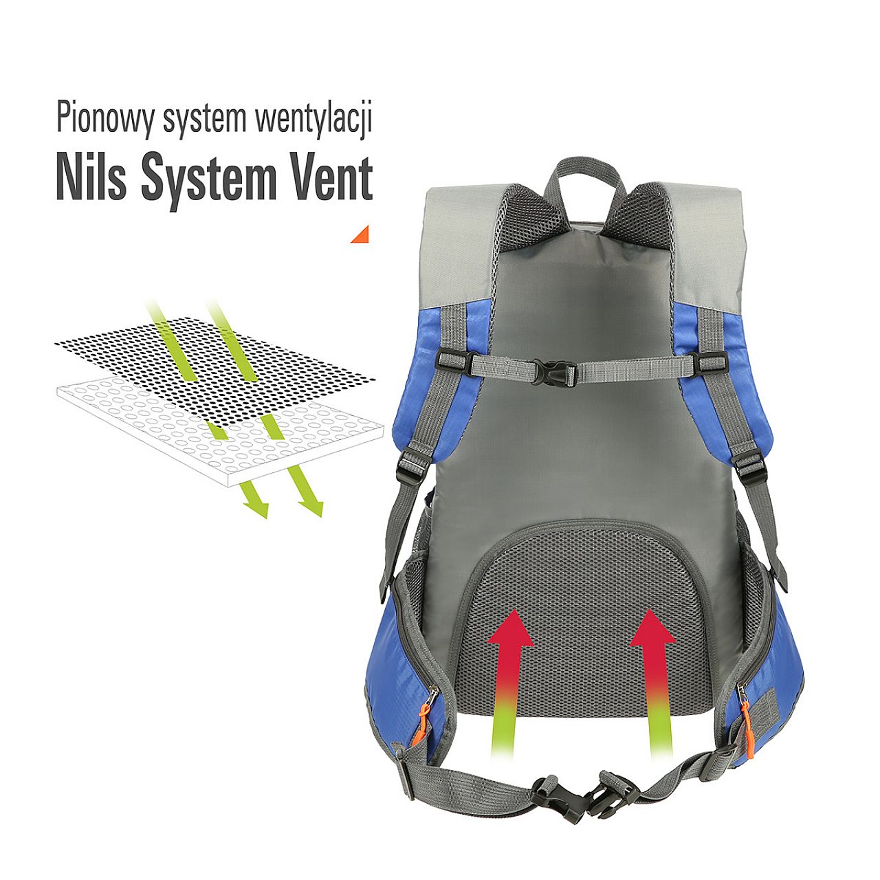 Завдяки системі Nils Vent System довгі походи не проблема. Задня панель, лямки і стегновий ремінь оброблені спеціальною сіткою, завдяки якій тіло не має прямого контакту з матеріалом, що позитивно впливає на правильний кровообіг і перешкоджає потовиділенню.