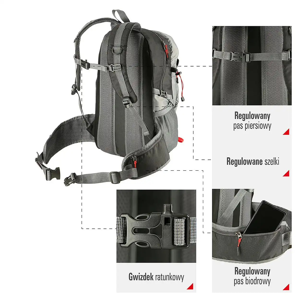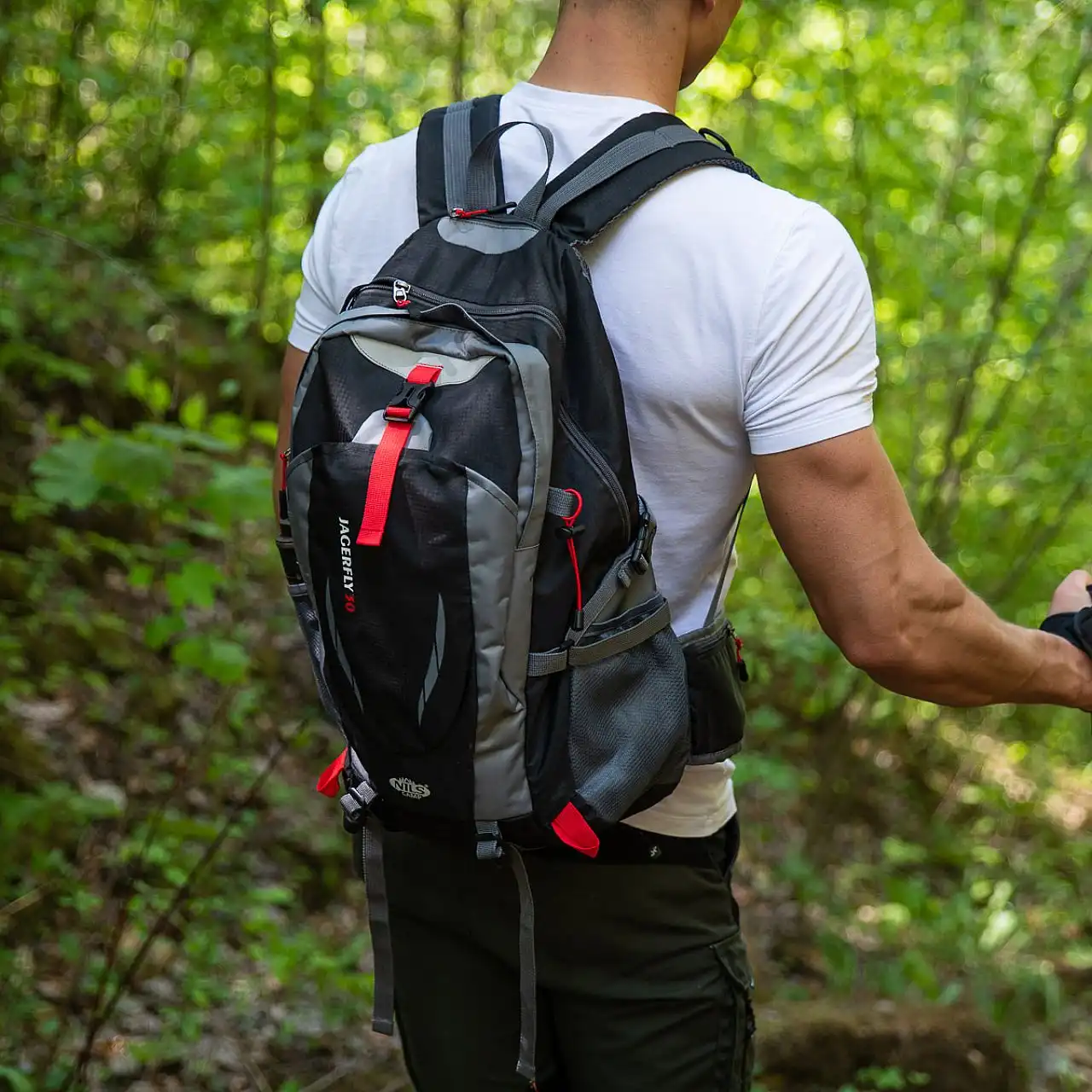 Рюкзак оснащений стегновим і нагрудним поясом, який розвантажує хребет, значно покращуючи комфорт використання та зменшуючи біль у спині. Крім того, модель JAGERFLY має бокові та нижні компресійні лямки, завдяки яким ми можемо зменшити або збільшити місткість рюкзака.