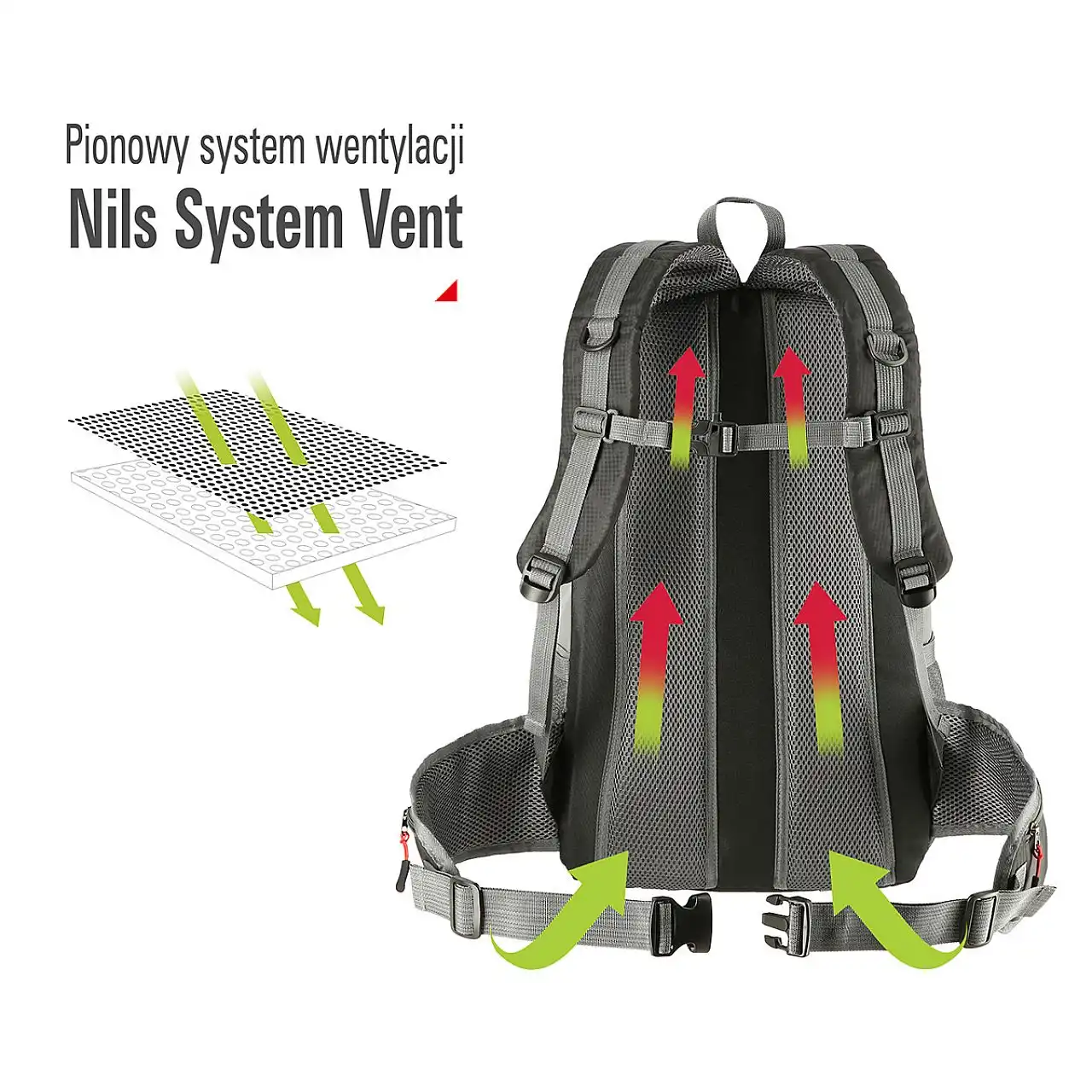 Завдяки системі Nils Vent System довгі походи не проблема. Задня панель, лямки і стегновий пояс оброблені спеціальною сіткою, завдяки якій тіло не контактує з матеріалом, що позитивно впливає на правильний кровообіг і перешкоджає потовиділенню.
