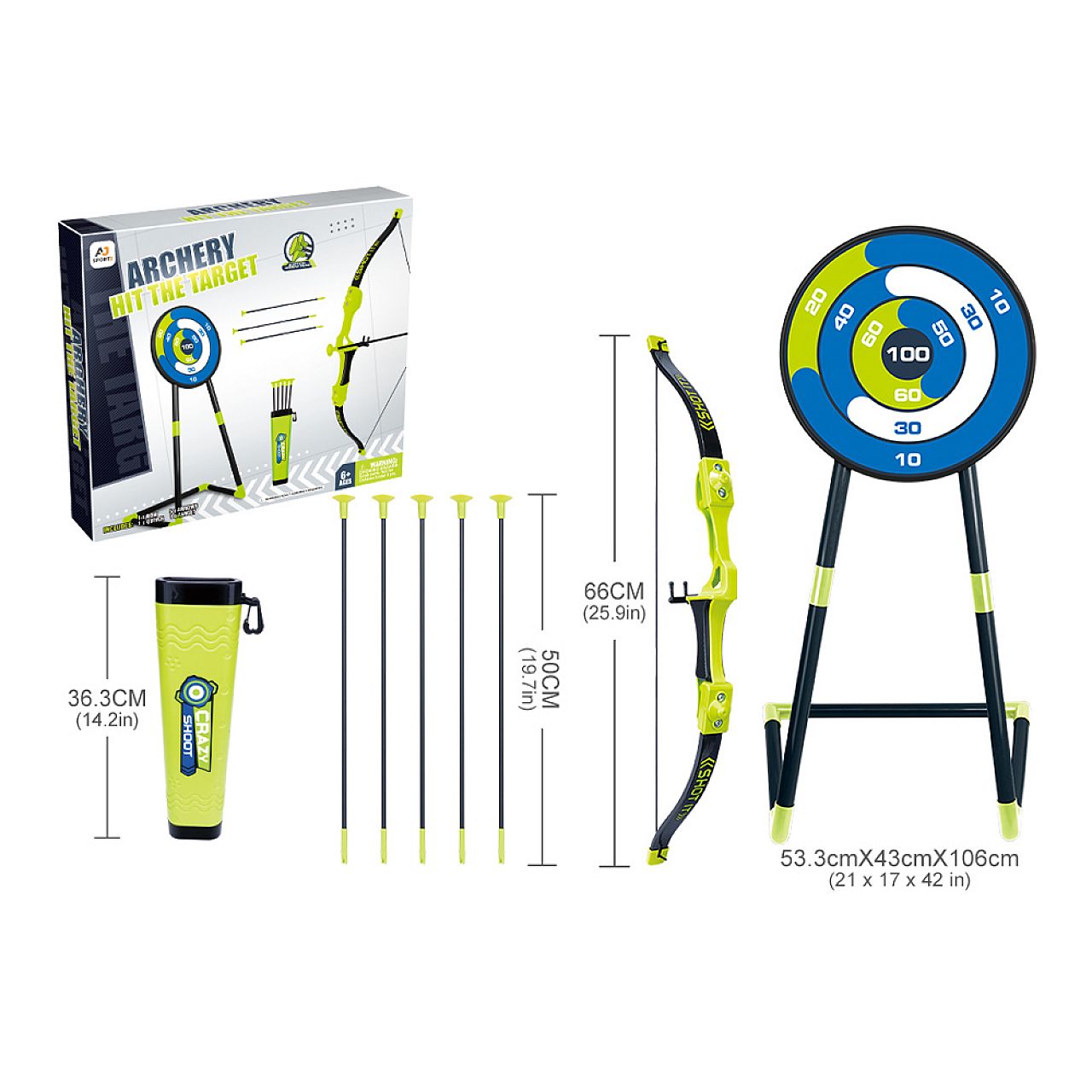 Мішень , яка може стояти окремо або повіситися на стіну, дозволяє займатися як у приміщенні, так і на вулиці. Лук був розроблений для зручного захоплення та стабільності , що полегшує дітям вивчення основ стрільби з лука. Наконечники стріл мають присоски, щоб ваша дитина не поранила себе, не розбила вікно чи інші предмети.