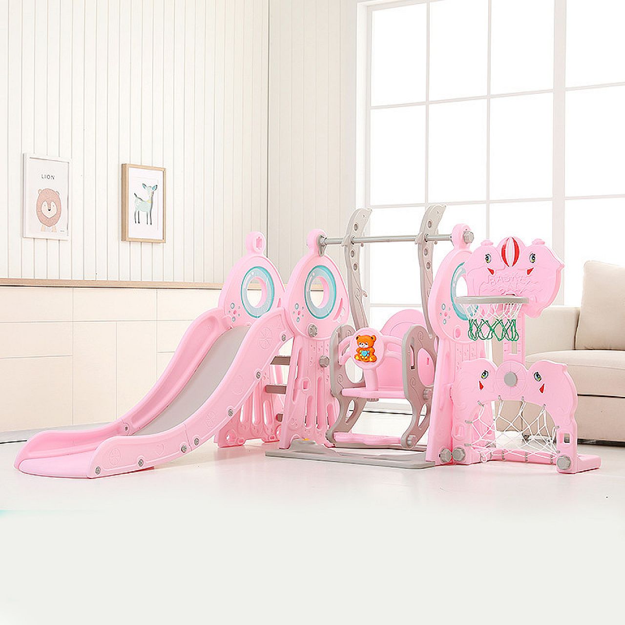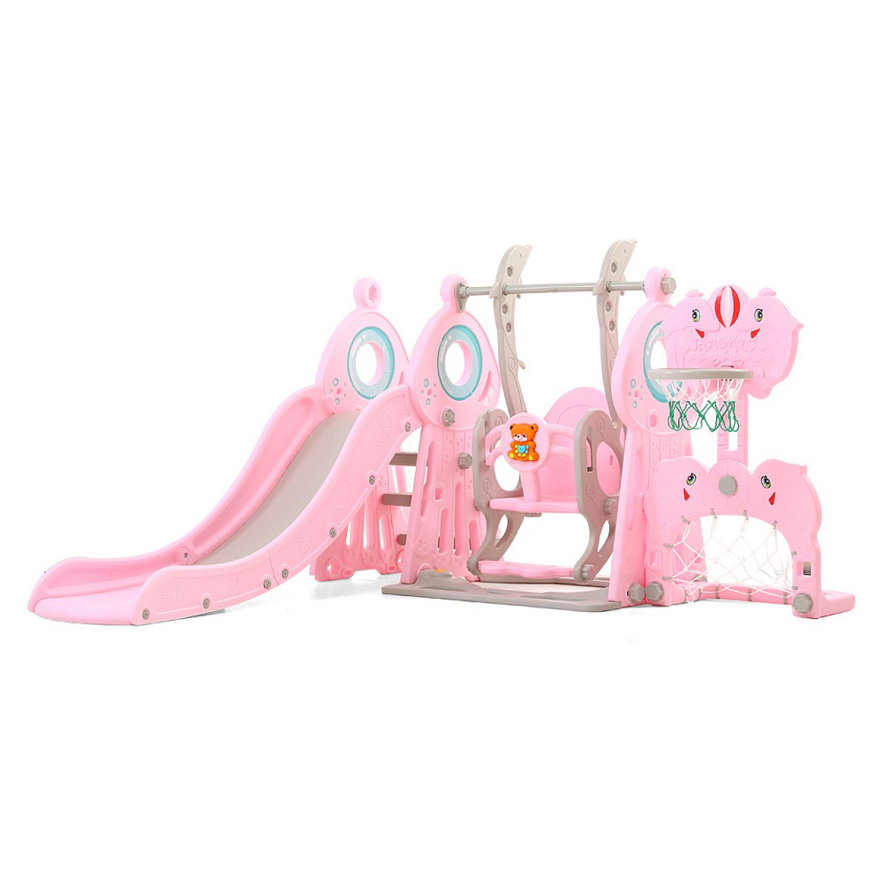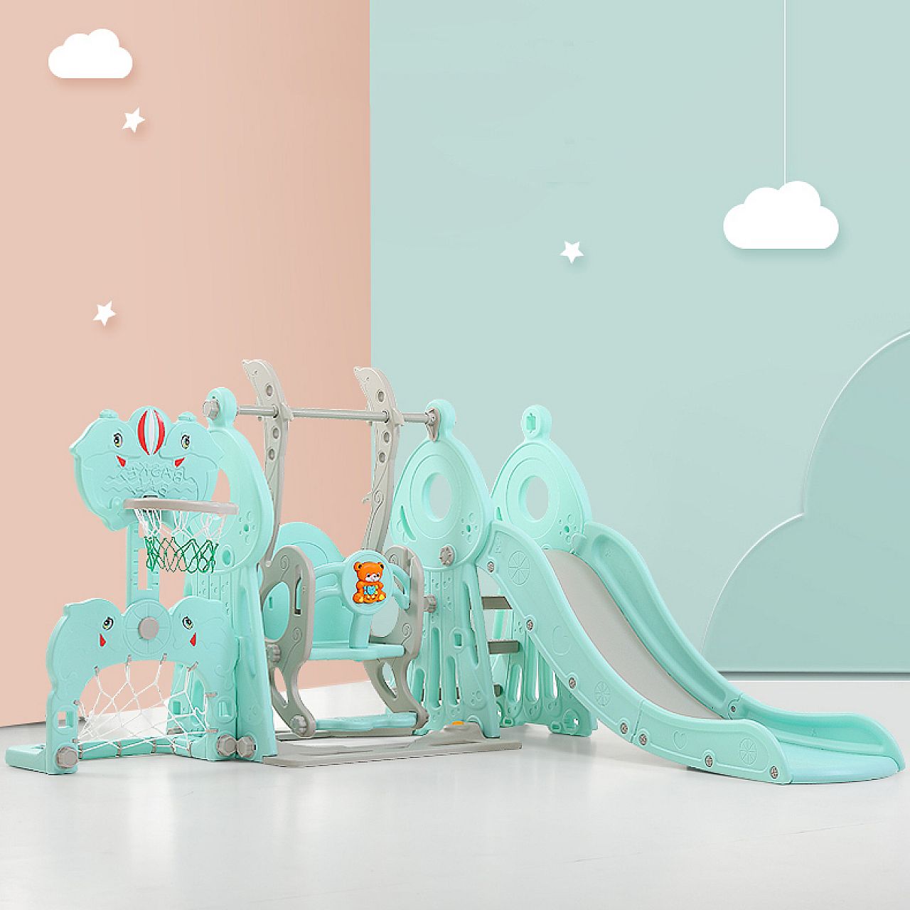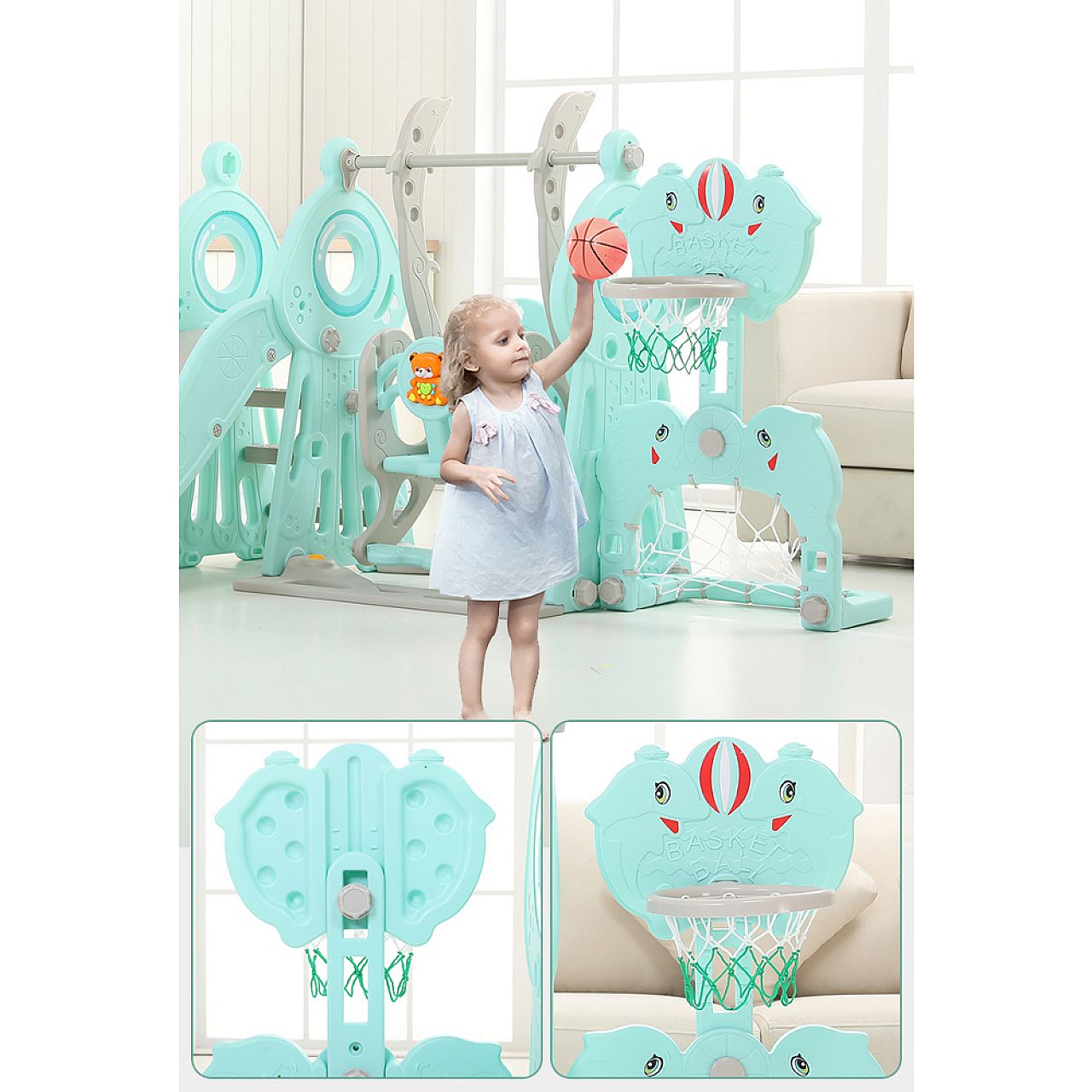 Розроблений для дітей віком від 1 до 10 років , продукт не має гострих країв, кутів або виступів. Гірка та баскетбольне кільце регулюються по висоті , тому вони можуть рости разом з вашою дитиною. І драбина-гойдалка, і перила мають форму, щоб ними було зручно користуватися дітям. І якщо ви відчуваєте, що основа повинна бути трохи більш стійкою, ви можете наповнити її водою . Ця багатоцільова красуня розважатиме ваших малюків пару років!