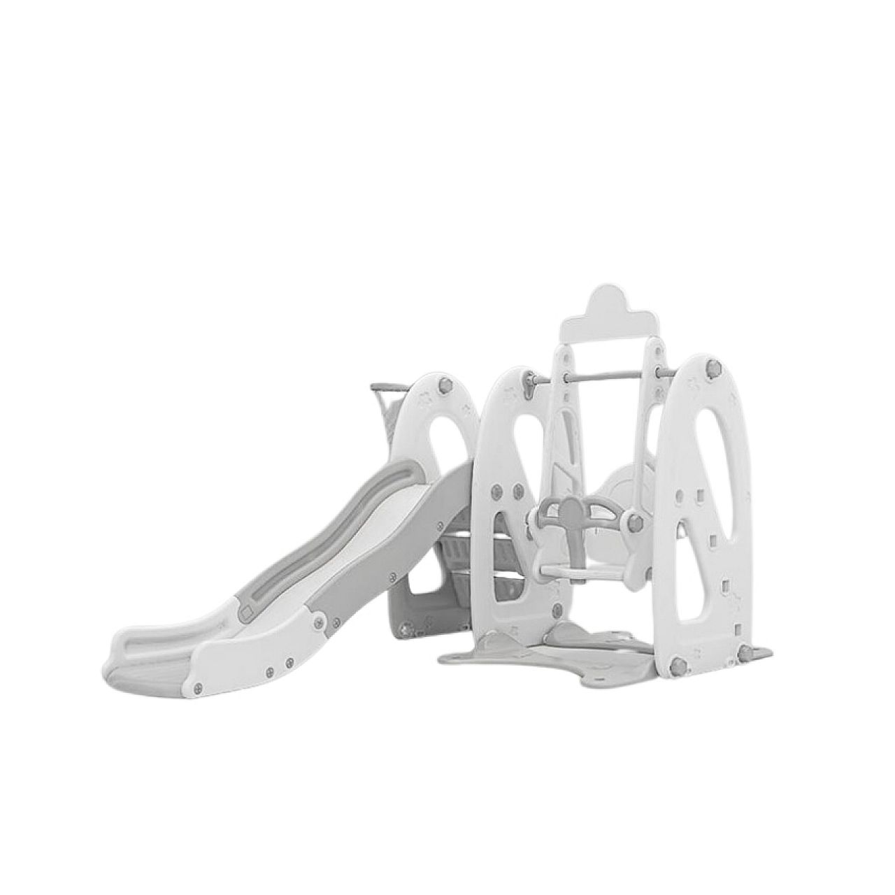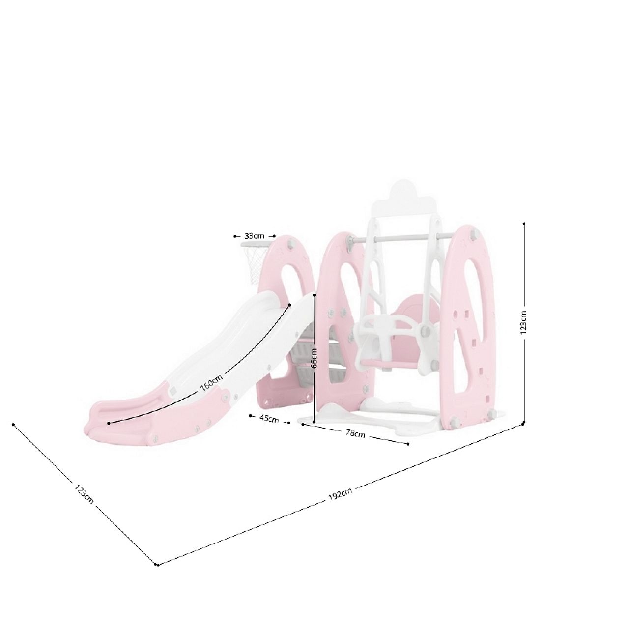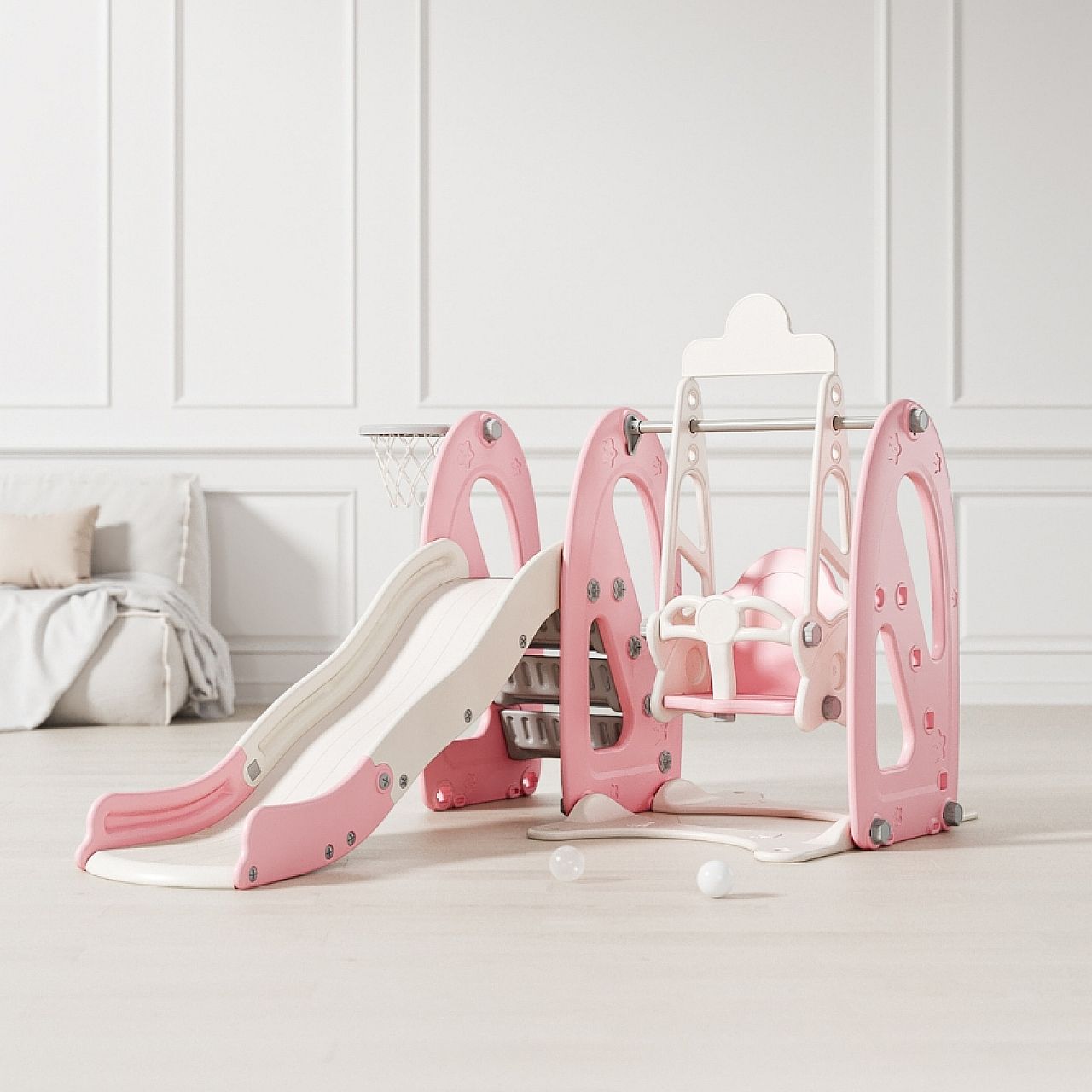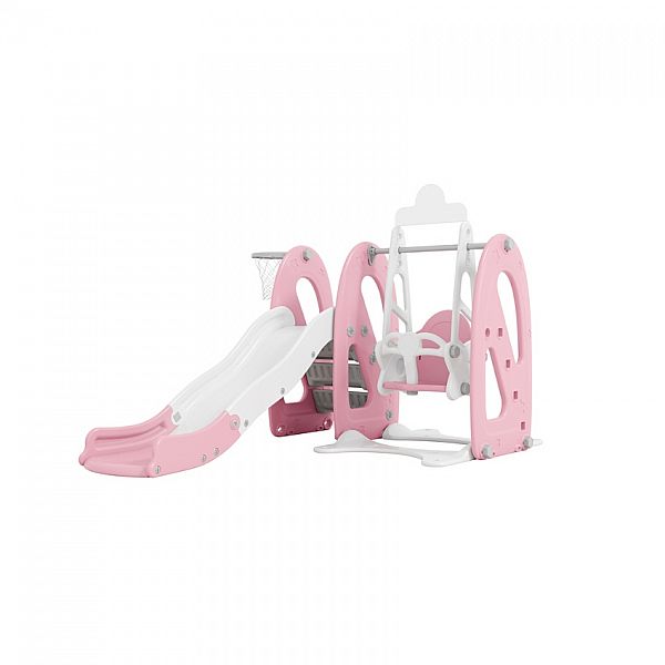 Комбінація гірки, гойдалки та баскетбольного кільця не тільки сприятиме розвитку дитини , але й займе її годинами , щоб вона могла грати , навіть якщо надворі йде дощ .