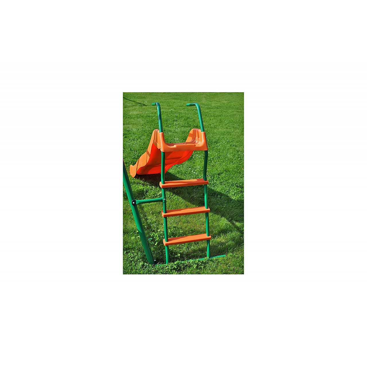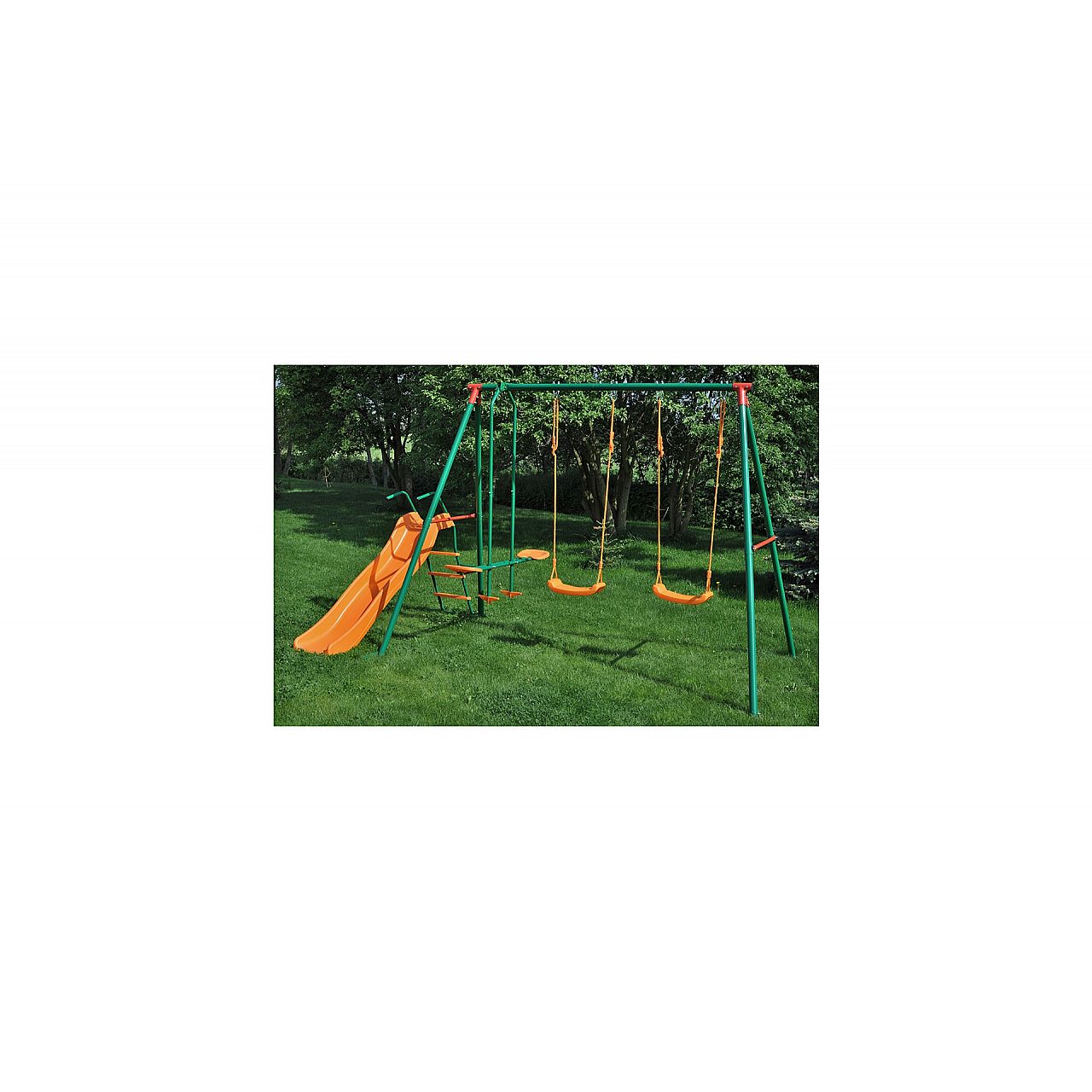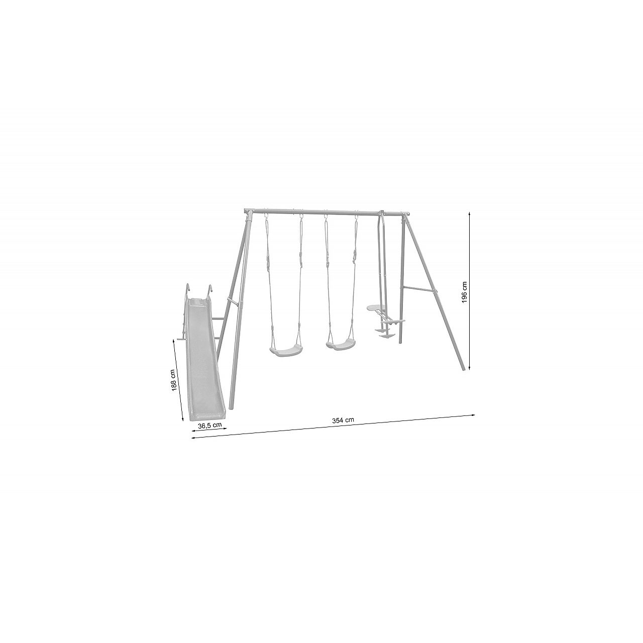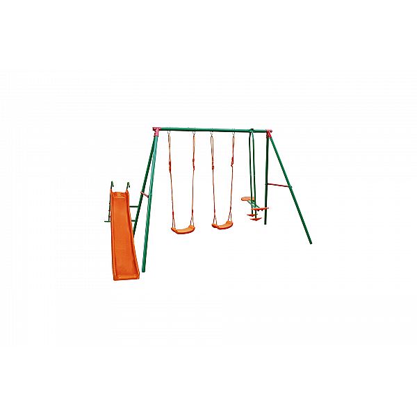 Повний | сталева трубчаста конструкція, сидіння х 2, подвійна лавка х 1, гірка з драбиною х 1, комплект монтажних гвинтів, анкери для кріплення до землі |