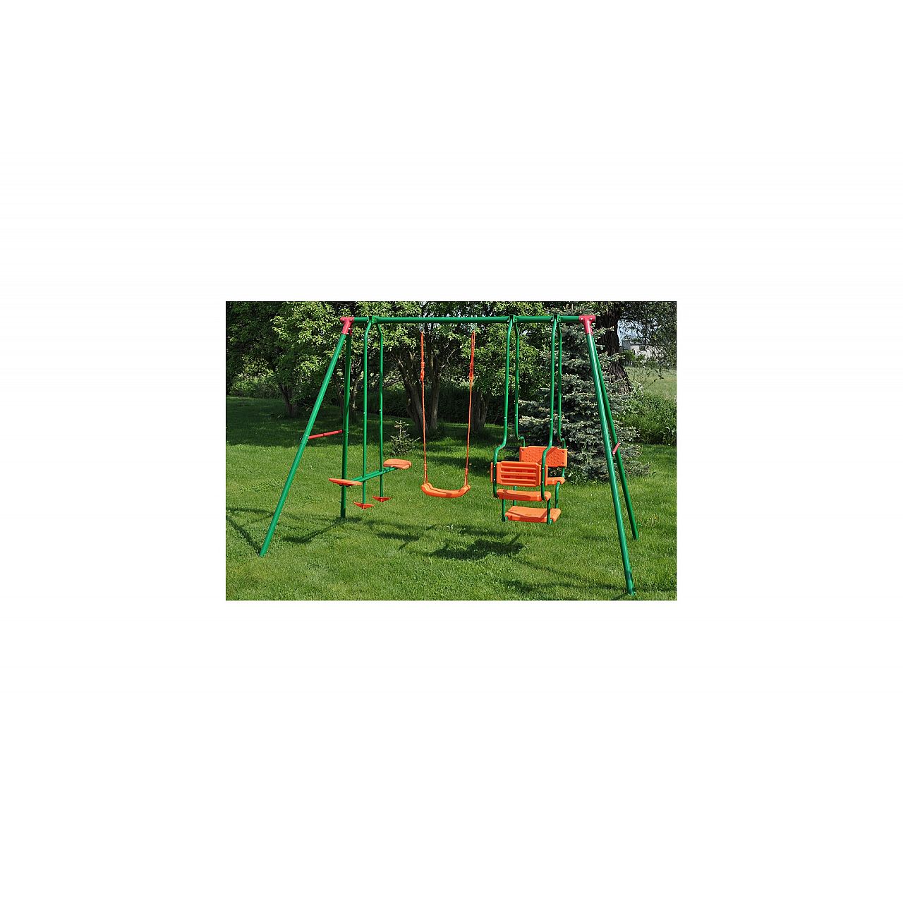 Дитячі садові гойдалки розраховані на 1 - 5 дітей. Ігровий майданчик для дітей старшого віку 3-10 років. Дитячі майданчики виготовлені з металевих труб, пофарбованих високоякісною порошковою фарбою. Вся справа призначена для самостійної збірки. У комплект входять спеціальні кріплення для кріплення гойдалок. Усі гойдалки та аксесуари мають маркування CE.
