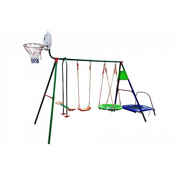 Повний | сталева трубчаста конструкція, сидіння х 1, подвійна лавка х 1, гніздо лелеки х 1, батут х 1, баскетбольний щит х 1, комплект монтажних гвинтів, анкерні кріплення для землі |