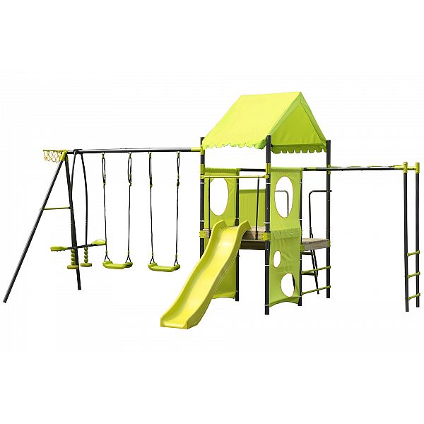 Повний | конструкція зі сталевих труб, сидіння x 2, подвійна лавка x 1, гірка з драбиною x 1, драбина для лазіння x 1, комплект монтажних гвинтів, анкерні кріплення для землі |