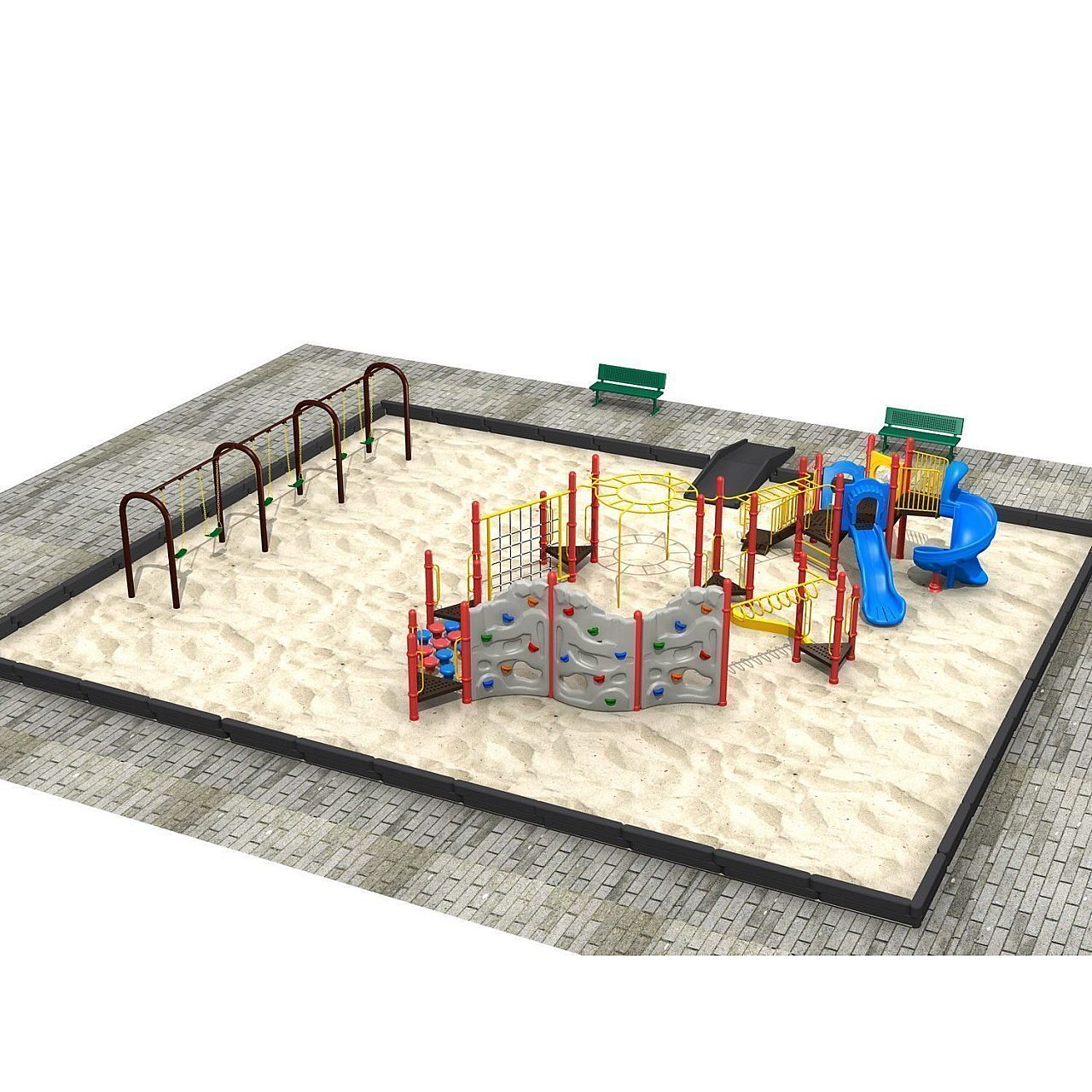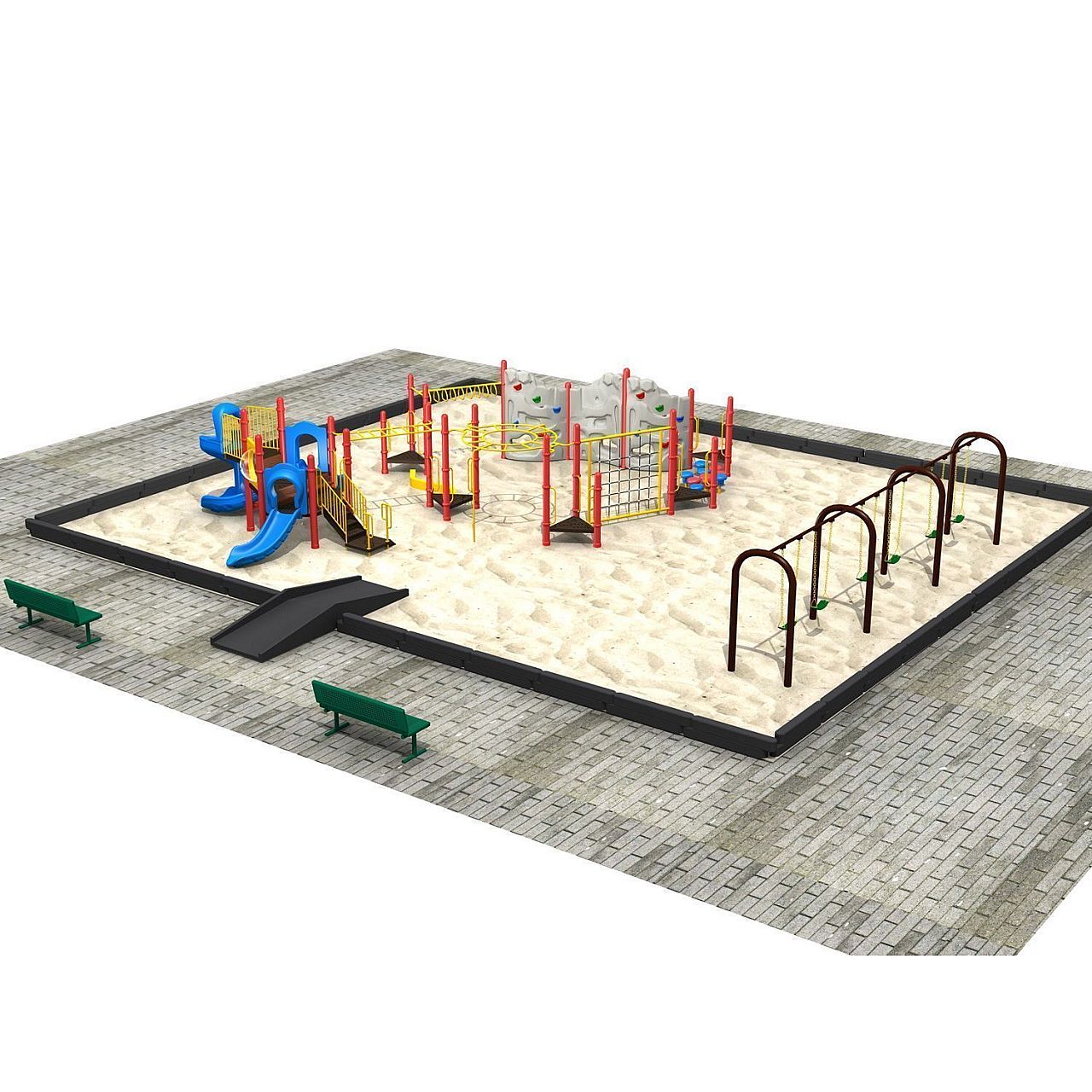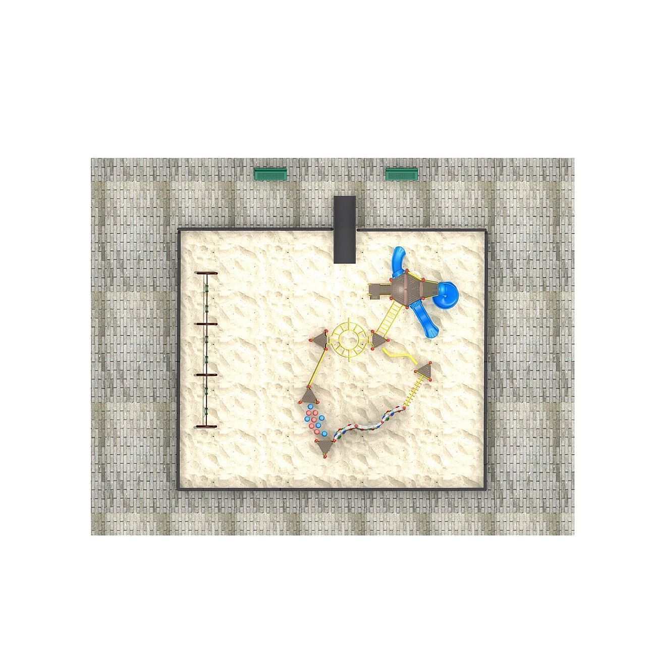 Ми рекомендуємо забезпечити буферну зону шириною 1,5 м по всьому периметру конструкції дитячого майданчика для забезпечення максимального комфорту та безпеки дітей, які грають на такому майданчику.