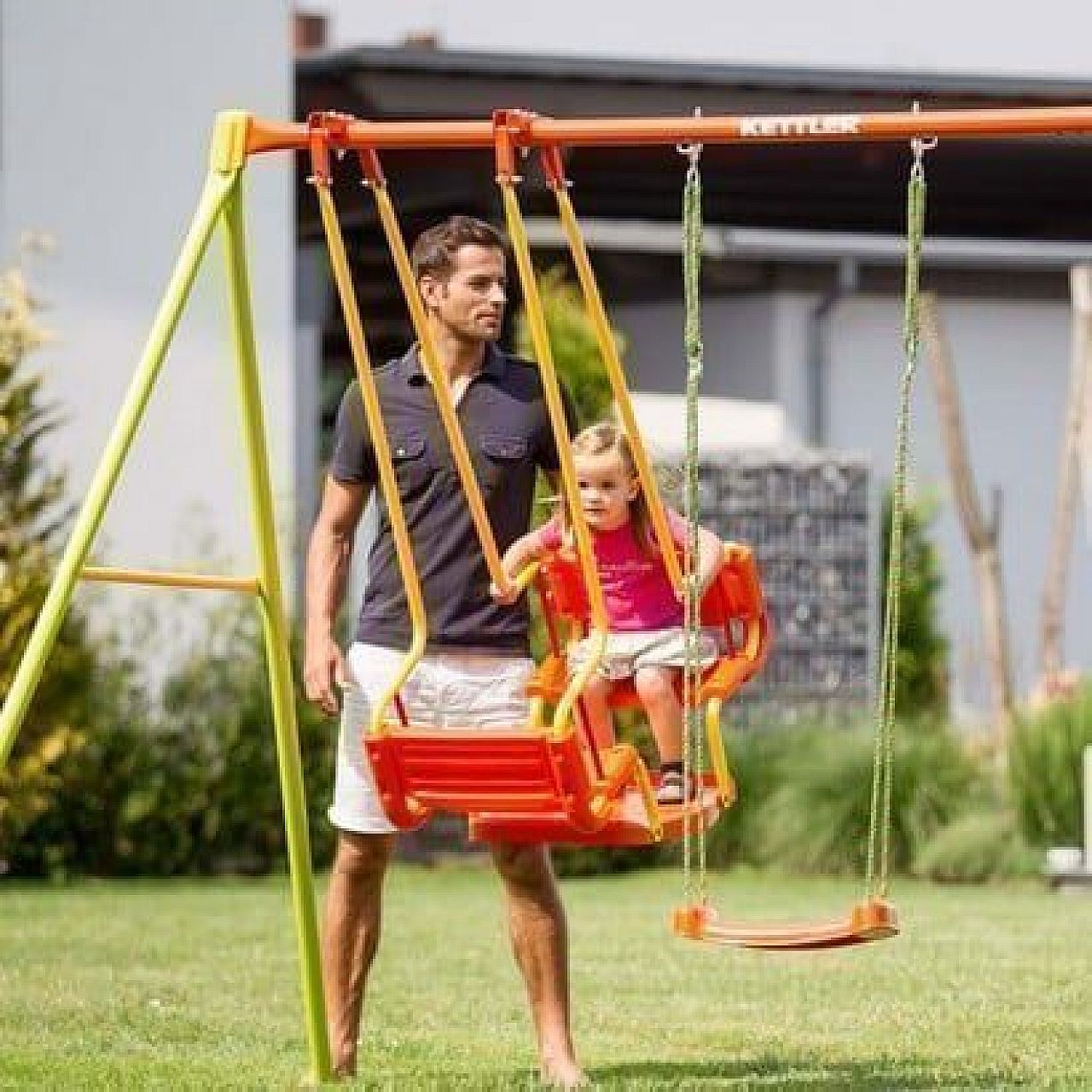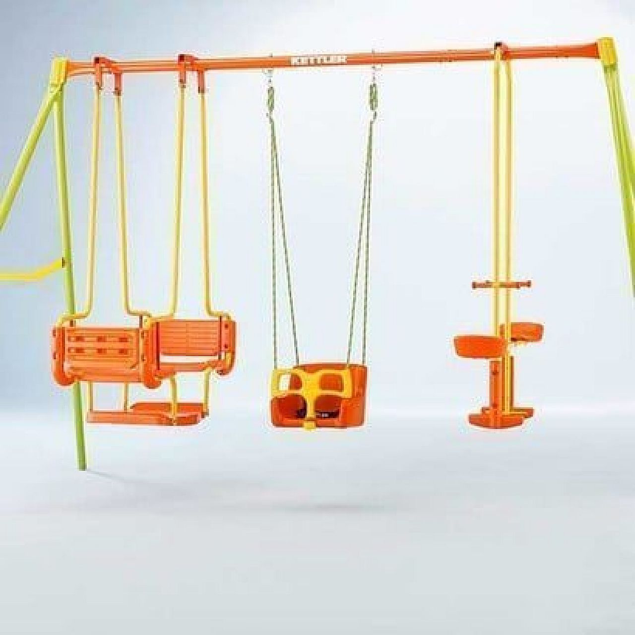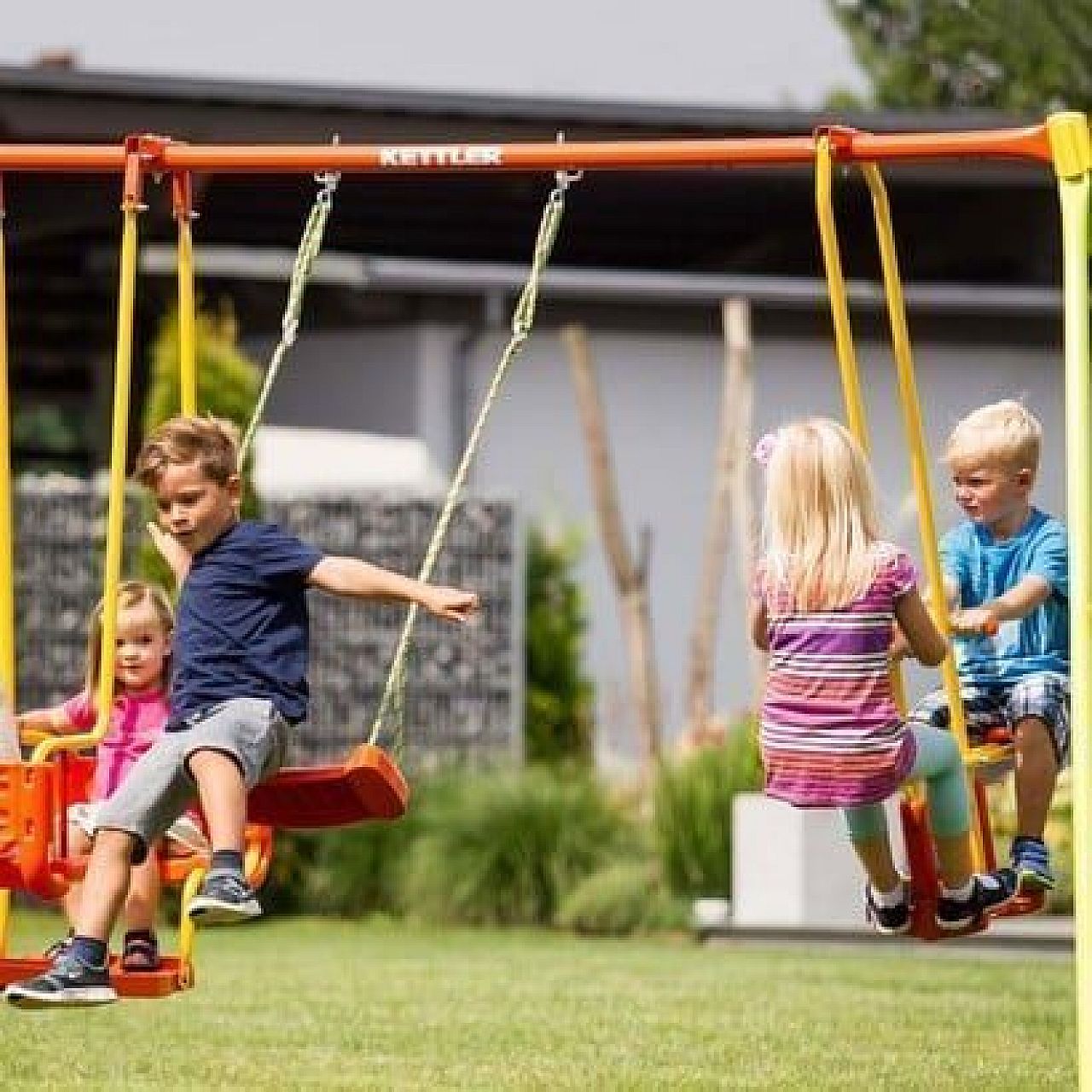 Дитячі гойдалки Kettler - це найбільші та найбільш місткі вуличні гойдалки. Три різні підвіски загалом із п'ятьма посадковими місцями - ось уже де роздолля для маленьких непосид! Там, де розташуються ці вуличні гойдалки, завжди лунатиме дитячий сміх. А розташовуватись вони можуть і на вуличному дитячому майданчику, і на Вашій особистій дачі. Вуличні дитячі гойдалки включають в комплектацію одномісну сидіння-дошку - всім відомий класичний вид гойдалок, двомісну гойдалку Вершник із зручними підніжками та ручками, а також двомісне сидіння Гондола у вигляді своєрідного човника. Спинки, сидіння, ручки та опори для ніг зроблені з високоміцного пластику та захищені протиковзким профілем. А форми сидінь немає гострих кутів. Система кріплення така, що передбачає можливість модифікації цих дитячих гойдалок. Щоправда, сидіння з обмежувачем для зовсім маленьких у базовий комплект не входить і купується додатково. Гойдалки для дачі виготовлені із міцних сталевих труб. Стійки вкриті поліестером, що не вигорає, який зберігає початковий колір гойдалок і захищає їх від подряпин. Збірна конструкція дуже зручна для транспортування дитячих гойдалок. У комплект також включені анкери для бетонування стояків. Це дуже важливо для стійкості гойдалки та, відповідно, безпеки Ваших дітей.