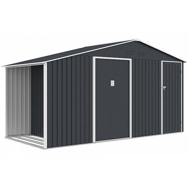 Ви можете розмістити будинок у саду, щоб отримати ідеальне місце для інструментів і деревини. Дизайн відрізняється універсальним кольором. Сіра модель буде добре виглядати на вашій ділянці незалежно від відтінку фасаду вашого будинку. Маленьке віконце впустить трохи світла в інтер'єр. Будинок для інструментів з дровітницею оснащений вентиляційними отворами, які забезпечують циркуляцію повітря.