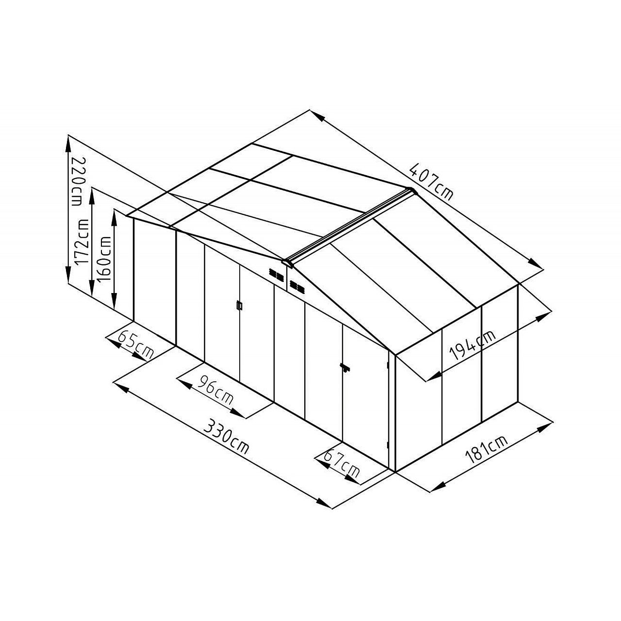 Ваш власний будиночок для інструментів, розташований в саду поруч з будинком, є ідеальним місцем для майстрування, зберігання інструментів, обладнання та садових меблів. Чи розглядаєте ви будівництво такого типу? Познайомтеся з нашим міцним дизайном будинку Bergen, 407 x 194 см, виготовленого з оцинкованого сталевого листа, стійкого до мінливих погодних умов. Вічний і універсальний сірий колір підходить до багатьох фасадів і ідеально доповнює будинок.