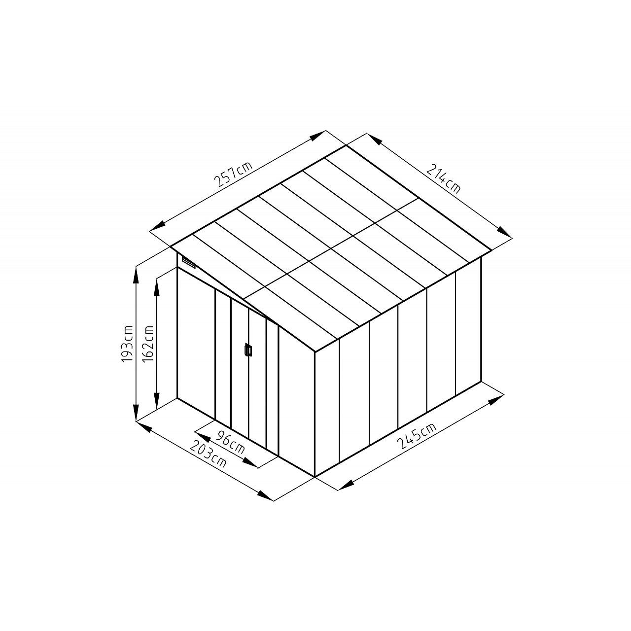 Розміри з дахом (ширина х довжина х висота) | 214 см х 257 см х 193 см |