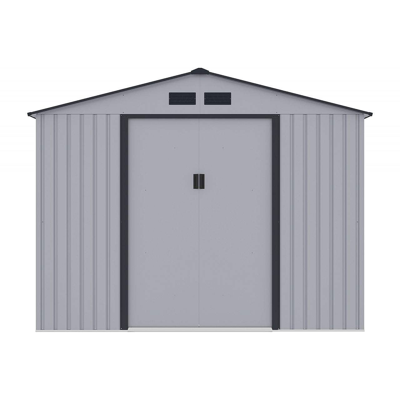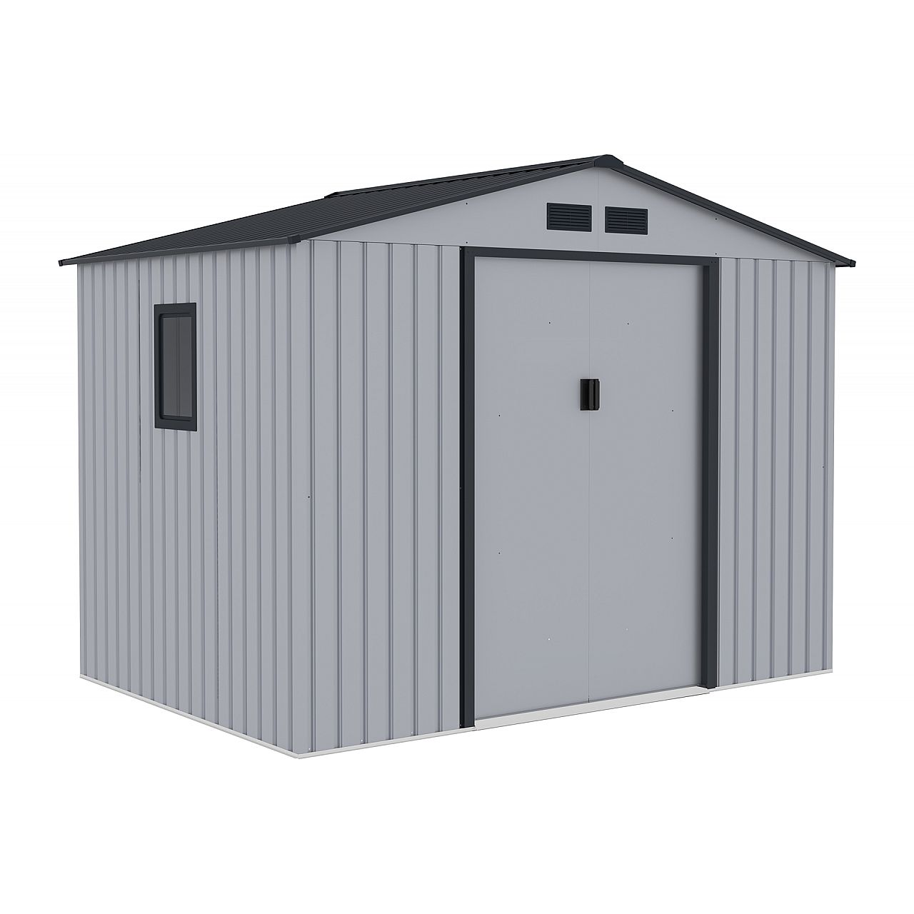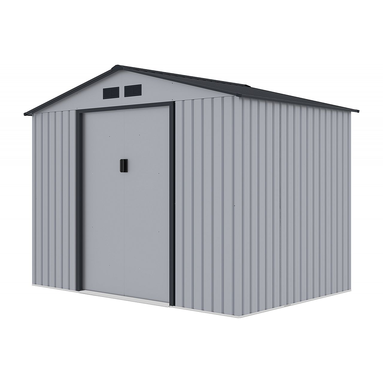 Світло-сірий садовий будиночок Oslo з листового металу оснащений двостулковими розсувними дверима. На них можна встановити навісний замок, щоб конструкція захищала речі від крадіжки. Ви самі вирішуєте, за якою ознакою будете облаштовувати будинок. Серед них може бути тротуарна плитка.