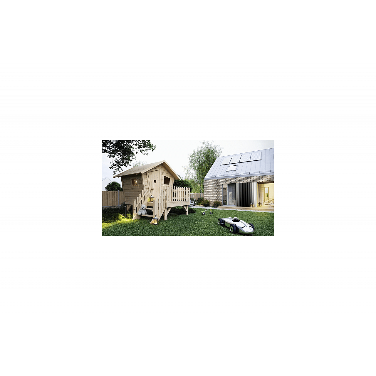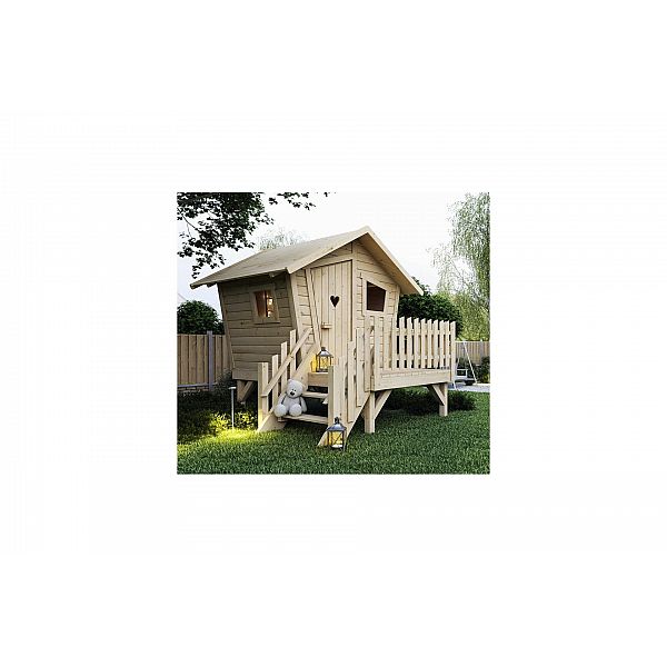 Дитинство – прекрасний і безтурботний період у житті кожної людини. Подаруйте своїй дитині радість у вигляді чарівного будиночка, повністю зробленого з дерева. Інтер’єр цієї невеликої будівлі – це 1,1 м² неймовірних розваг. Будинок має двері з ручкою та декоративним вирізом, який додає шарму всій конструкції. Два віконних прорізи пропускають свіже повітря та сонячне світло, що позитивно впливає на неповторну атмосферу в цьому чарівному просторі. Покрівля виконана з асфальтового повсті, який чудово захищає від негоди. Вся конструкція базується на палях, які забезпечують міцну стабілізацію та безпеку використання.