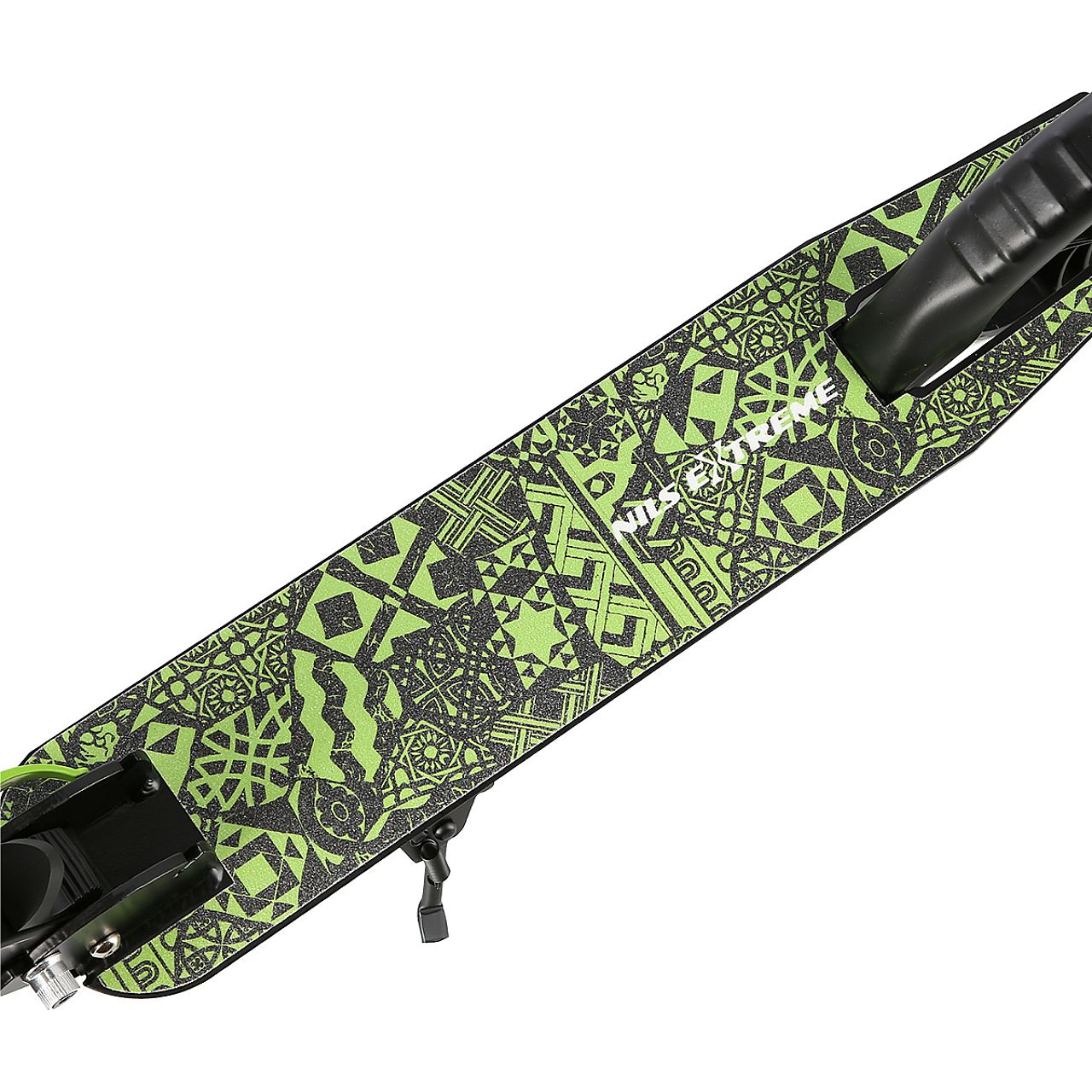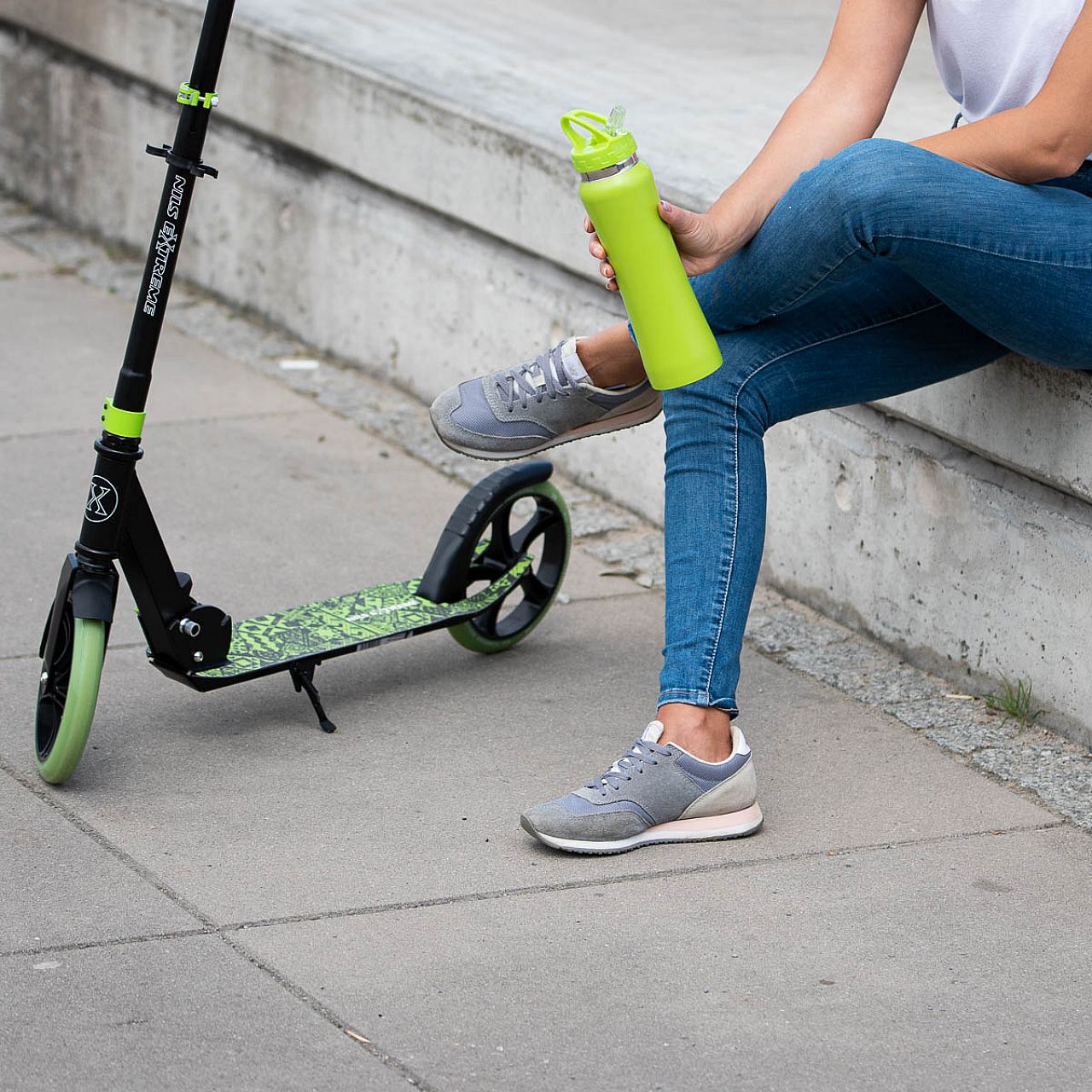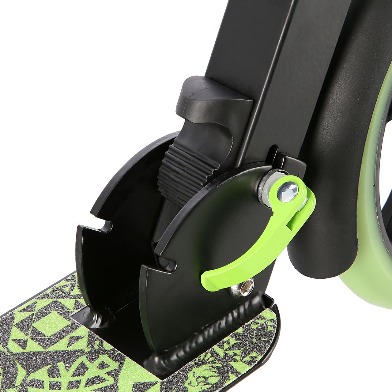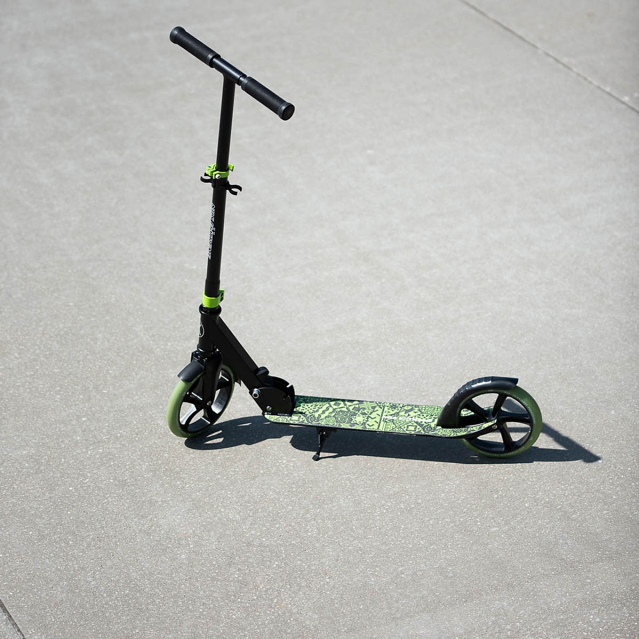 Самокат оснащений ножним гальмом, що гарантує швидке і легке гальмування під час їзди. Безпеку виробу також підвищують бризковики, які запобігають бризкам, і нековзка платформа, яка гарантує стабільне положення за кермом. Крім того, кермо оснащено прогумованими ручками, які забезпечують надійний хват і не викликають потертостей.