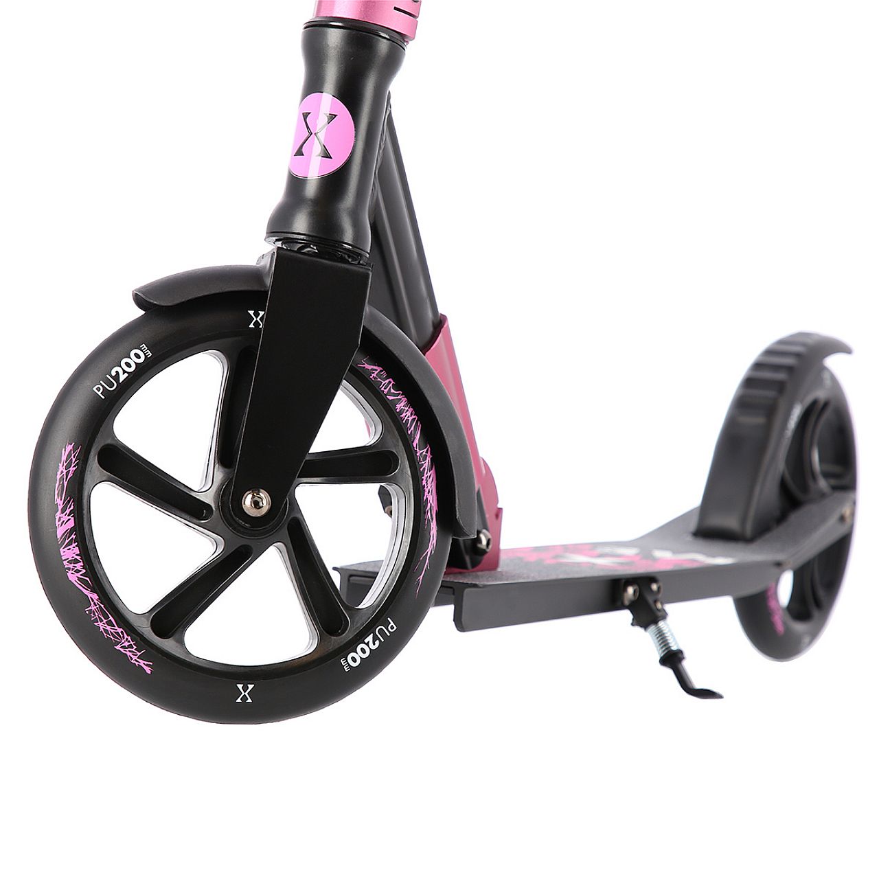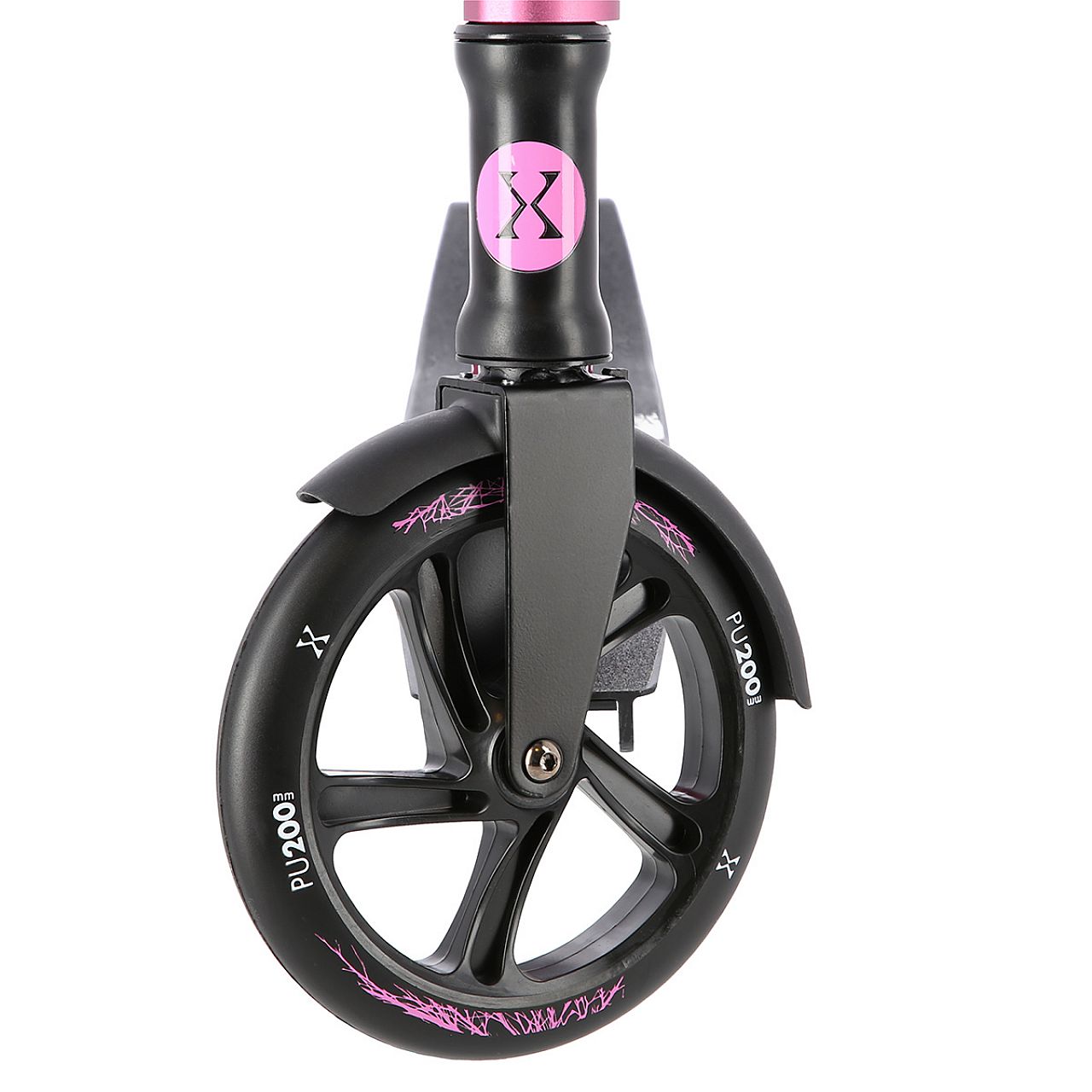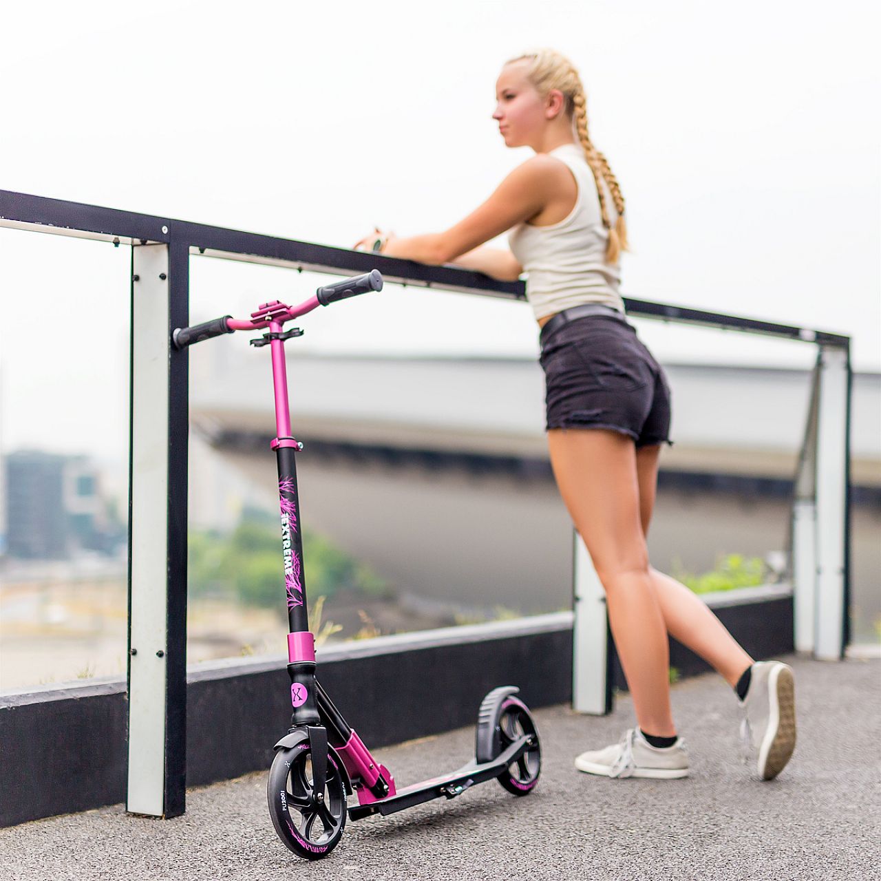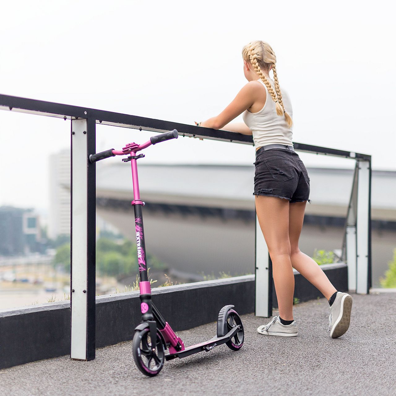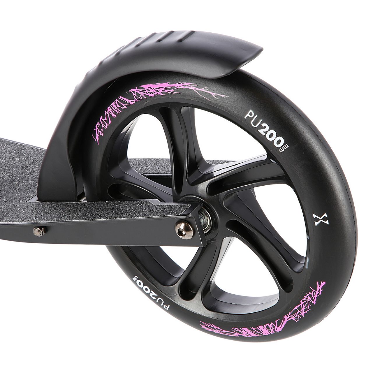Рульове колесо оснащено прогумованими ручками, які забезпечують надійний хват і не викликають потертостей. Це рішення дозволить вам насолоджуватися водінням протягом довгих годин. Регулювання керма дозволить підлаштувати його висоту під зріст користувача. HM205, має два великих колеса розміром 200 мм. Це дозволяє ефективно маневрувати самокатом і долати нерівності. Підшипники класу ABEC9 підвищують стабільність і плавність водіння, а заднє ножне гальмо забезпечує безпеку.