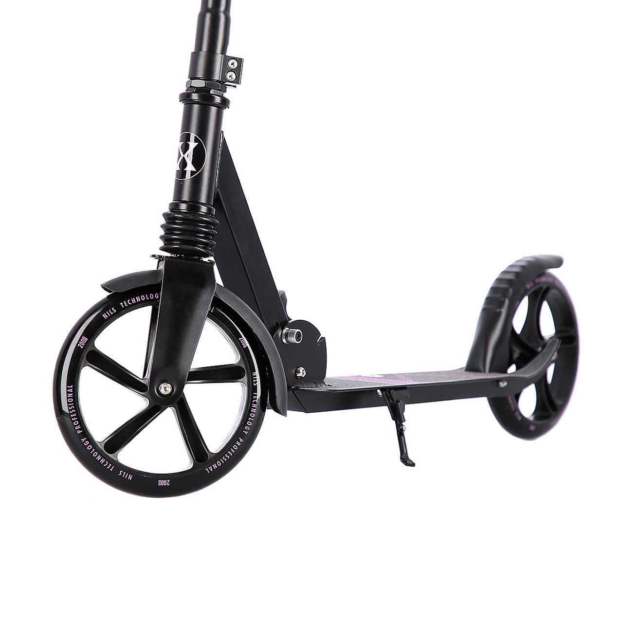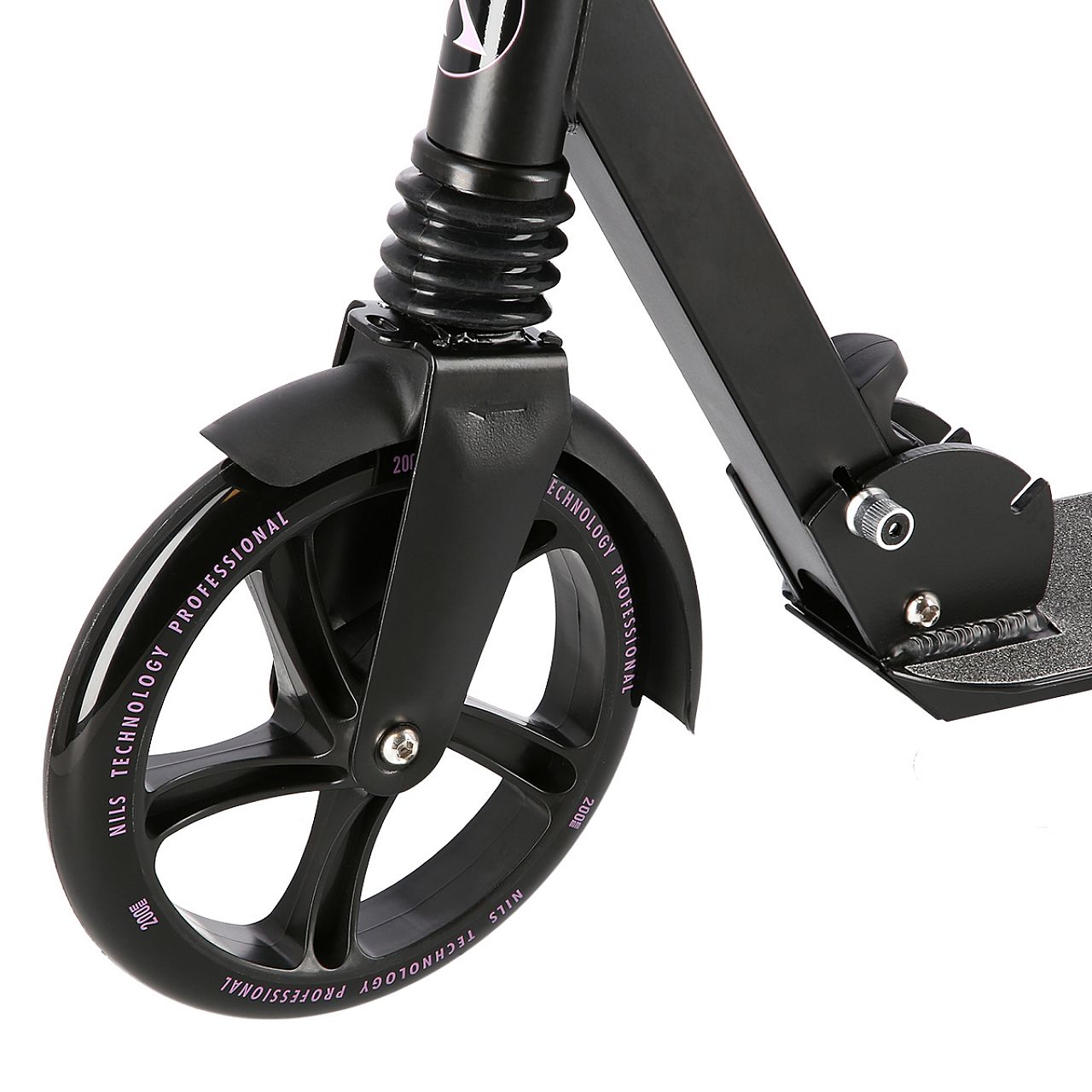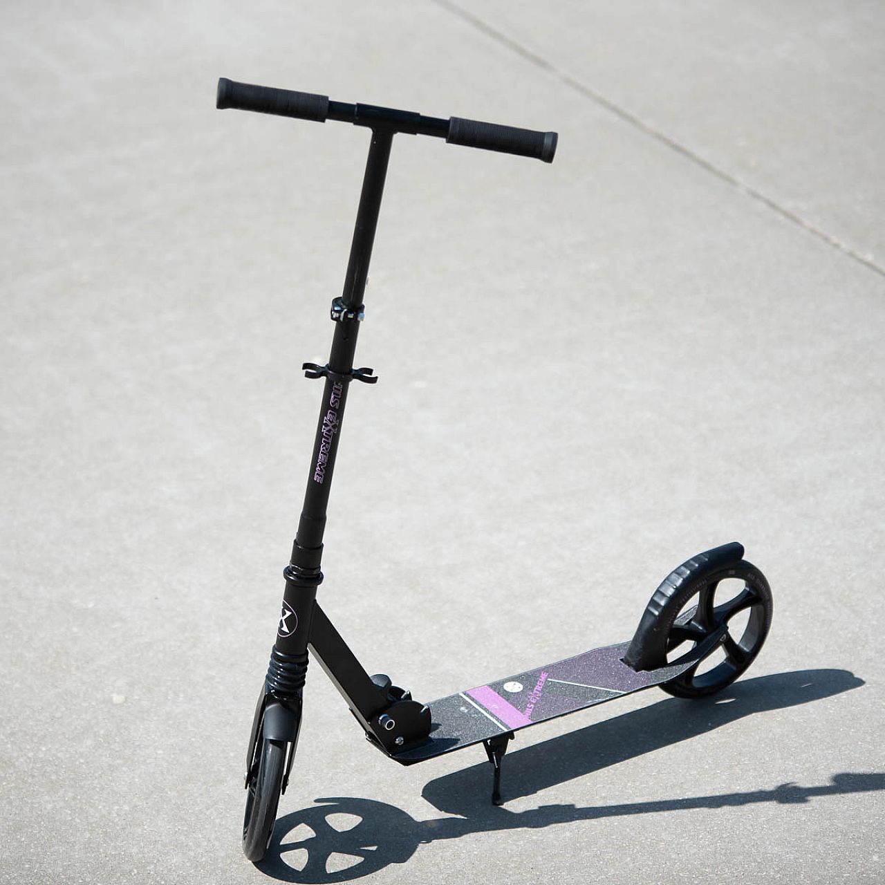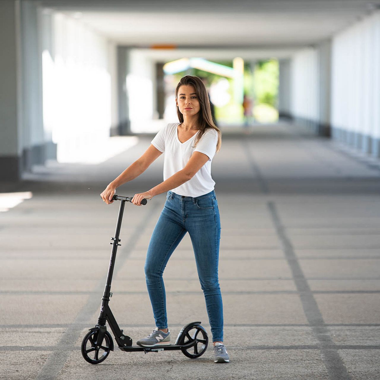 Скутер ідеально підходить для розважального катання по асфальту, бетонним покриттям і асфальтованим тротуарам. Кермо оснащений гумовими ручками, які забезпечують надійний хват. 3-ступеневе регулювання дозволяє підлаштувати його висоту під зріст користувача. Важливим елементом, що впливає на комфорт використання, є передній амортизатор, який мінімізує вібрацію та поглинає удари. Підшипники ABEC7 і великі колеса (200 мм) підвищують стабільність і плавність їзди, а широка платформа полегшить баланс. Крім того, ножне гальмо забезпечує максимальну безпеку під час руху.