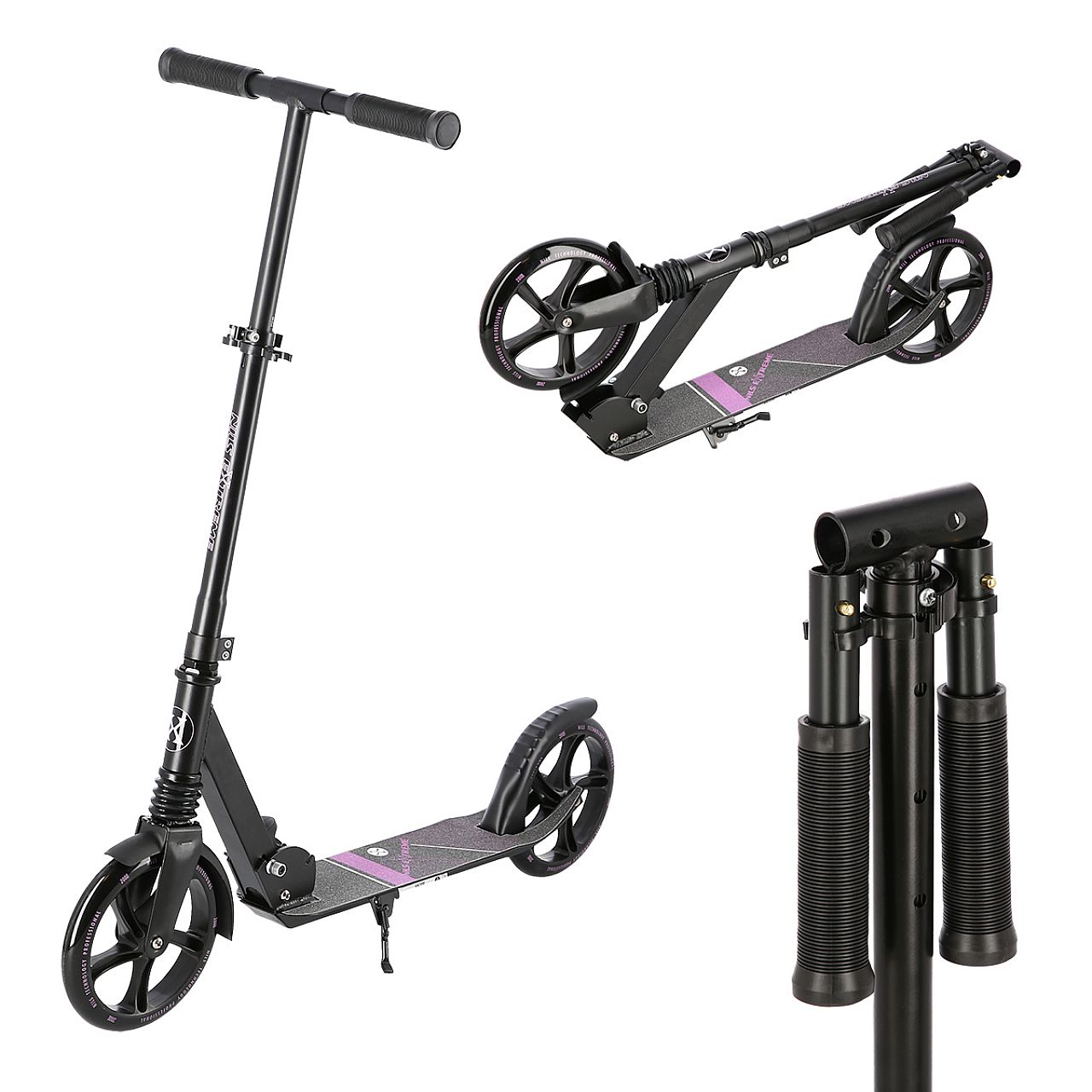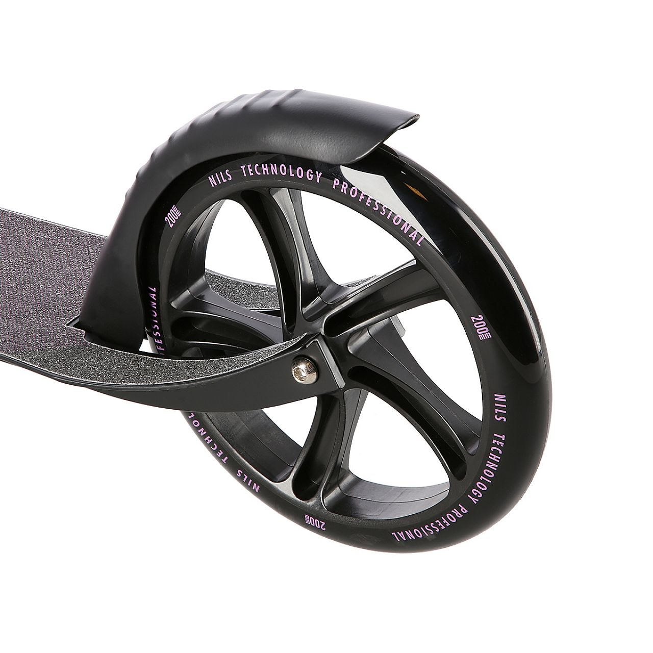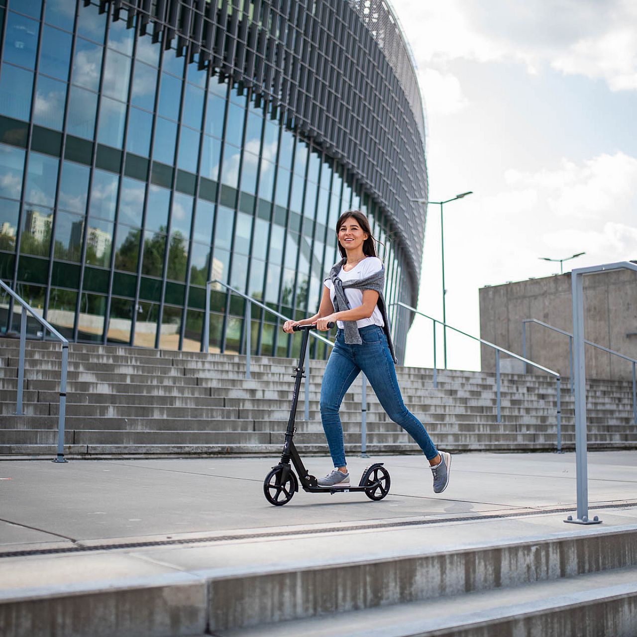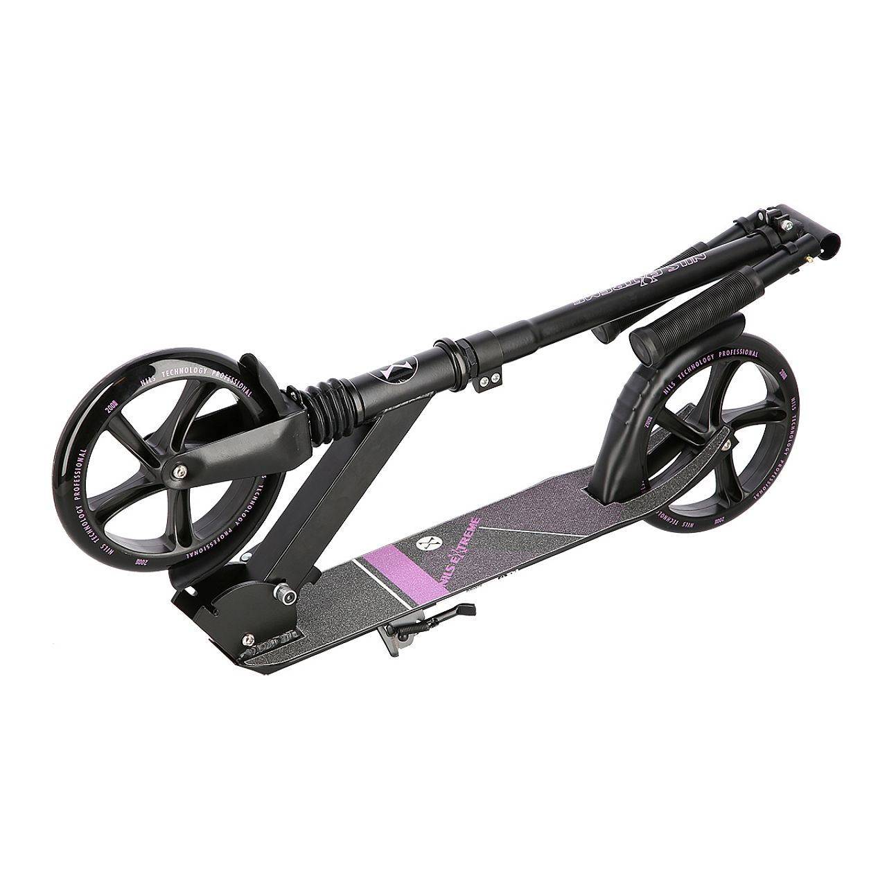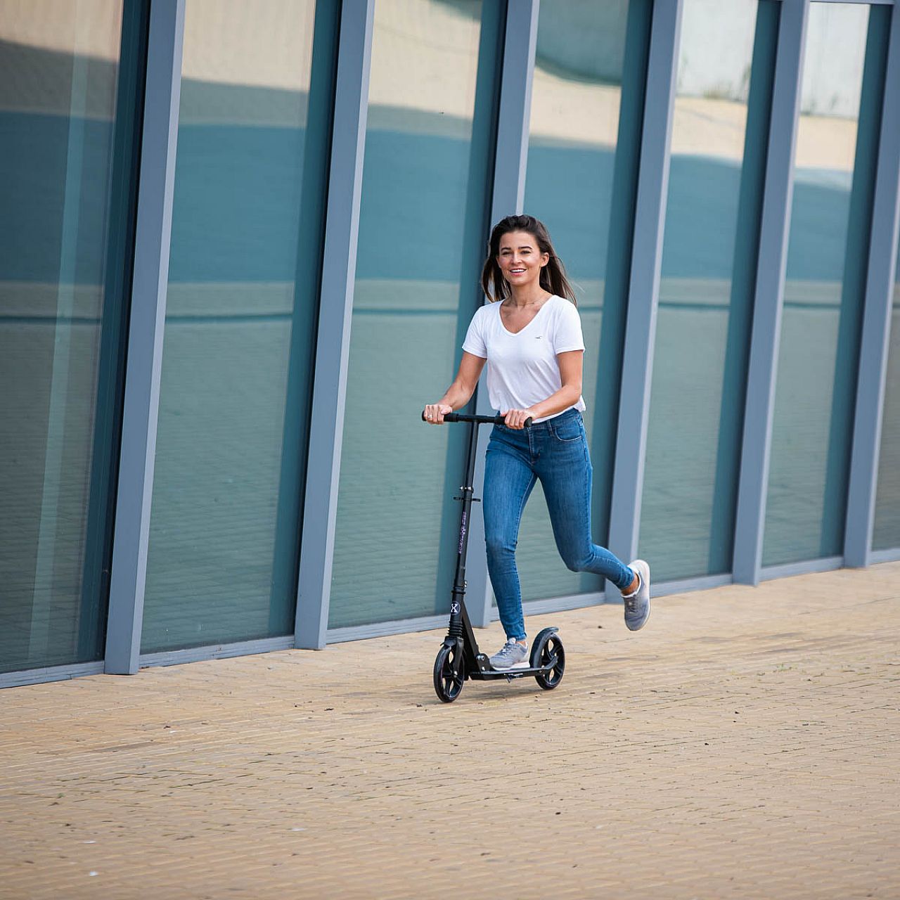 Скутер ідеально підходить для розважального катання по асфальту, бетонним покриттям і асфальтованим тротуарам. Кермо оснащений гумовими ручками, які забезпечують надійний хват. 3-ступеневе регулювання дозволяє підлаштувати його висоту під зріст користувача. Важливим елементом, що впливає на комфорт використання, є передній амортизатор, який мінімізує вібрацію та поглинає удари. Підшипники ABEC7 і великі колеса (200 мм) підвищують стабільність і плавність їзди, а широка платформа полегшить баланс. Крім того, ножне гальмо забезпечує максимальну безпеку під час руху.