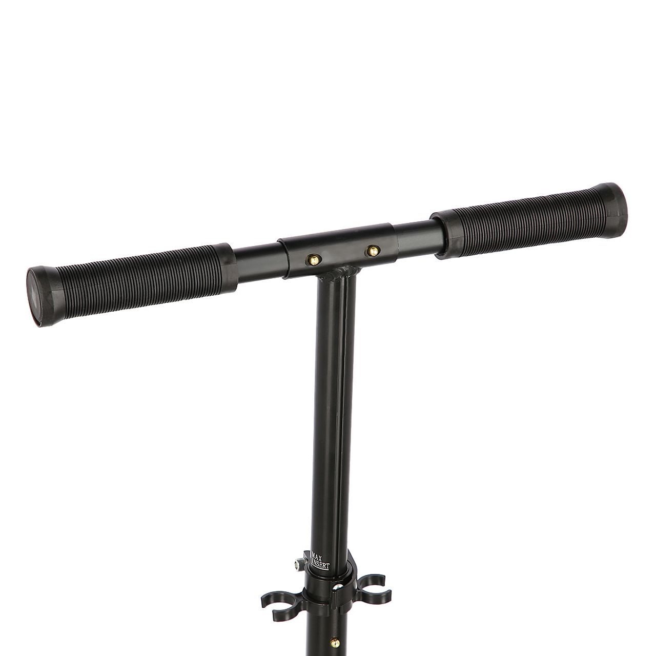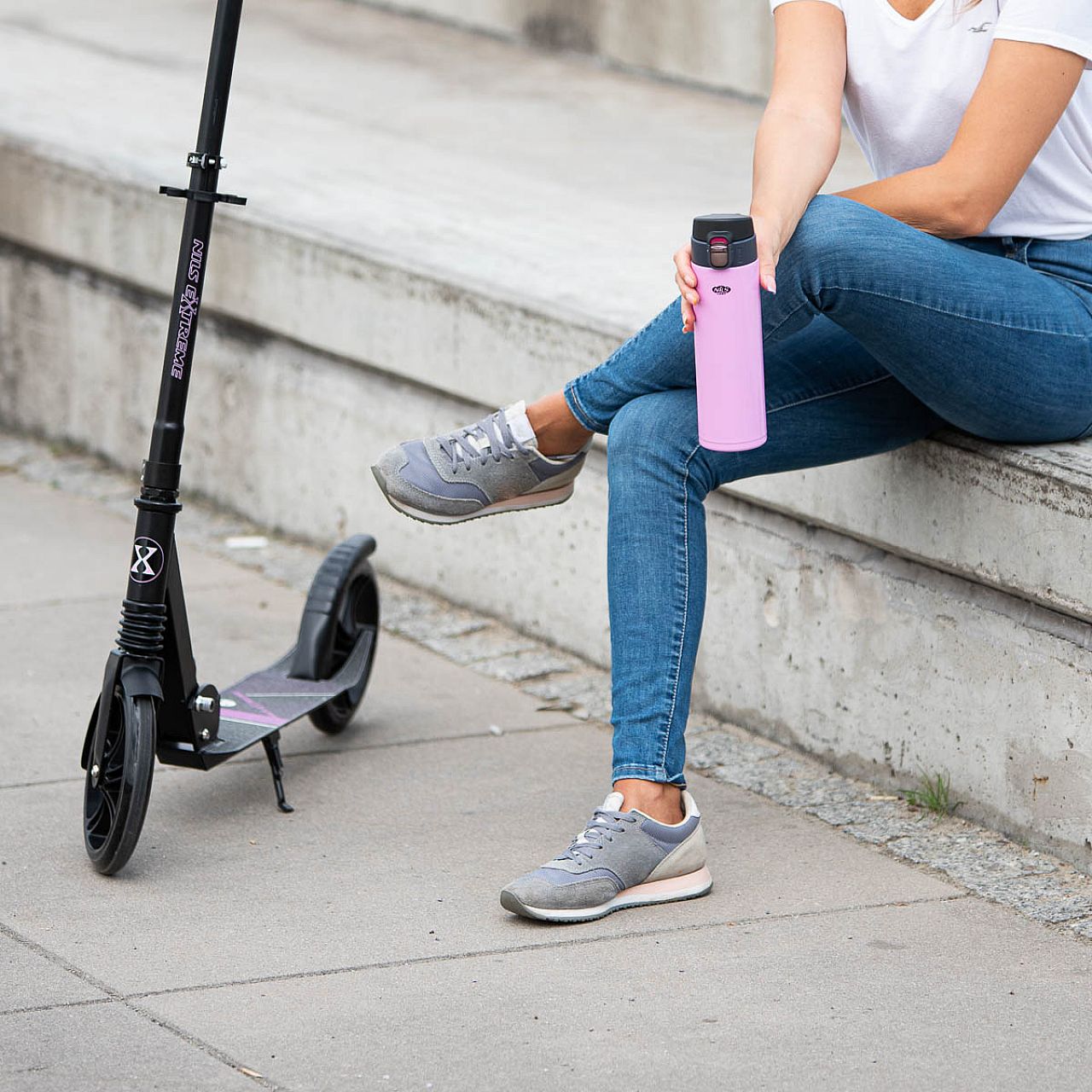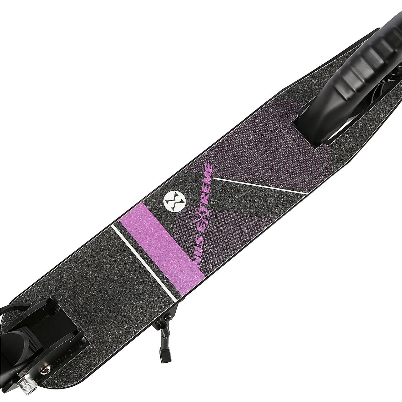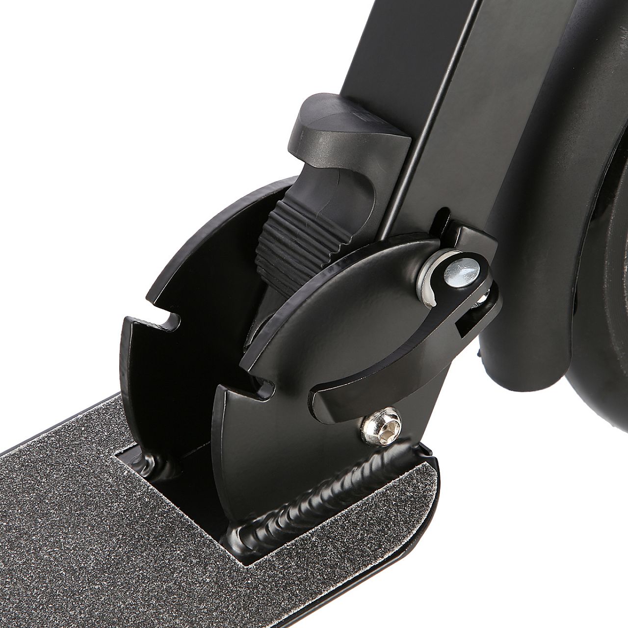 Скутер ідеально підходить для розважального катання по асфальту, бетонним покриттям і асфальтованим тротуарам. Кермо оснащений гумовими ручками, які забезпечують надійний хват. 3-ступеневе регулювання дозволяє підлаштувати його висоту під зріст користувача. Важливим елементом, що впливає на комфорт використання, є передній амортизатор, який мінімізує вібрацію та поглинає удари. Підшипники ABEC7 і великі колеса (200 мм) підвищують стабільність і плавність їзди, а широка платформа полегшить баланс. Крім того, ножне гальмо забезпечує максимальну безпеку під час руху.