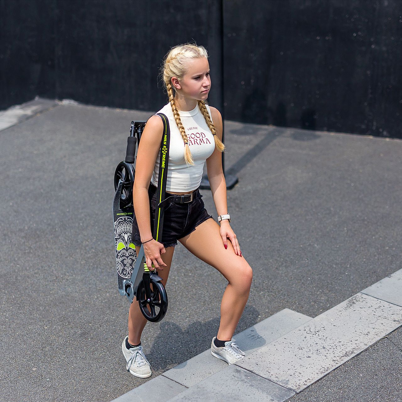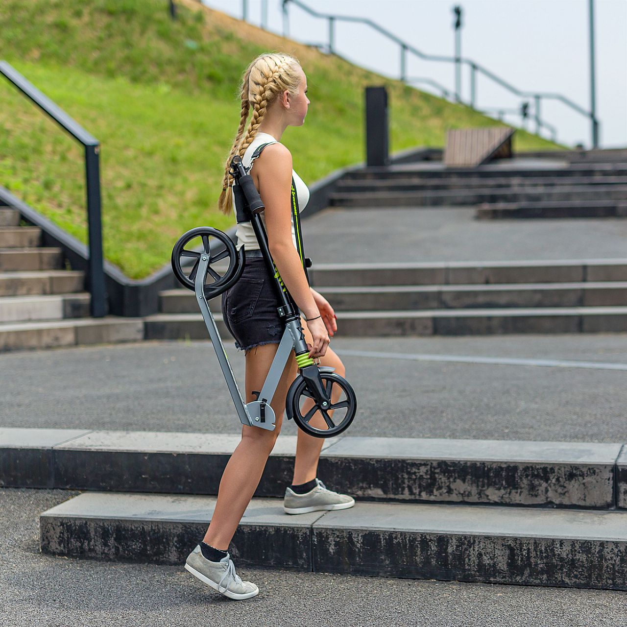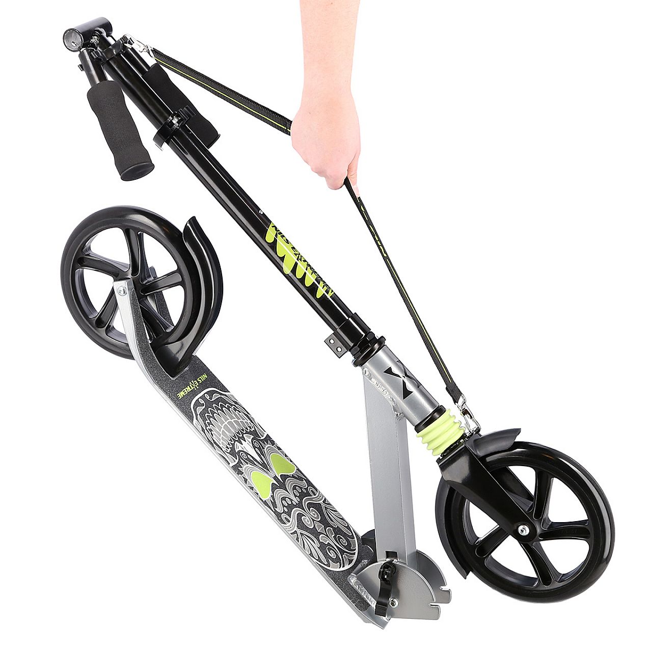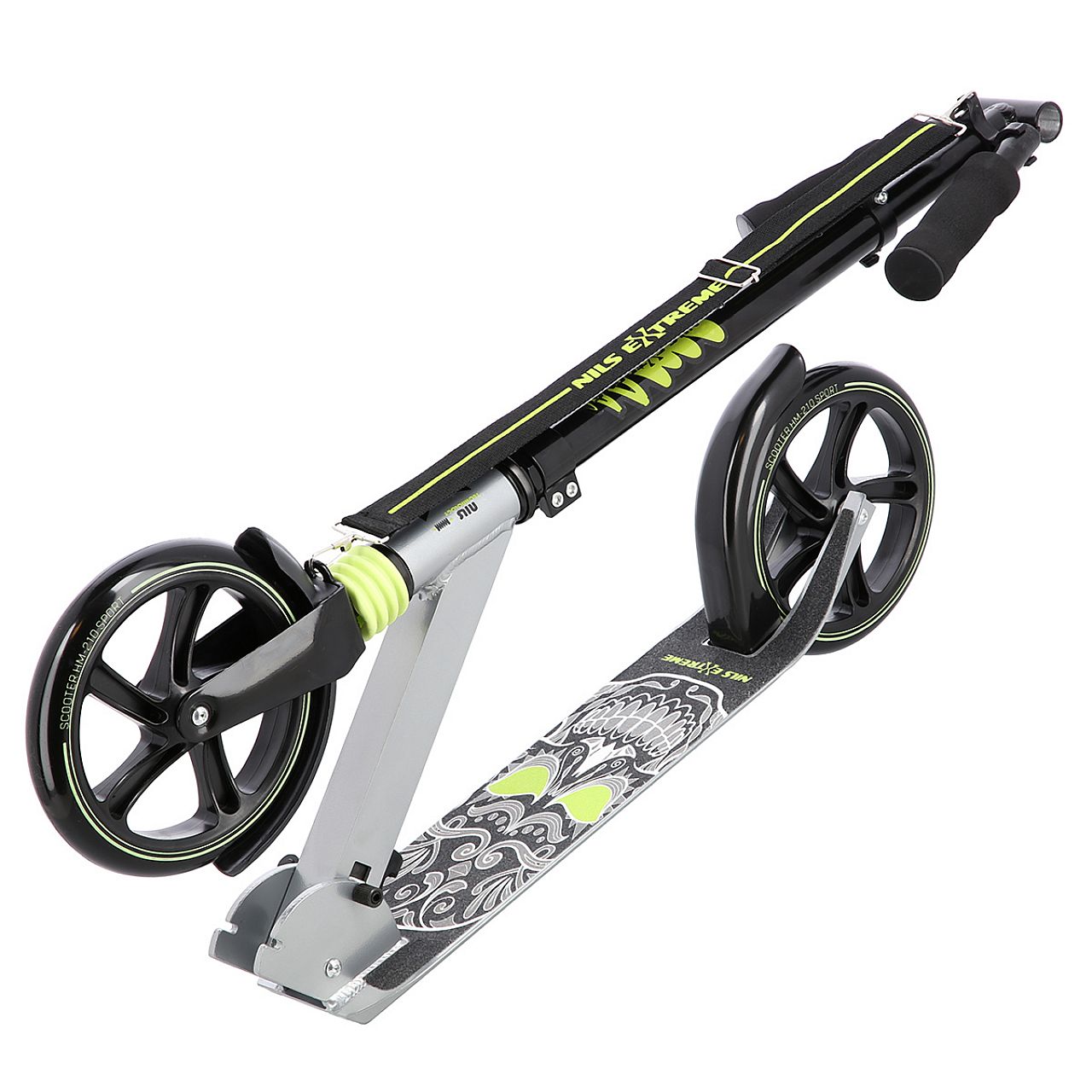 HM210 Nils Extreme - це самокат, призначений для дітей, підлітків і дорослих. Він виготовлений з алюмінію, що робить його дуже легким і міцним. Це дозволить використовувати техніку дуже довго, а завдяки малій вазі не виникне проблем з транспортуванням. Тим більше, що самокат дуже легко складається. Додатковою зручністю є ремінь, який можна прикріпити до самоката, і таким чином, наприклад, одягнути його на раму під час транспортування.