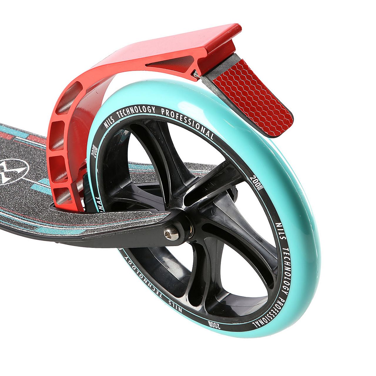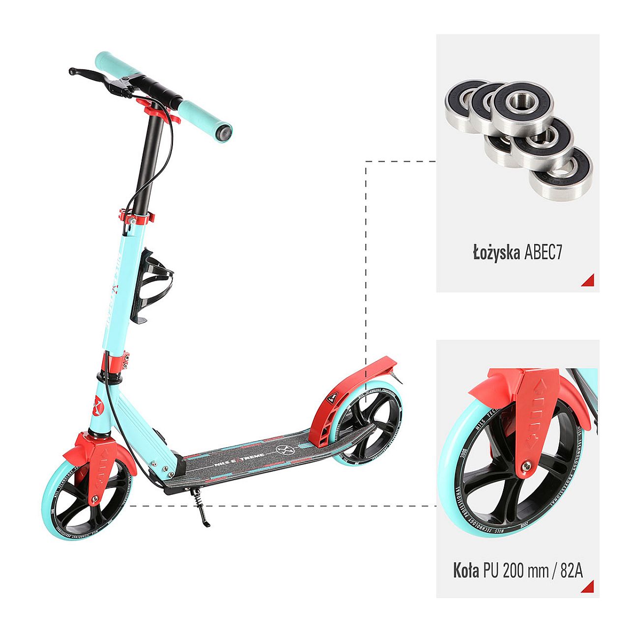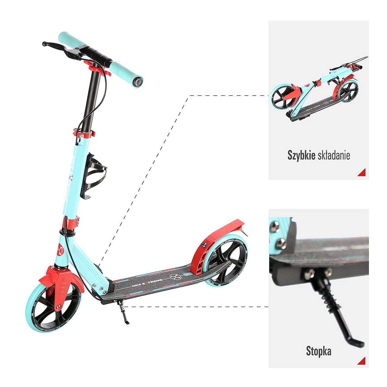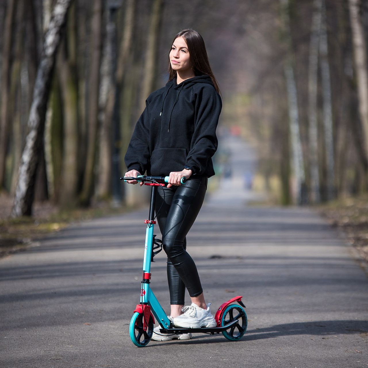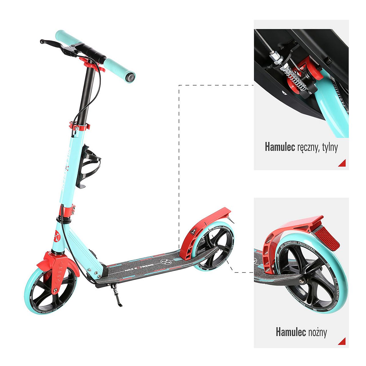Скутер має додаткове ручне гальмо, розташоване на задньому колесі. Завдяки цьому ми отримуємо набагато більшу гальмівну силу, ніж у випадку з класичним ножним гальмом. Розміщення гальма на кермі робить його набагато більш інтуїтивно зрозумілим, ніж ножне гальмо, тому користувач може миттєво зреагувати, якщо виникне необхідність загальмувати, а головне, використання такого рішення забезпечує безпечне водіння навіть на мокрій поверхні. Безпеку виробу також підвищують бризковики, які запобігають бризкам, і нековзка платформа, яка гарантує стабільне положення за кермом. Крім того, кермо оснащено прогумованими ручками, які забезпечують надійний хват і не викликають потертостей.