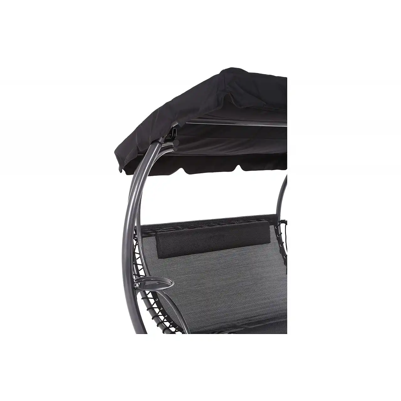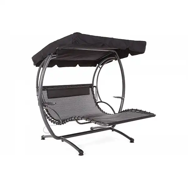 Садова гойдалка - шезлонг-качалка Polly розрахована на 2 людини. Сучасна і міцна самонесуча конструкція зі сталі, пофарбованої високоякісною порошковою фарбою, що забезпечує не тільки привабливий зовнішній вигляд, але і стійкість до погодних умов. Покриття для шезлонга виготовлено з поліетиленової (ПЕ) сітки, що гарантує належну міцність і гнучкість. Особлива форма шезлонга, м'який підголівник, навіс від сонця і столики для напоїв з обох боків шезлонга забезпечують комфортний відпочинок і розслаблення.
