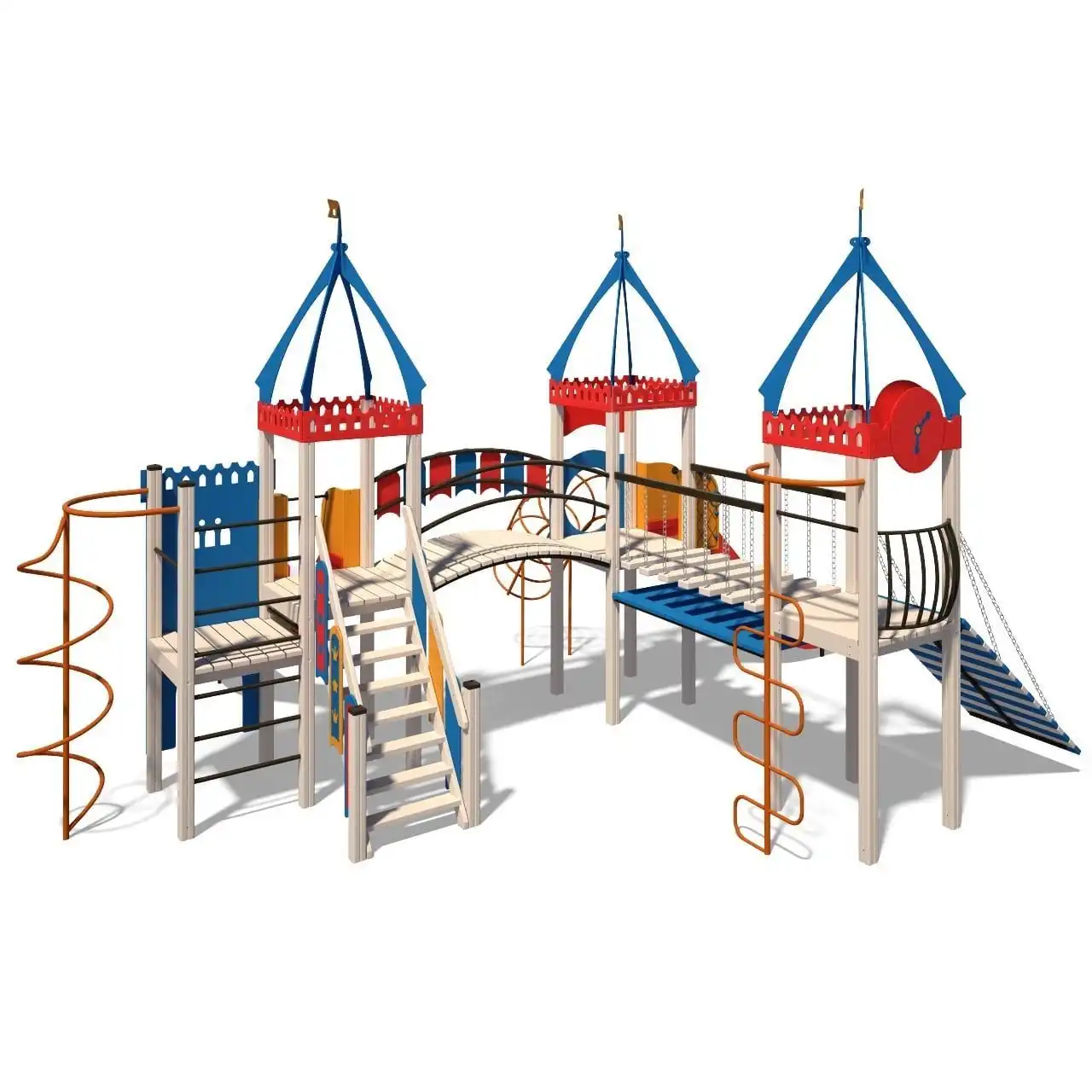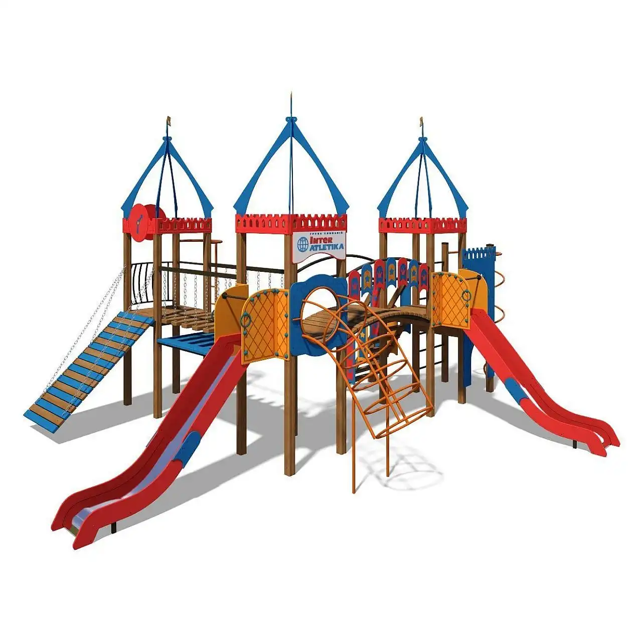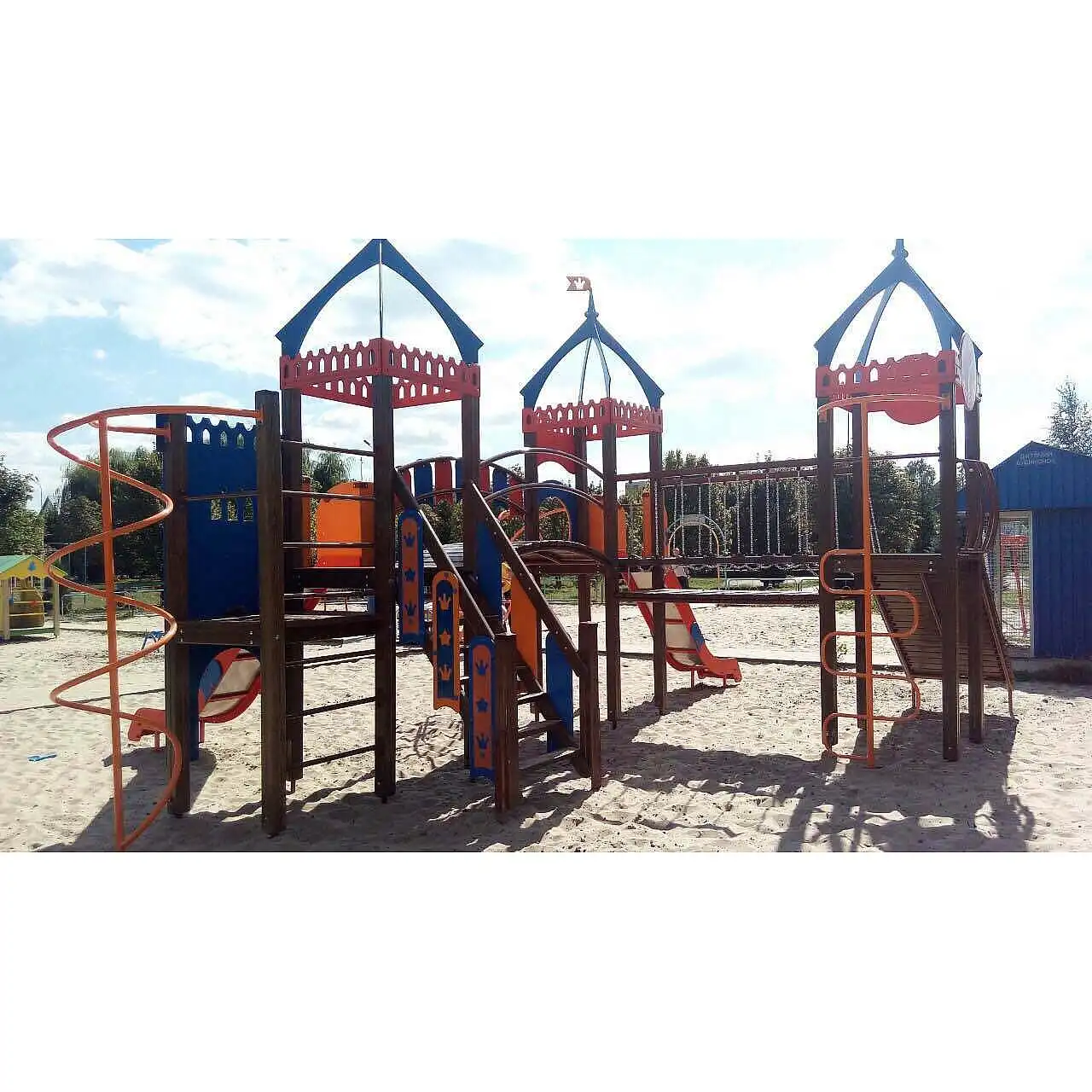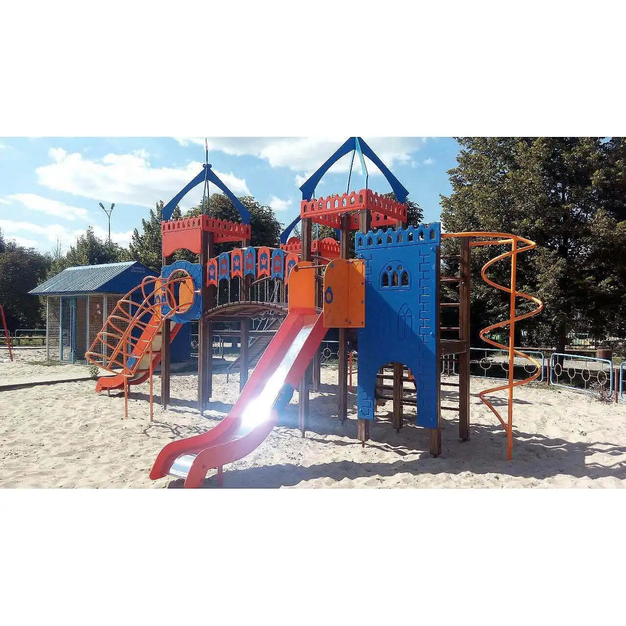 Ігровий комплекс "Замок-М" призначений для ігрових фізичних вправ на відкритому повітрі. Комплекс складається з трьох платформ, встановлених на стійках на висоті 1,5 метра, з'єднаних між собою переходами різної конфігурації. Крім переходів до платформ приєднаються різні підйоми та спуски.