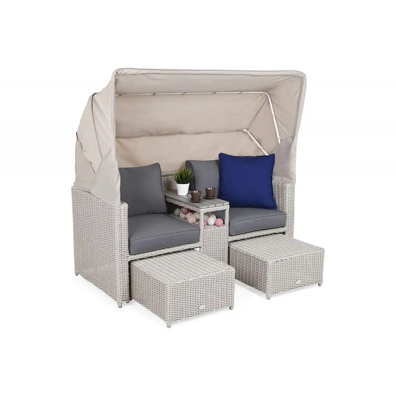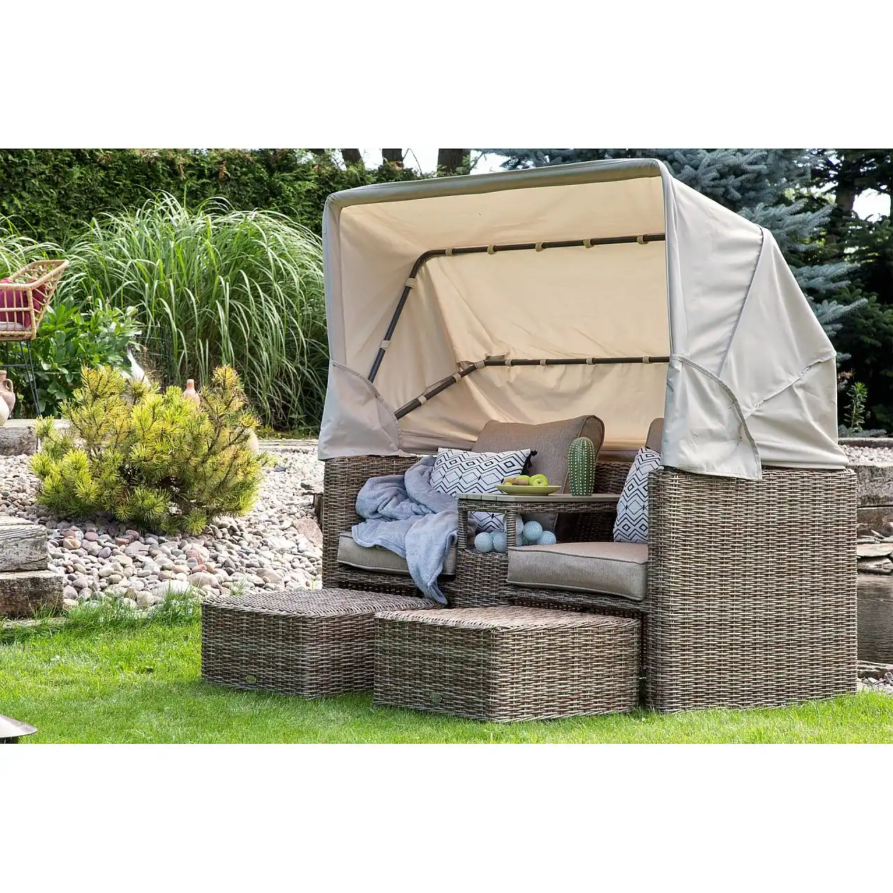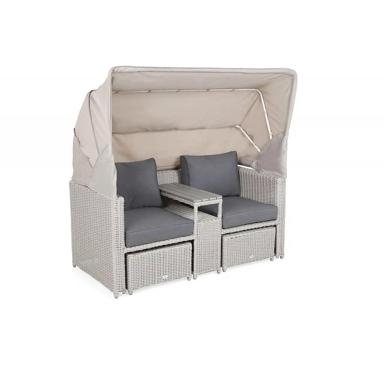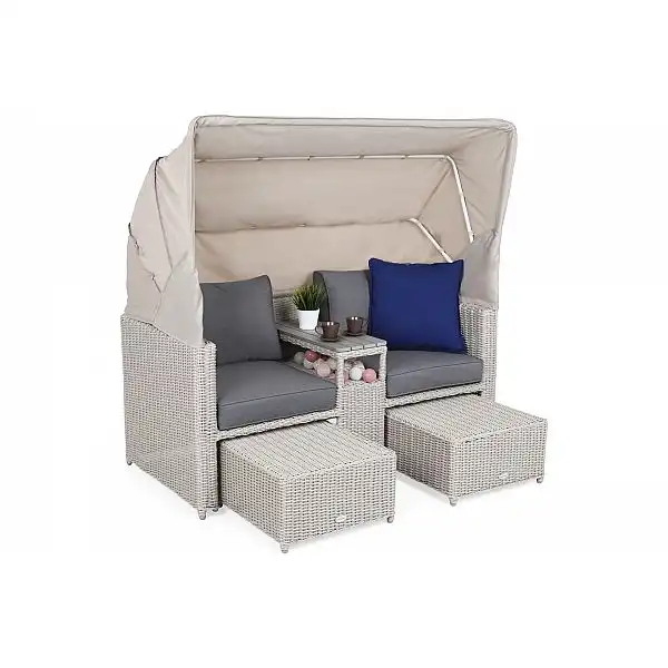 Оригінальний та цікавий дизайн є особливістю садового дивана Michigan з балдахіном. Меблі виготовлені з міцних, але легких матеріалів: каркас — з алюмінієвих профілів з порошковим покриттям, а кришка — з гнучкого техноратангу. Завдяки їм садовий диван можна використовувати на вулиці з перших днів весни до пізньої осені – він не боїться ультрафіолетового випромінювання, перепадів температур і вологості. Він чудово заповнить простір саду та чудово підійде як меблі для тераси чи балкону. Після розкладання тенту диван набуває форми пляжного кошика – це забезпечує приватність і, за потреби, захищає від надмірного сонячного світла. Простіри, розділені вбудованою полицею, забезпечують повний комфорт : створені окремі крісла зі зручним столиком. Щоб зробити його ще комфортнішим для користувачів, є підставки для ніг, які також функціонують як пуфи. Все це доповнюють товсті подушки з оббивкою з приємного на дотик матеріалу, що застібається на блискавку, тому їх легко тримати в чистоті.