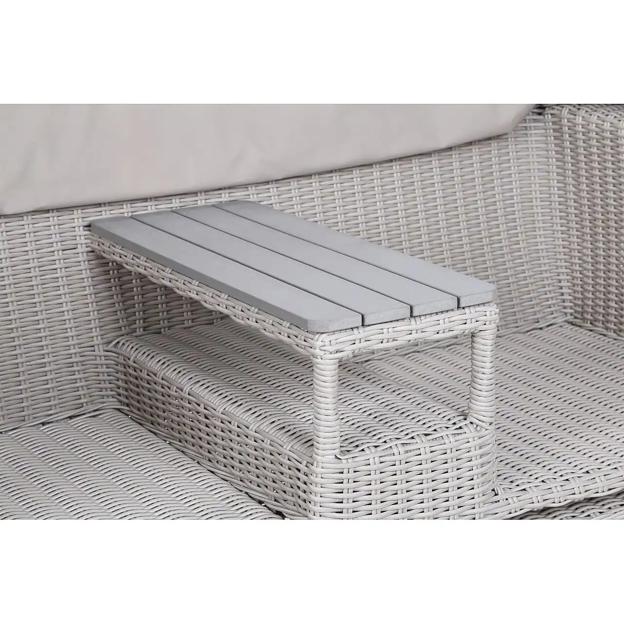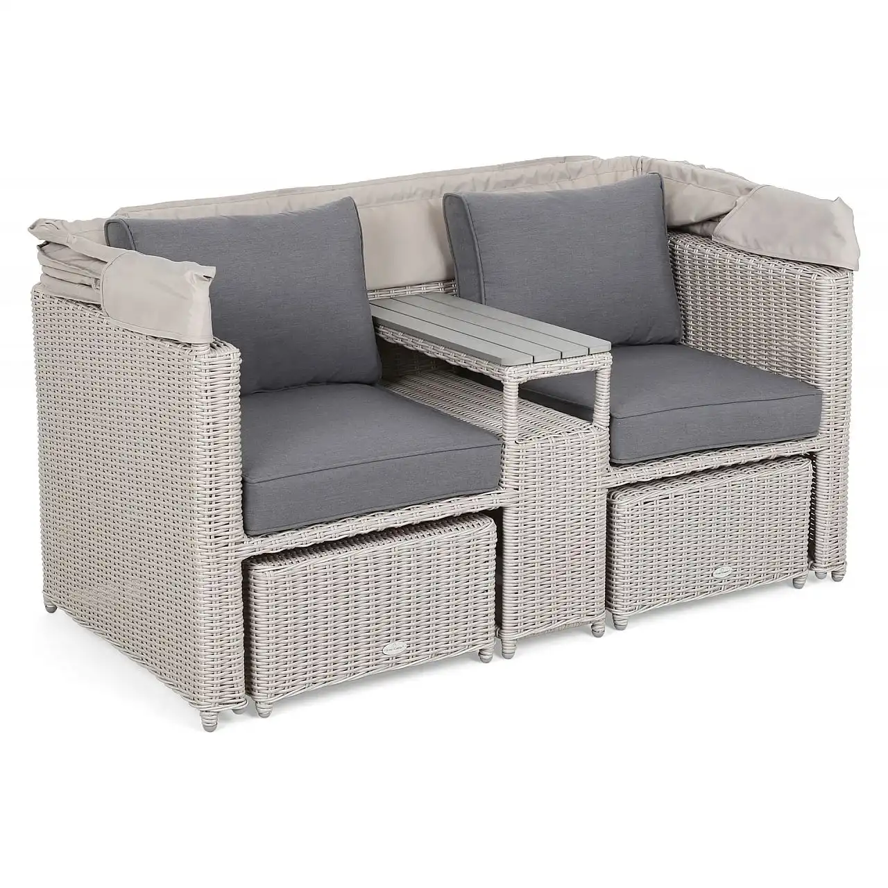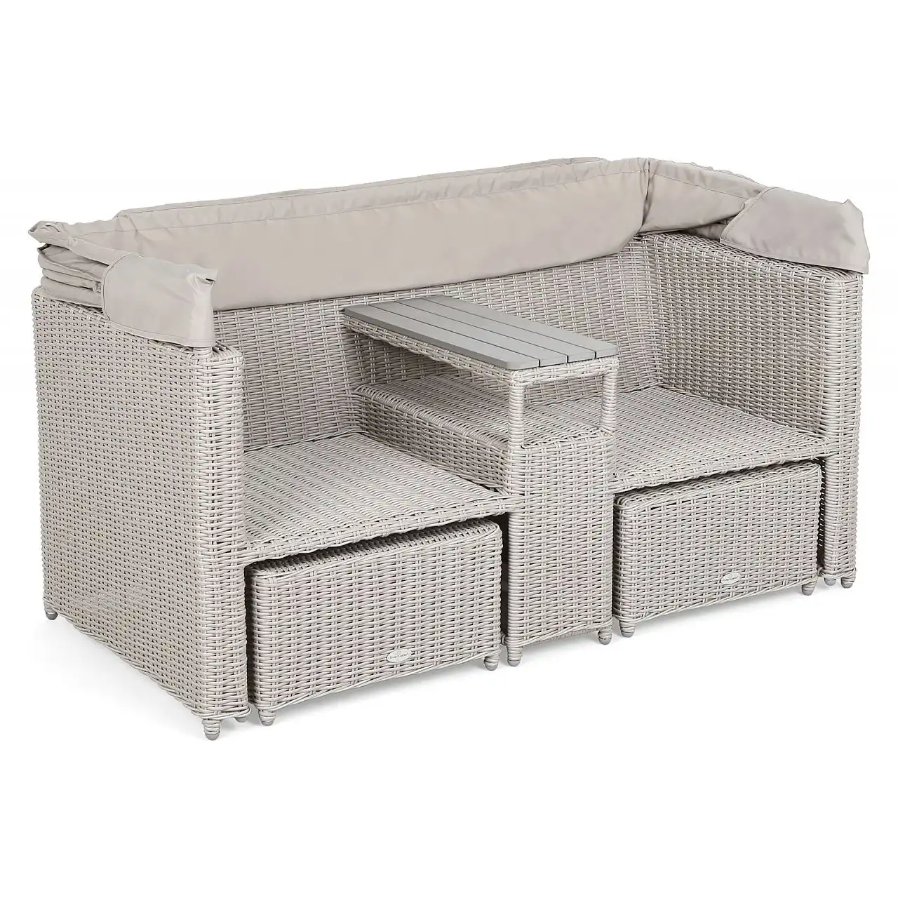 Оригінальний та цікавий дизайн є особливістю садового дивана Michigan з балдахіном. Меблі виготовлені з міцних, але легких матеріалів: каркас — з алюмінієвих профілів з порошковим покриттям, а кришка — з гнучкого техноратангу. Завдяки їм садовий диван можна використовувати на вулиці з перших днів весни до пізньої осені – він не боїться ультрафіолетового випромінювання, перепадів температур і вологості. Він чудово заповнить простір саду та чудово підійде як меблі для тераси чи балкону. Після розкладання тенту диван набуває форми пляжного кошика – це забезпечує приватність і, за потреби, захищає від надмірного сонячного світла. Простіри, розділені вбудованою полицею, забезпечують повний комфорт : створені окремі крісла зі зручним столиком. Щоб зробити його ще комфортнішим для користувачів, є підставки для ніг, які також функціонують як пуфи. Все це доповнюють товсті подушки з оббивкою з приємного на дотик матеріалу, що застібається на блискавку, тому їх легко тримати в чистоті.
