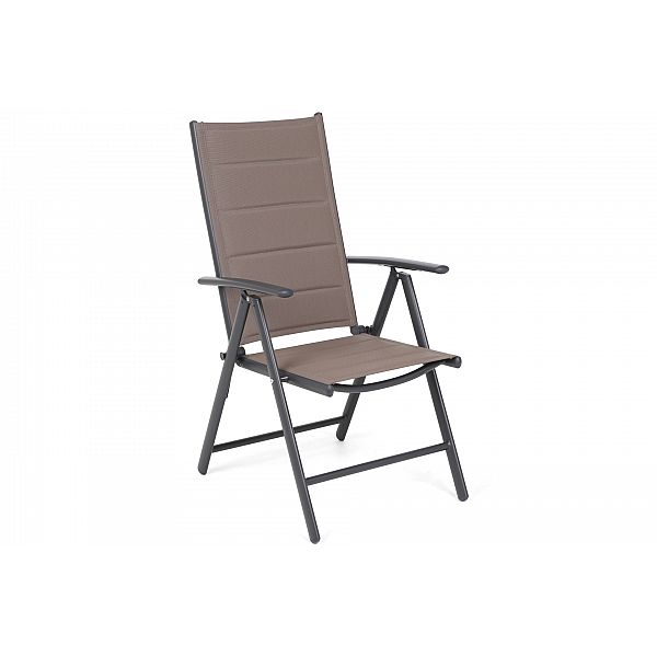 Каркас садового крісла Ibiza виготовлений з алюмінієвих профілів з порошковим покриттям. Сидіння та спинка стільця виготовлені з синтетичної тканини текстиль, наповнені оббивним поролоном та простьобані. Завдяки семиступінчастому регулюванню положення спинки, крісло дуже зручне та функціональне: ви можете зручно розташуватися за столом або прийняти більш розслаблену позу.