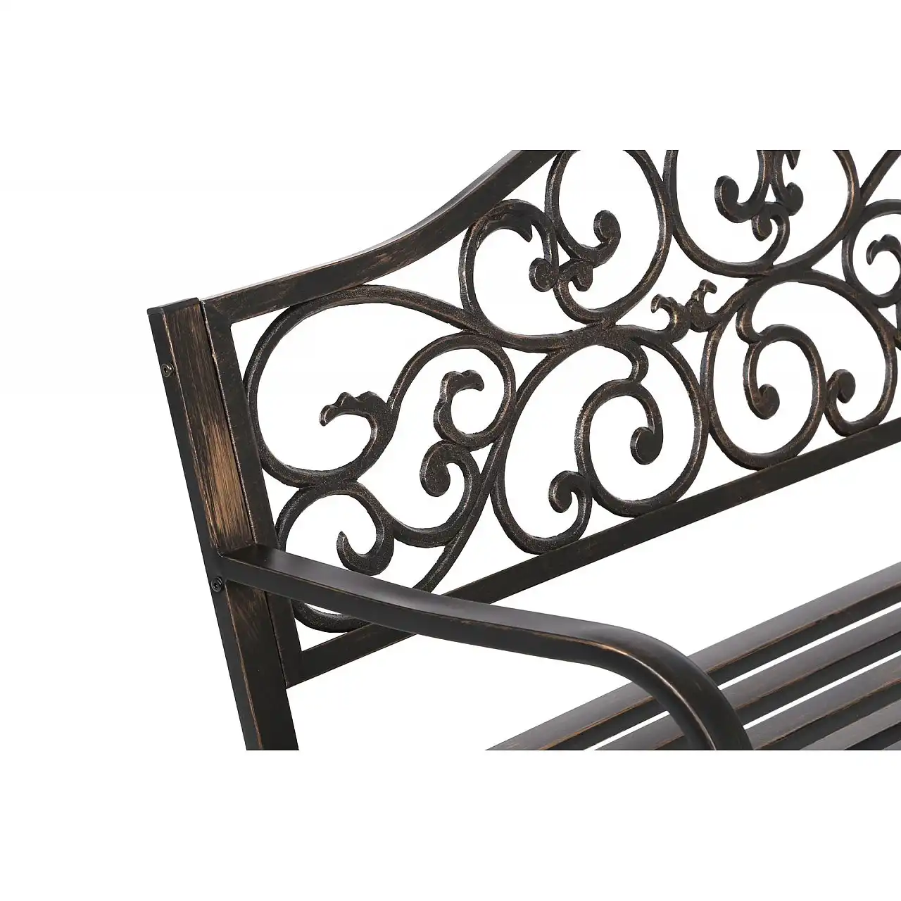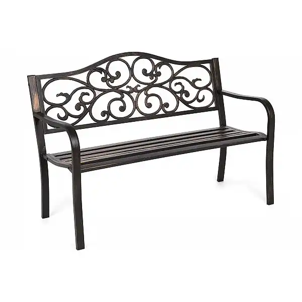 Садова металева лавка Bloom - ідеальний елемент декору для веранди, балкона або невеликої тераси . Він також буде дуже красиво виглядати в саду , створюючи неповторну, романтичну атмосферу . Він виготовлений зі сталі, покритий порошковою фарбою чорного кольору та тертого золота . Спинка з візуально цікавим чавунним орнаментом є не тільки декоративним елементом, але й стабілізує садову лавку. Він досить легкий, щоб його могла нести навіть одна людина , але також досить важкий, щоб він ніколи не перекинувся .