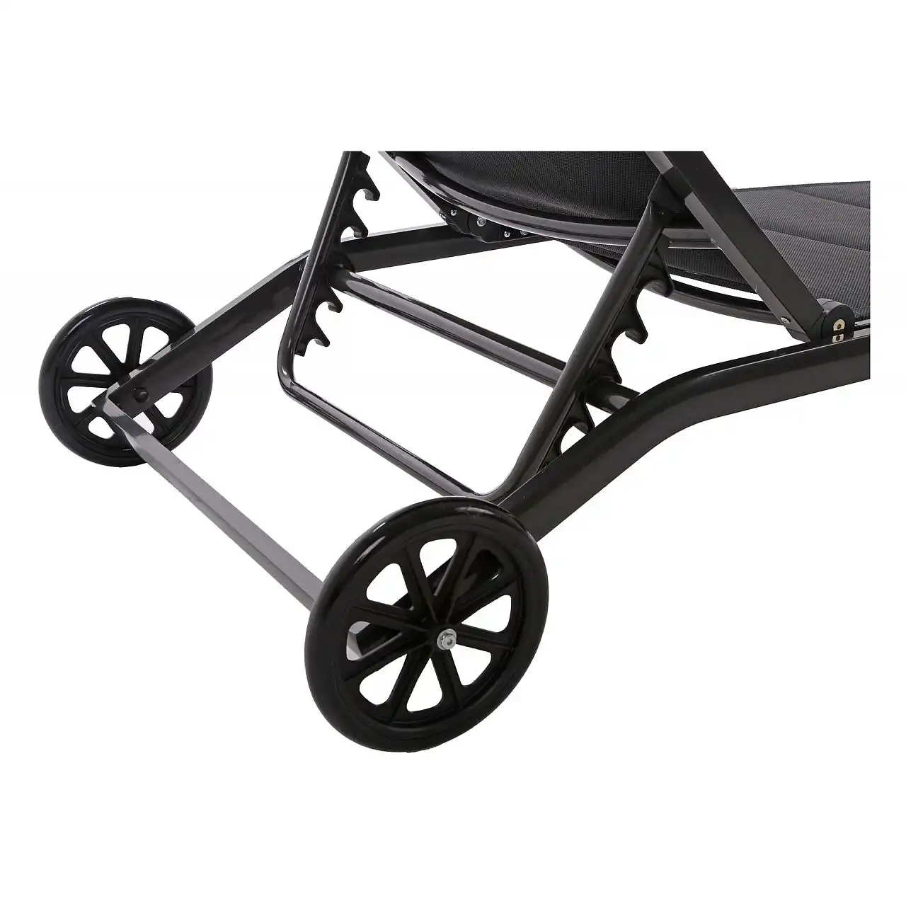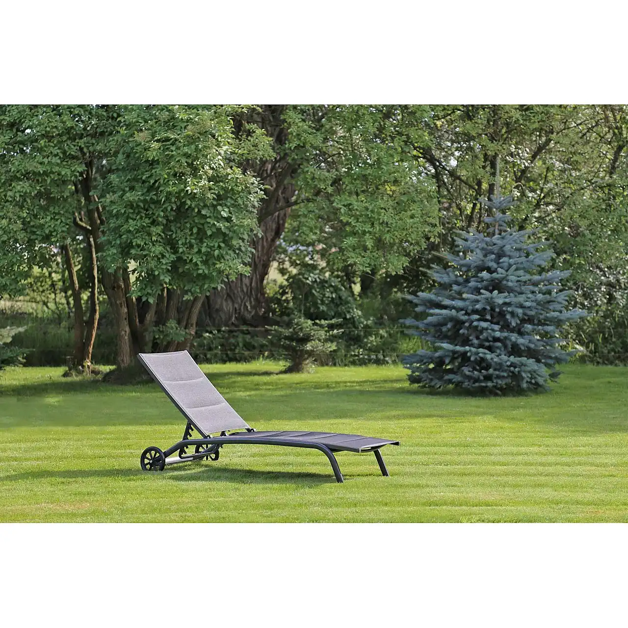 Використання міцних алюмінієвих профілів гарантує легкість та довговічність цих садових меблів. Це матеріал, який відрізняється своєю стійкістю до корозії. Завдяки цьому, чорний алюмінієвий шезлонг служитиме вам багато років, незалежно від погодних умов. Щоб забезпечити легку конструкцію, також потрібно додати колеса. Це дуже корисна річ для щоденного використання. Завдяки легкості та стійкості, ви можете розмістити чорний садовий шезлонг будь-де у вашому саду. Ви також швидко це перемістите.