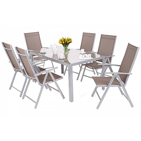 Каркаси всіх елементів садових меблів Corfu Basic виготовлені з алюмінію з порошковим покриттям . Завдяки використанню спеціальної конструкції столу (П-подібні профілі) він надзвичайно стійкий і зручний у використанні. Стільці легко поміщаються під стільницею, і є достатньо місця для ніг. Стільниця виготовлена з сатину, загартованого скла, тонованого темно-коричневого кольору, яке легко миється . Стільці оснащені сидіннями та спинками з текстильного полотна , яке ідеально підходить для будь-яких погодних умов. Комфорт забезпечують підлокітники і спинки, які регулюються в декількох положеннях. Набір садових меблів Corfu Basic легко зберігати: стільці можна скласти, а стіл можна розібрати . Завдяки матеріалам, з яких вони виготовлені, меблі стійкі до погодних умов . Естетичність виготовлення та міцні компоненти гарантують, що вони прослужать користувачам довгі роки .