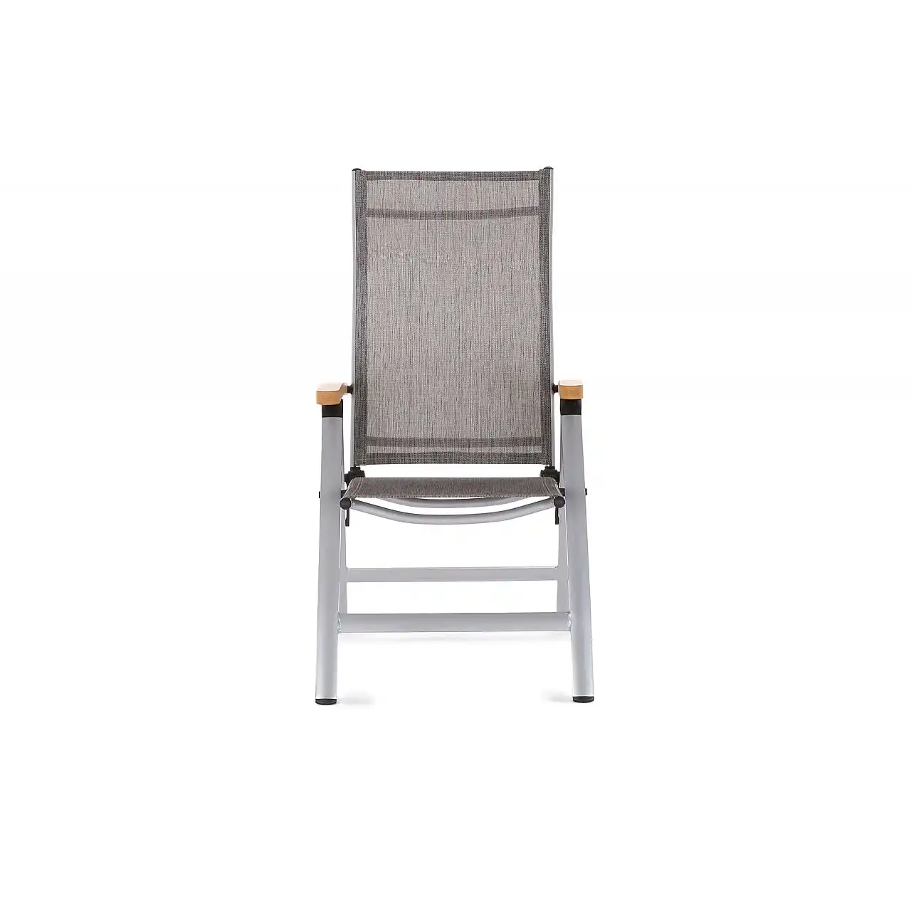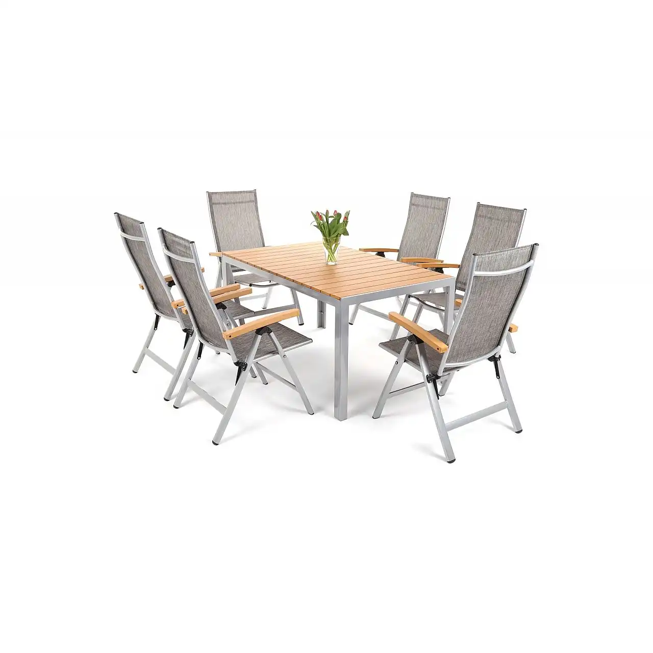 Алюмінієві садові меблі Florence - це комплект, що складається з великого столу та 6 розкладних стільців. Стіл дуже стійкий: він виготовлений з U-подібних алюмінієвих профілів і каркаса, до якого кріпляться композитні дошки, що утворюють стільницю. Алюмінієвий каркас столу та стільців пофарбований порошковою фарбою. Алюмінієві меблеві стільці Florence оббиті текстильною сіткою, яка не вбирає воду і стійка до постійних деформацій. Крісла дуже зручні: сидіння підлаштовуються під фігуру, спинки регулюються. Дерев'яні підлокітники також забезпечують комфорт. Флоренція - це садові меблі , які дуже легко зберігати взимку: стільці складаються і займають мало місця.