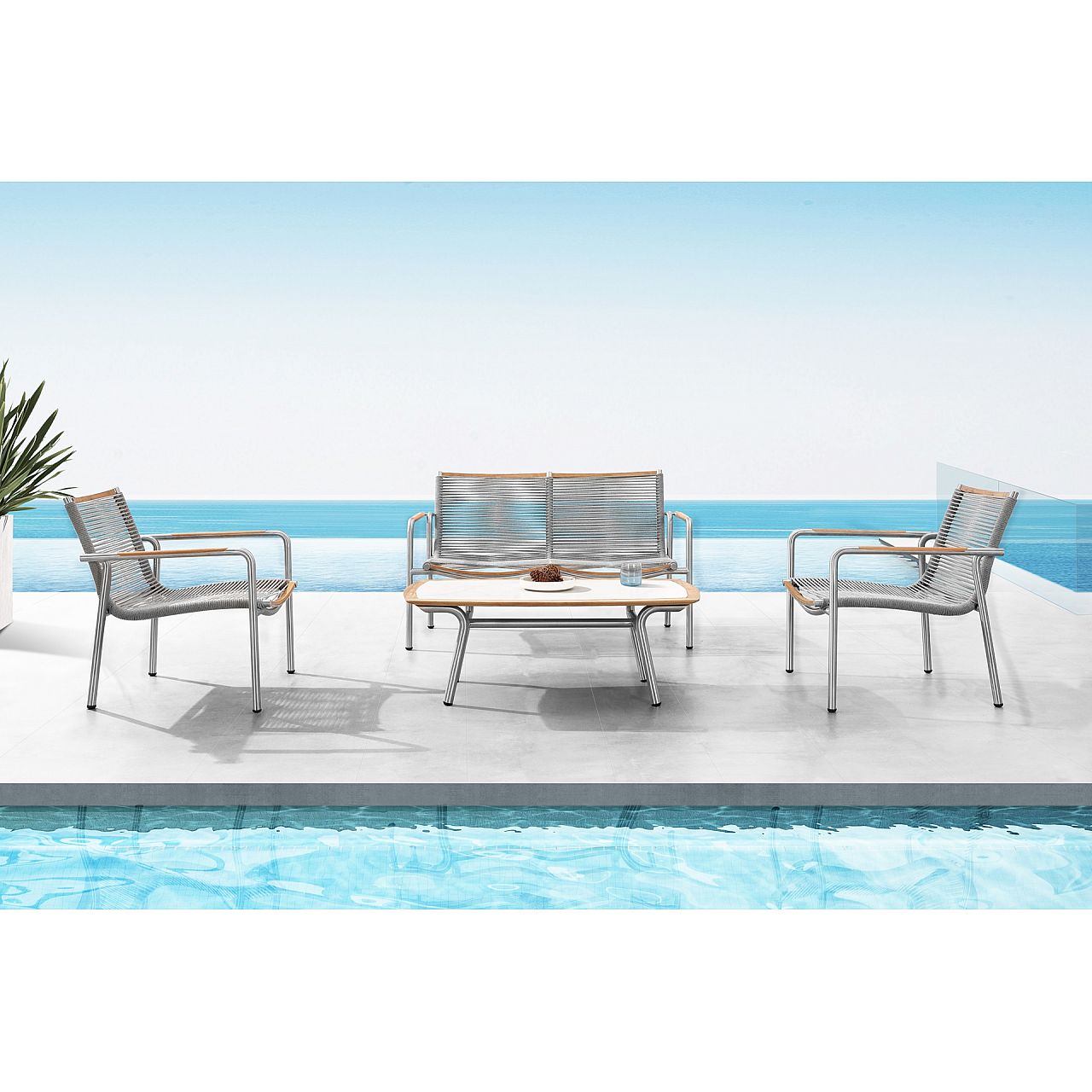 Genua - це дизайнерський, зручний і вражаюче міцний комплект садових меблів з алюмінію, поліестеру та керамічного скла. Два зручних крісла, не менш зручний диван і невеликий, але надзвичайно функціональний столик створюють єдине ціле, яке зробить кожну мить на терасі приємнішою і стане її оригінальною прикрасою.