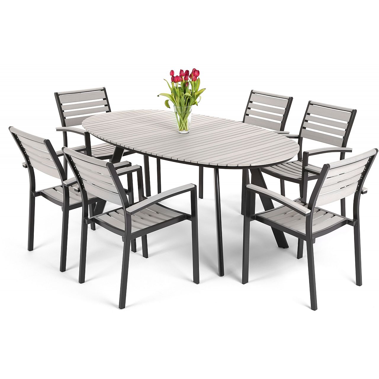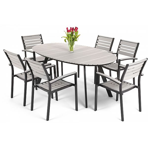 Садові меблі Lorenzo - ідеальний набір для будь-якого саду, тераси або патіо. Вони виготовлені зі спеціального поєднання алюмінію та WPC, завдяки чому меблі мають високу стійкість, довговічність і не пошкоджуються погодними умовами. Комплект меблів складається з шести стільців і великого овального столу. Меблі чудово підійдуть як для невеликих сімейних посиденьок, так і для вечірок у саду.