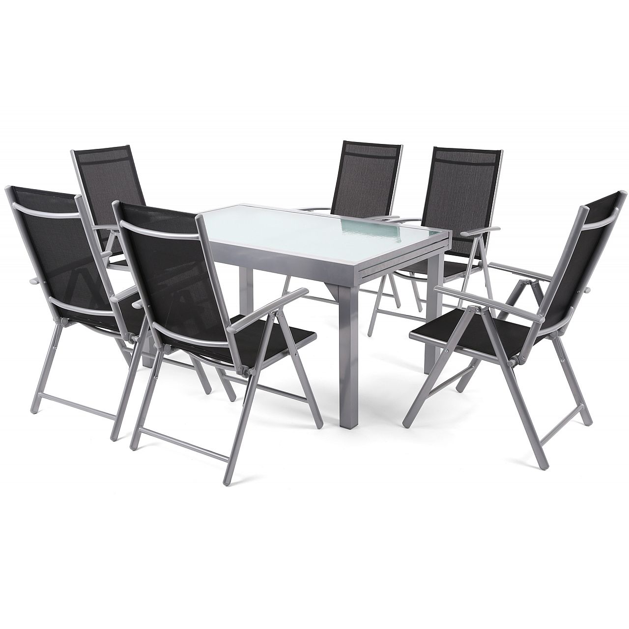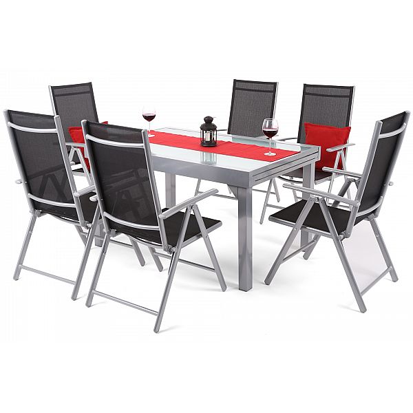 Комплект садових меблів Orlando Basic особливо сподобається людям, які люблять організовувати різноманітні зустрічі у своєму саду . Невеликий, здавалося б, столик на 6 персон миттєво перетвориться на банкетний стіл довжиною 270 см , за яким можуть розміститися до 10 осіб . Міцна конструкція алюмінієвих профілів з порошковим покриттям забезпечує високу стійкість меблів . Стільниця з віконцем із загартованого декоративного скла монтується в спеціальні напрямні, завдяки чому її надзвичайно легко розгортати та займати лише мить . Садові меблі Orlando Basic , укомплектовані столом, також пропонують 6 практичних, складних, алюмінієвих стільців з підлокітниками . Їх чохол виготовлений з текстилену - дихаючого, водонепроникного матеріалу (після дощу просто протріть його сухою тканиною або почекайте кілька хвилин, поки вода висохне), і не сприйнятливий до УФ-випромінювання . Спинка стільця регулюється в 7 положеннях, тому кожен користувач може налаштувати її відповідно до своїх уподобань .
