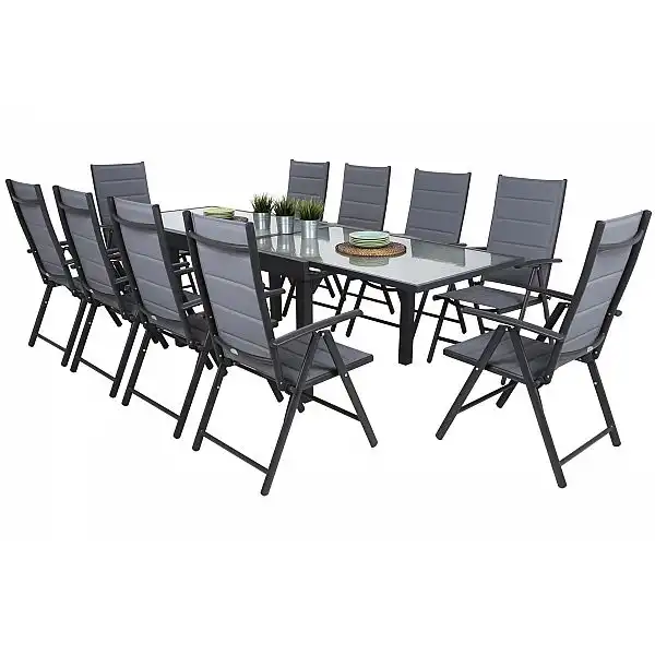 У набір входить десять стільців з регульованою спинкою, обідній стіл і набір для самостійної збірки. Набір є ідеальною пропозицією для людей, які люблять сімейні трапези та вечірки в саду.