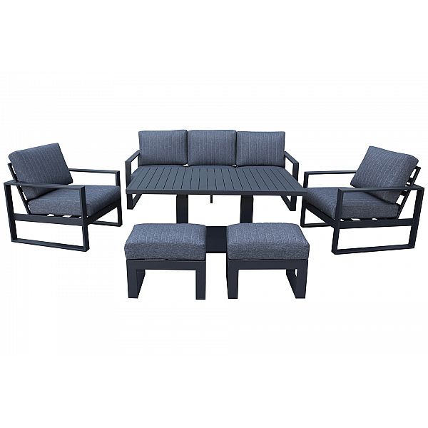 Набір садових меблів Sorrento - ідеальний вибір для людей, які цінують комфорт і елегантність. Виготовлений з алюмінію з порошковим покриттям, він стійкий до погодних умов і простий у догляді. Набір складається з дивана, двох крісел, двох пуфів і столика з газовим регулюванням висоти, що робить його ідеальним місцем для відпочинку за кавою або обідом. Подушки з прошивкою забезпечують додатковий комфорт і естетичність.