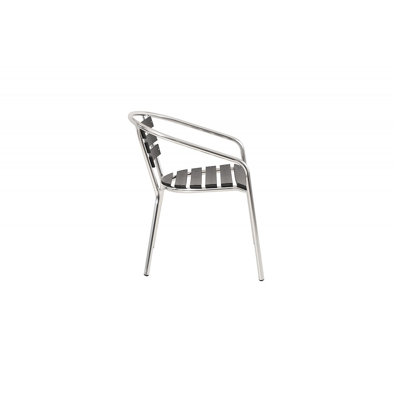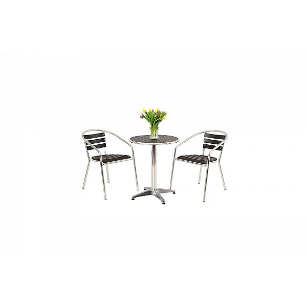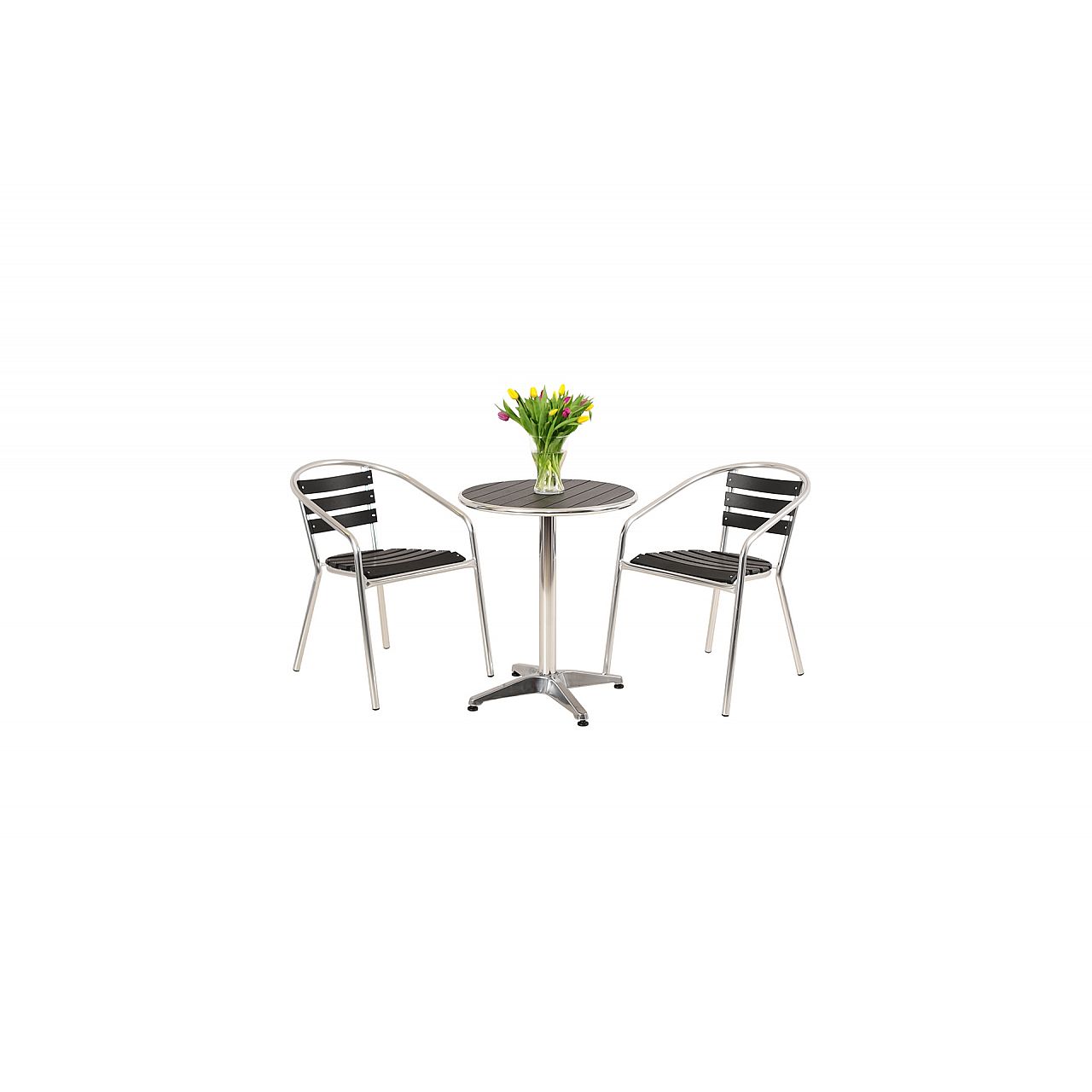 Алюмінієвий комплект меблів Summer Pollywood складається з двох стільців і столу. Конструкція меблів виготовлена з алюмінію, а стільниця, сидіння та спинки стільців виготовлені з високоякісної штучної деревини Полівуд. Практичний, простий у догляді та стійкий до погодних умов набір ідеально підходить для ресторанів, кафе, кондитерських, а також для саду, тераси чи балкона. Основа столу має чотири регульовані ніжки, завдяки яким можна вирівняти стільницю на нерівній поверхні. Стільці можна вільно складати, що економить місце при транспортуванні та зберіганні меблів.