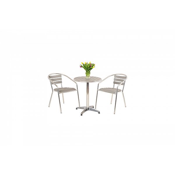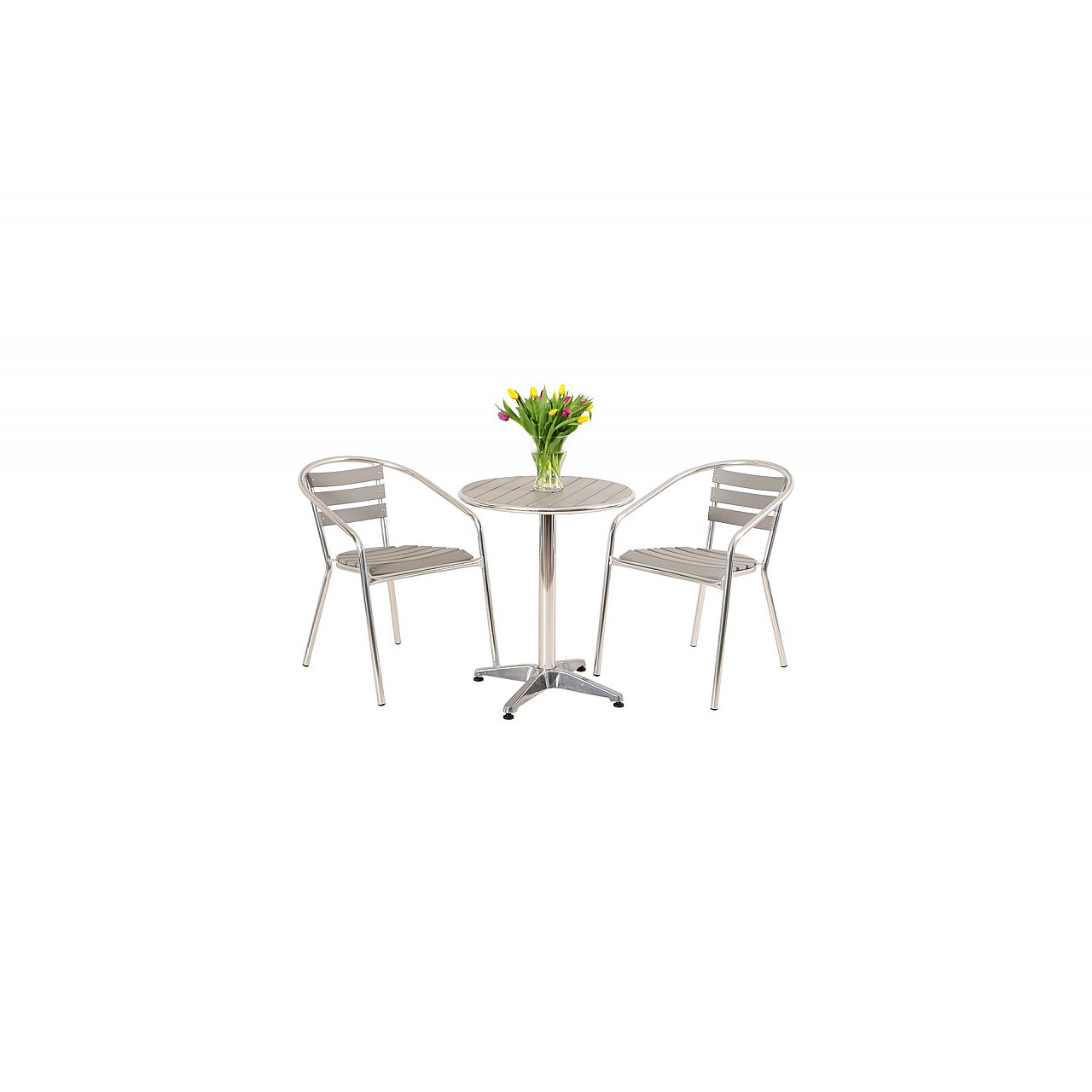Алюмінієвий комплект меблів Summer Pollywood складається з двох стільців і столу. Конструкція меблів виготовлена з алюмінію, а стільниця, сидіння та спинки стільців виготовлені з високоякісної штучної деревини Полівуд. Практичний, простий у догляді та стійкий до погодних умов набір ідеально підходить для ресторанів, кафе, кондитерських, а також для саду, тераси чи балкона. Основа столу має чотири регульовані ніжки, завдяки яким можна вирівняти стільницю на нерівній поверхні. Стільці можна вільно складати, що економить місце при транспортуванні та зберіганні меблів.