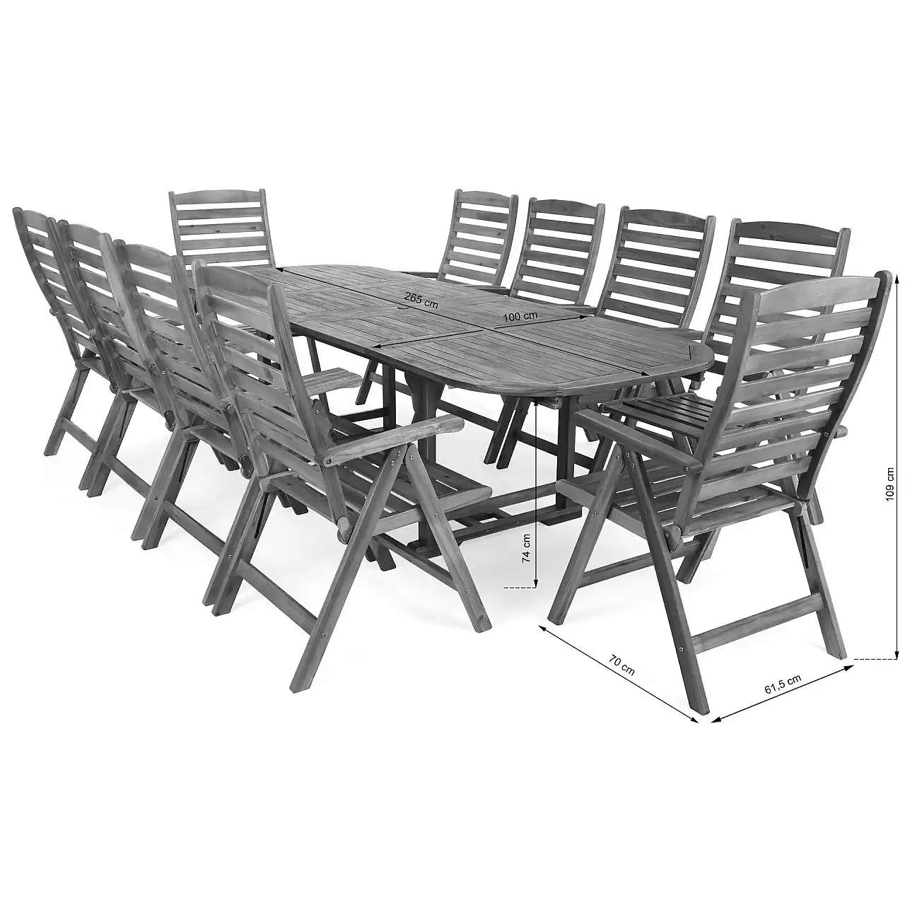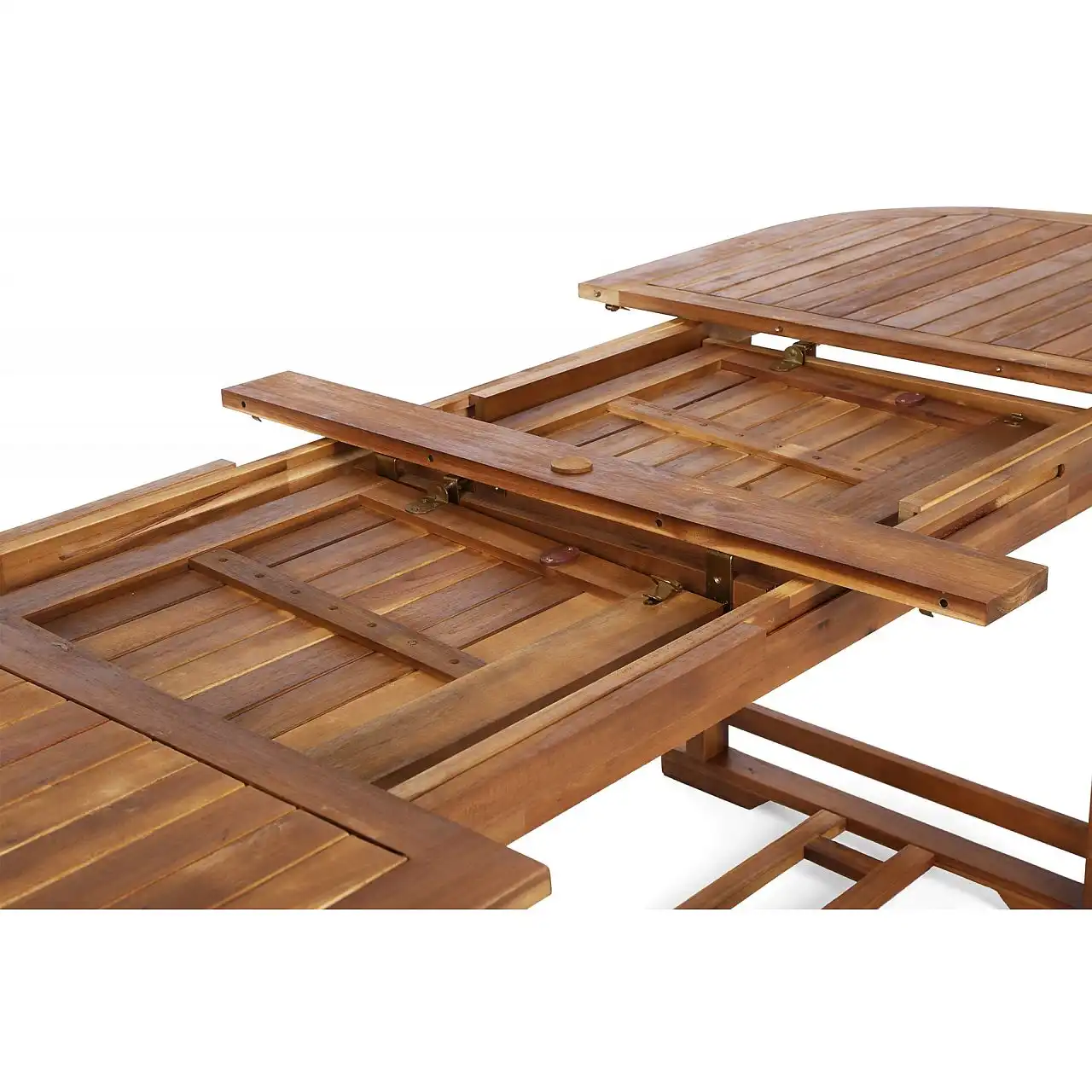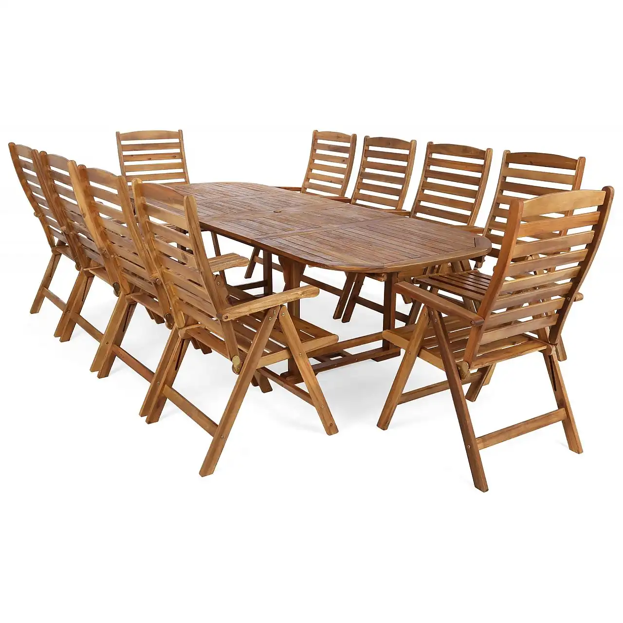 Дерев'яний стіл з комплекту Acacia Oval можна розкласти до різної ширини – 165 см, 215 см, 265 см. Крім того, посередині є отвір для парасольки, яка забезпечить приємну тінь у спекотні дні.