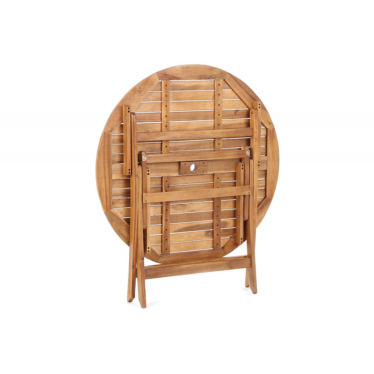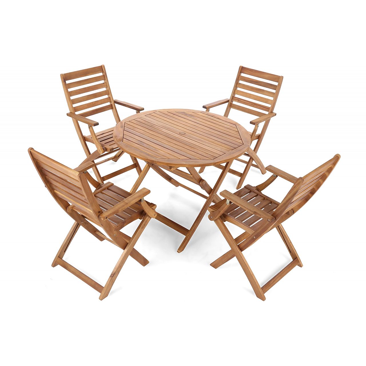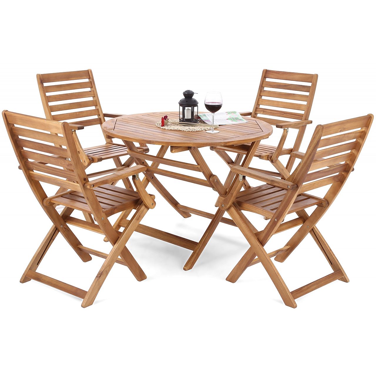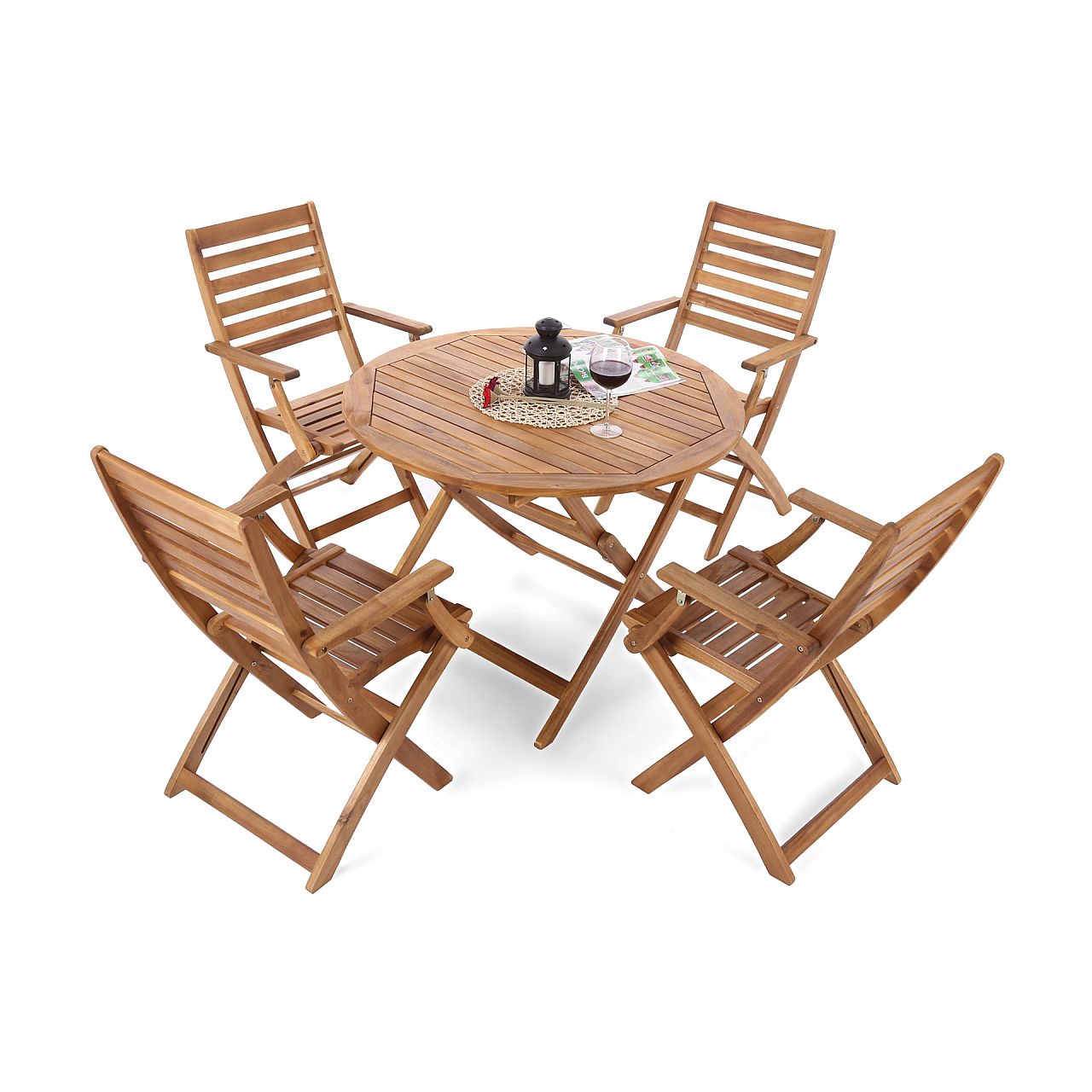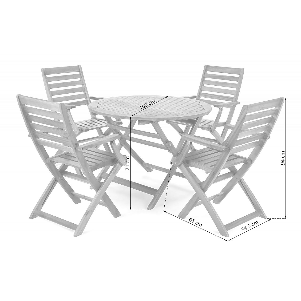 Дерев'яні садові меблі Acacia Round Cross - це комплект меблів для 4 осіб, що складається з круглого столу та 4 стільців . Вони виготовлені з деревини акації - надзвичайно твердої та стійкої до різноманітних погодних умов: якщо правильно захистити , їх можна використовувати багато років . Простий дизайн збагачений схрещеними ніжками окремих елементів, додатково профільованих у формі витончених арок. Стільниця діаметром 100 см має в центрі отвір для садової парасольки . Крісла дуже зручні, оснащені підлокітниками. І стіл, і стільці складані - тому їх легко зберігати поза сезоном.