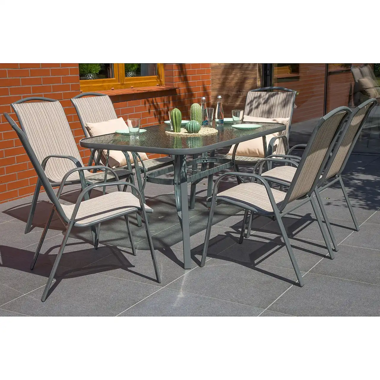 Меблі, які ми пропонуємо, виготовлені зі сталі та тканини Texteline. Це робить їх міцними та міцними, і в той же час дуже легкими та зручними. Сталеві профілі пофарбовані порошковою фарбою, стійкою до стирання та пошкоджень, завдяки чому комплект надовго збереже свій привабливий зовнішній вигляд. У комплект входить стіл зі стільницею із загартованого скла та шість стільців зі спинками. Крім металевих комплектів меблів, в нашій пропозиції також є зручні садові крісла.