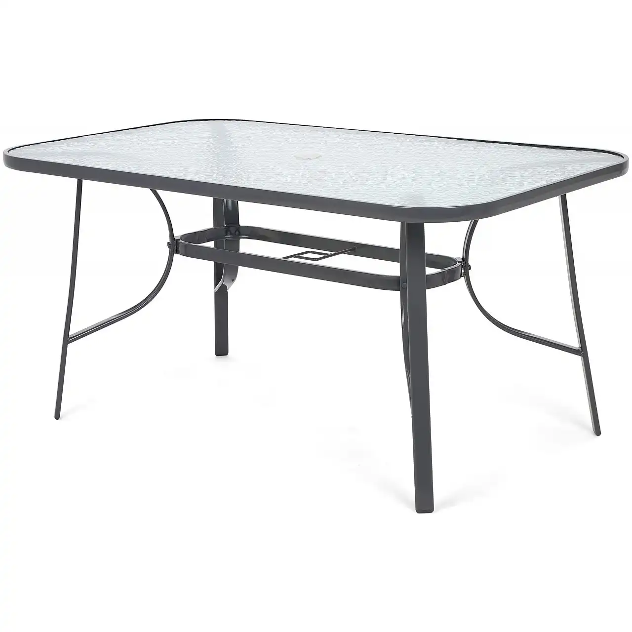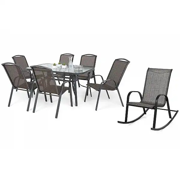 Меблі, які ми пропонуємо, виготовлені зі сталі та тканини Texteline. Це робить їх міцними та міцними, і в той же час дуже легкими та зручними. Сталеві профілі пофарбовані порошковою фарбою, стійкою до стирання та пошкоджень, завдяки чому комплект надовго збереже свій привабливий зовнішній вигляд. У комплект входить стіл зі стільницею із загартованого скла та шість стільців зі спинками. Окрім металевих комплектів меблів, у нашій пропозиції також є зручні садові крісла.