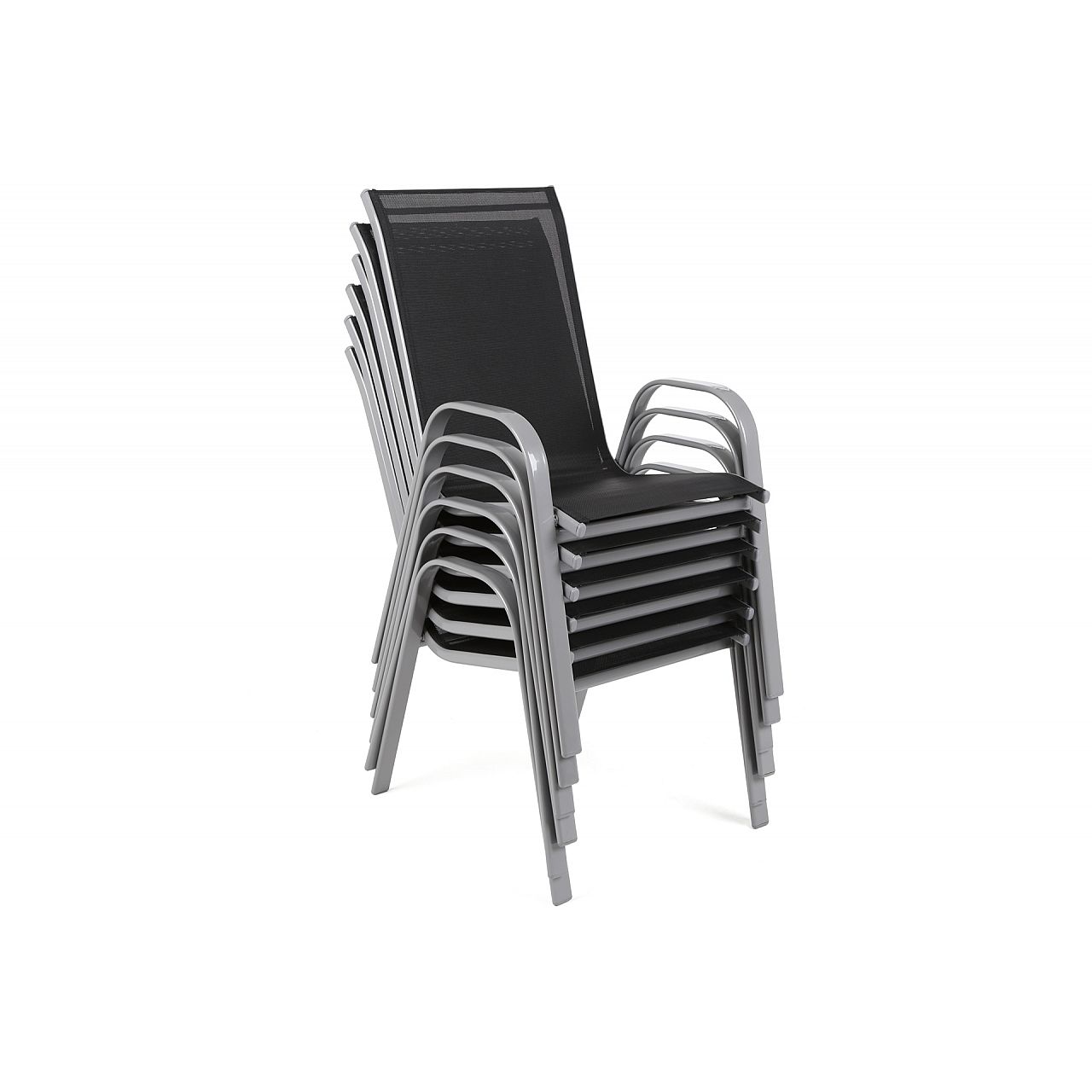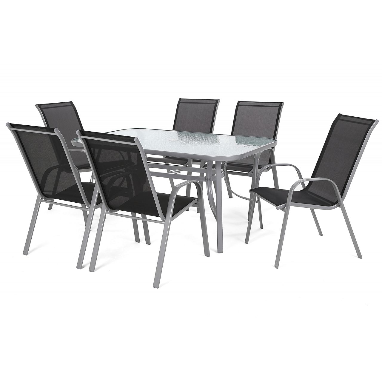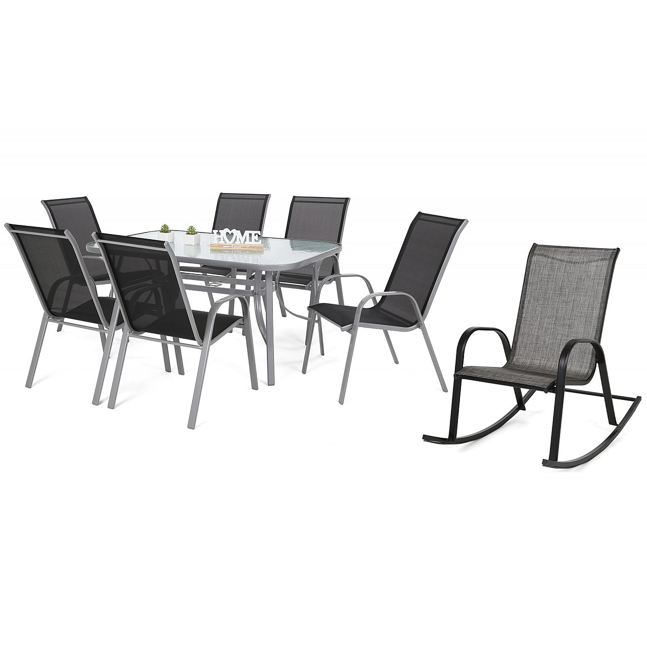 Набір Sevilla являє собою великий металевий стіл із закругленими кутами та посиленим дном, оснащений стільницею із загартованого скла та отвором для встановлення садової парасольки. Крім того, є 6 надзвичайно зручних і міцних стільців, які забезпечать комфорт сидіння та свободу пересування та переміщення їх куди завгодно.