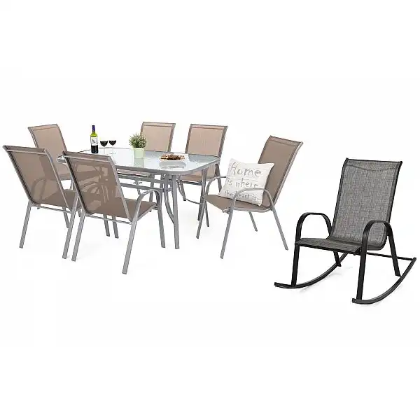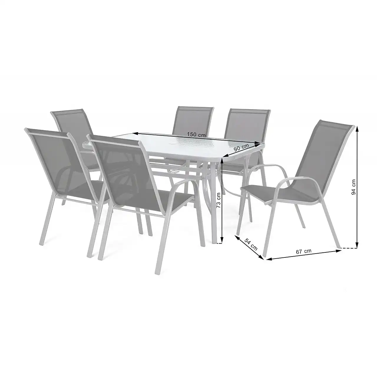 Набір Sevilla являє собою великий металевий стіл із закругленими кутами та посиленим дном, оснащений стільницею із загартованого скла та отвором для встановлення садової парасольки. Крім того, є 6 надзвичайно зручних і міцних стільців, які забезпечать комфорт сидіння та свободу пересування та переміщення їх куди завгодно.