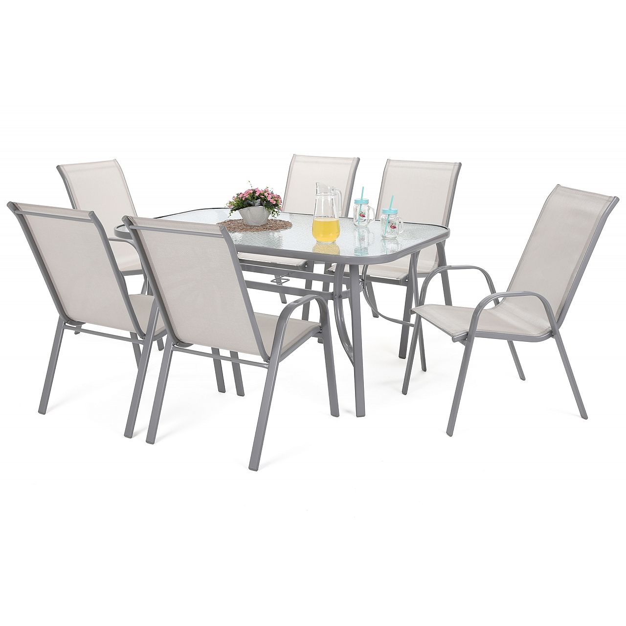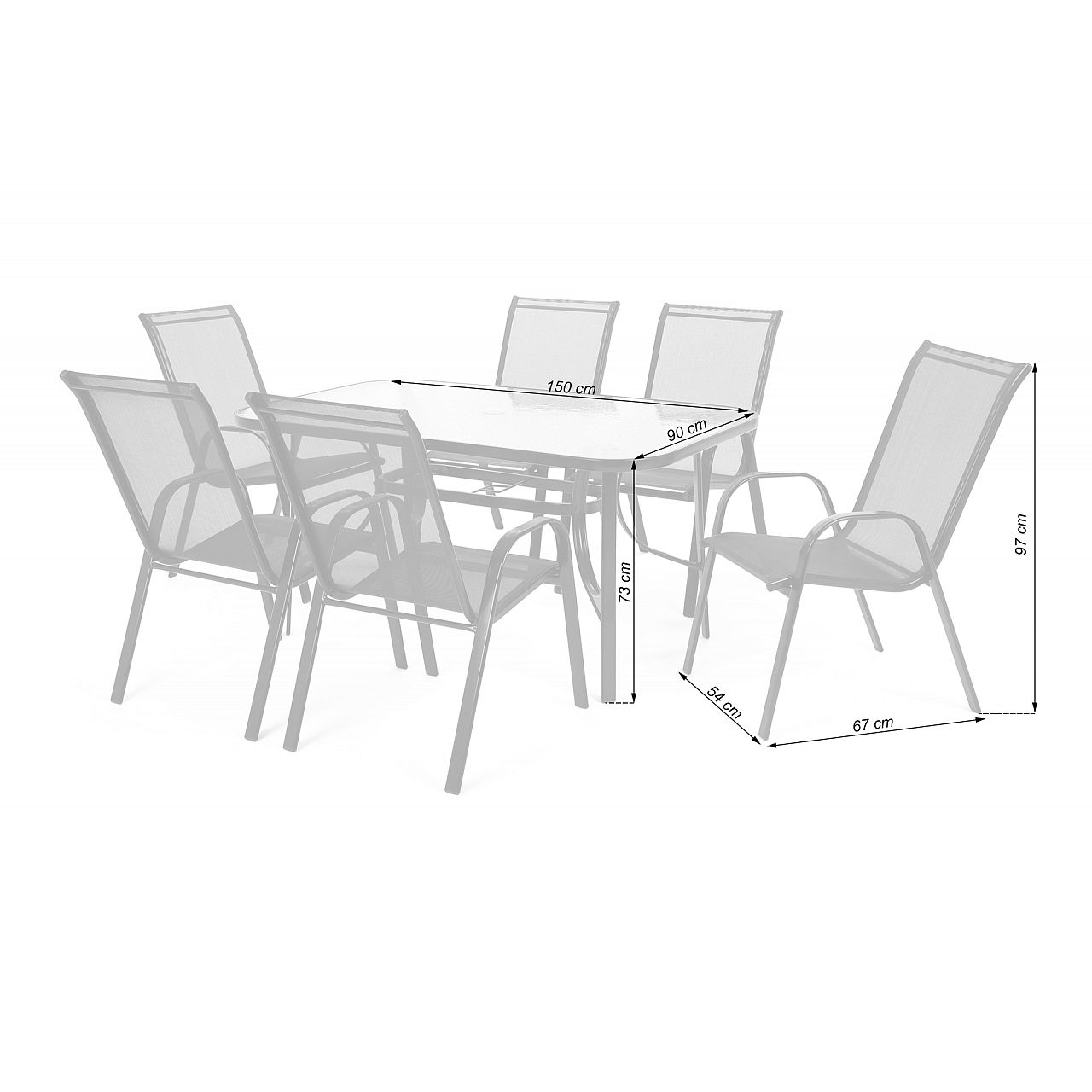 Набір Sevilla являє собою великий металевий стіл із закругленими кутами та посиленим дном, оснащений стільницею із загартованого скла та отвором для встановлення садової парасольки. Крім того, є 6 надзвичайно зручних і міцних стільців, які забезпечать комфорт сидіння та свободу пересування та переміщення їх куди завгодно.