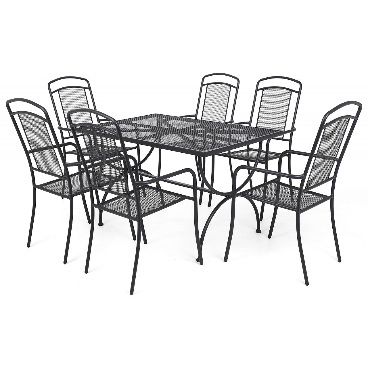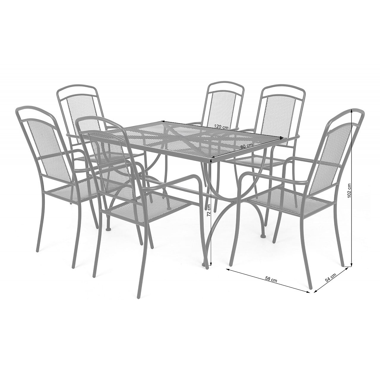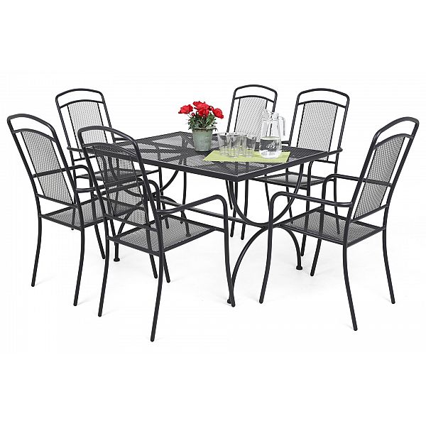 Комплект садових меблів Venezia - це дуже елегантний і міцний набір сталевих меблів, пофарбованих високоякісною порошковою фарбою. Конструкція стільців і столу дуже міцна і стійка до погодних умов. Міцна сталева сітка, яка гарно інтегрована в стільницю столу та стільця, надає меблям унікальний характер. Меблевий гарнітур буде ідеально виглядати в будь-якому саду або на терасі.