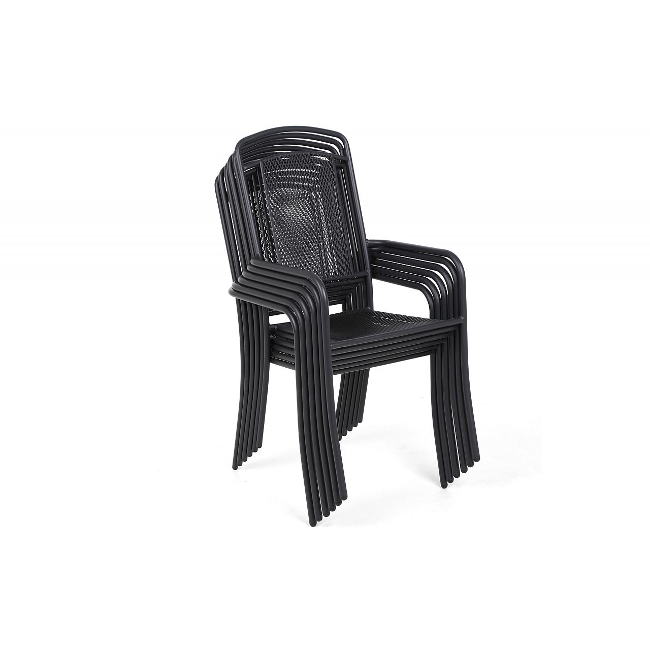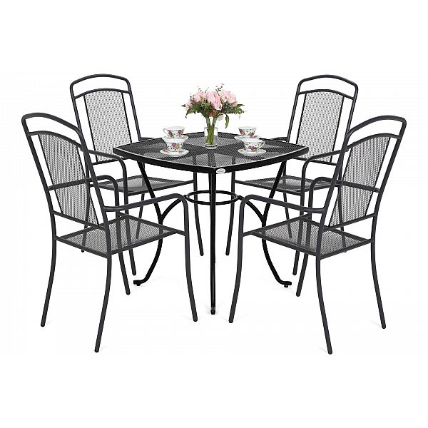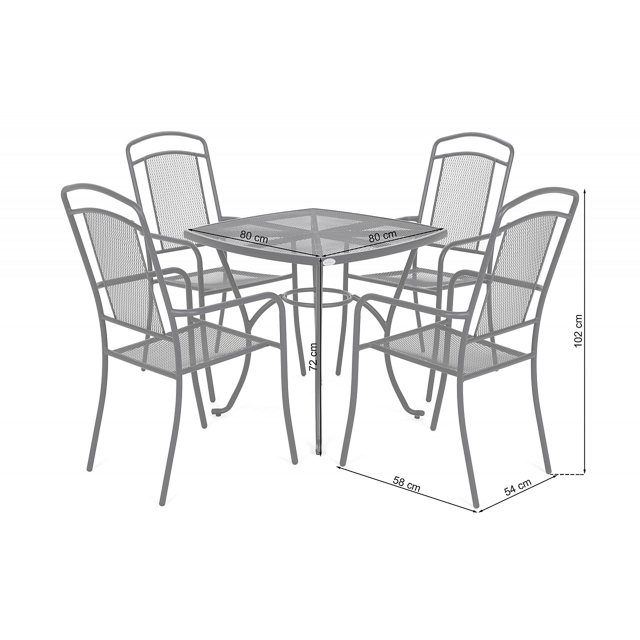 Комплект садових меблів Venezia - це дуже елегантний і міцний набір сталевих меблів, пофарбованих високоякісною порошковою фарбою. Конструкція стільців і столу дуже міцна і стійка до погодних умов. Міцна сталева сітка, яка гарно інтегрована в стільницю столу та стільця, надає меблям унікальний характер. Меблевий гарнітур буде ідеально виглядати в будь-якому саду або на терасі.